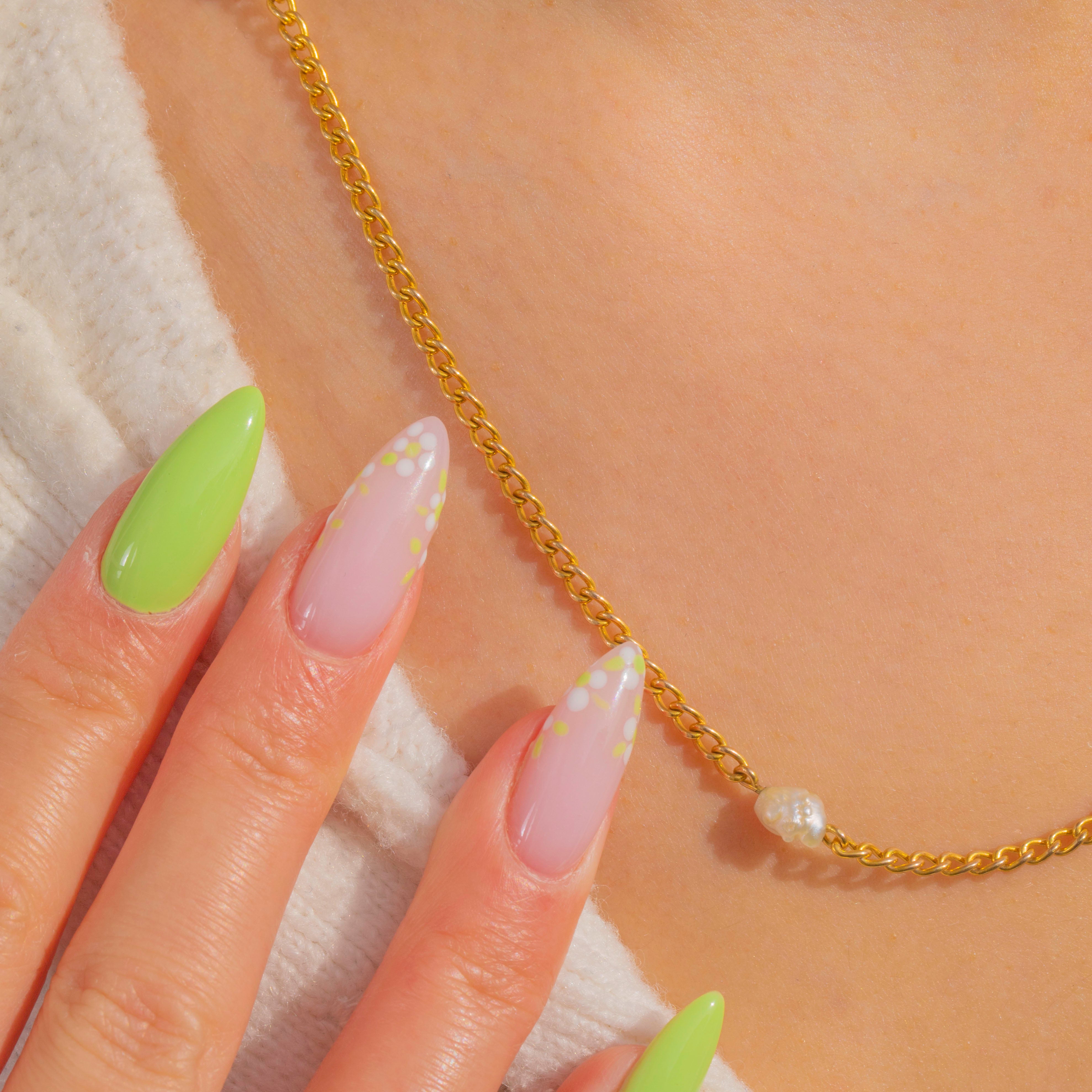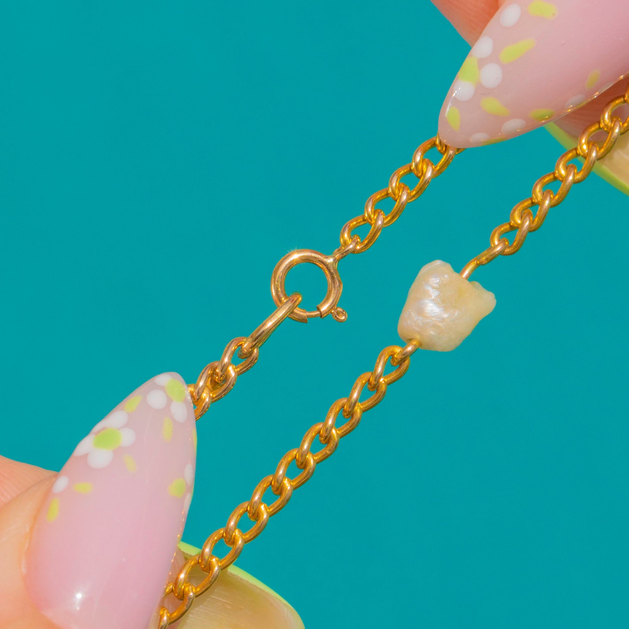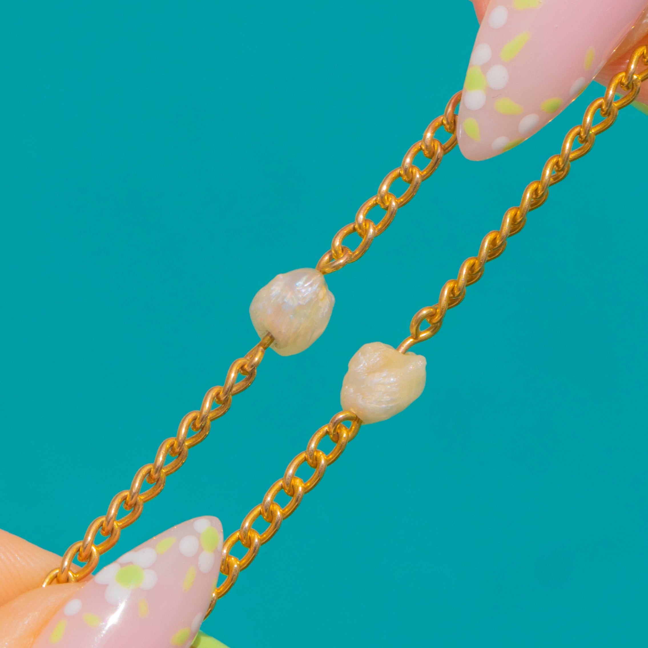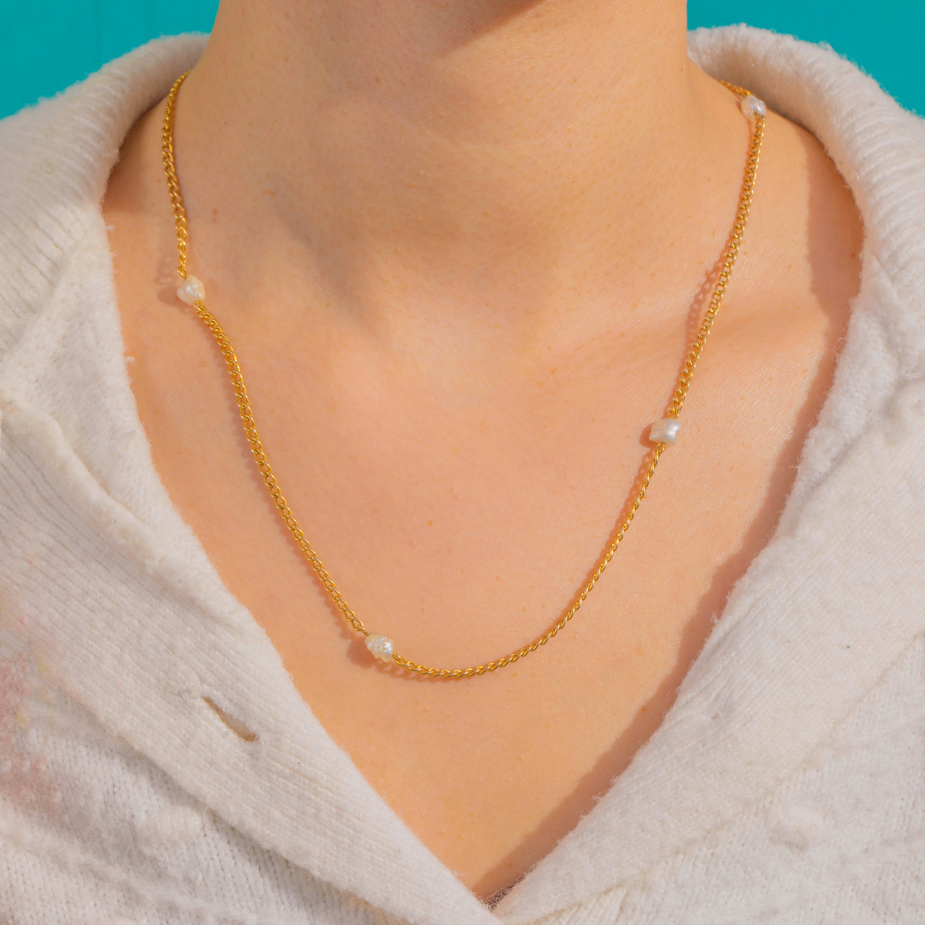 Refined and effortlessly elegant, this Victorian Baroque Pearl station chain is crafted in glowing 14ct Gold. Irregular, organic Pearls punctuate the fine curb chain with soft lustre and subtle texture, creating a beautifully balanced play of light and negative space.