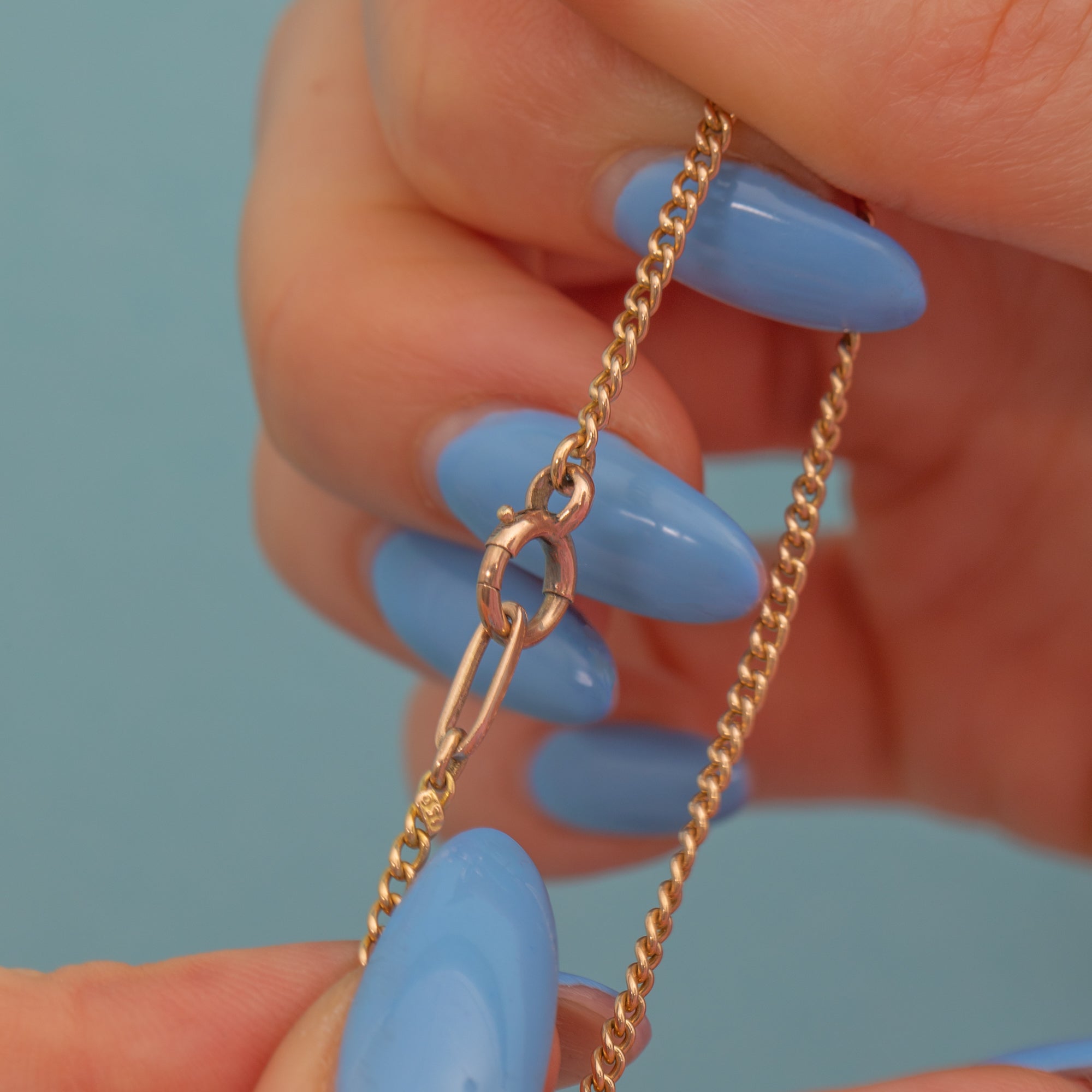 This 18" antique 15ct Gold skinny curb chain is a must-have within your jewellery box! Her skinny curb links, crafted from buttery 15ct Gold, comes complete with a large bolt-ring allow your favourite pendant to affixed with ease, and at 18" long, it will rest centrally across your décolletage.
