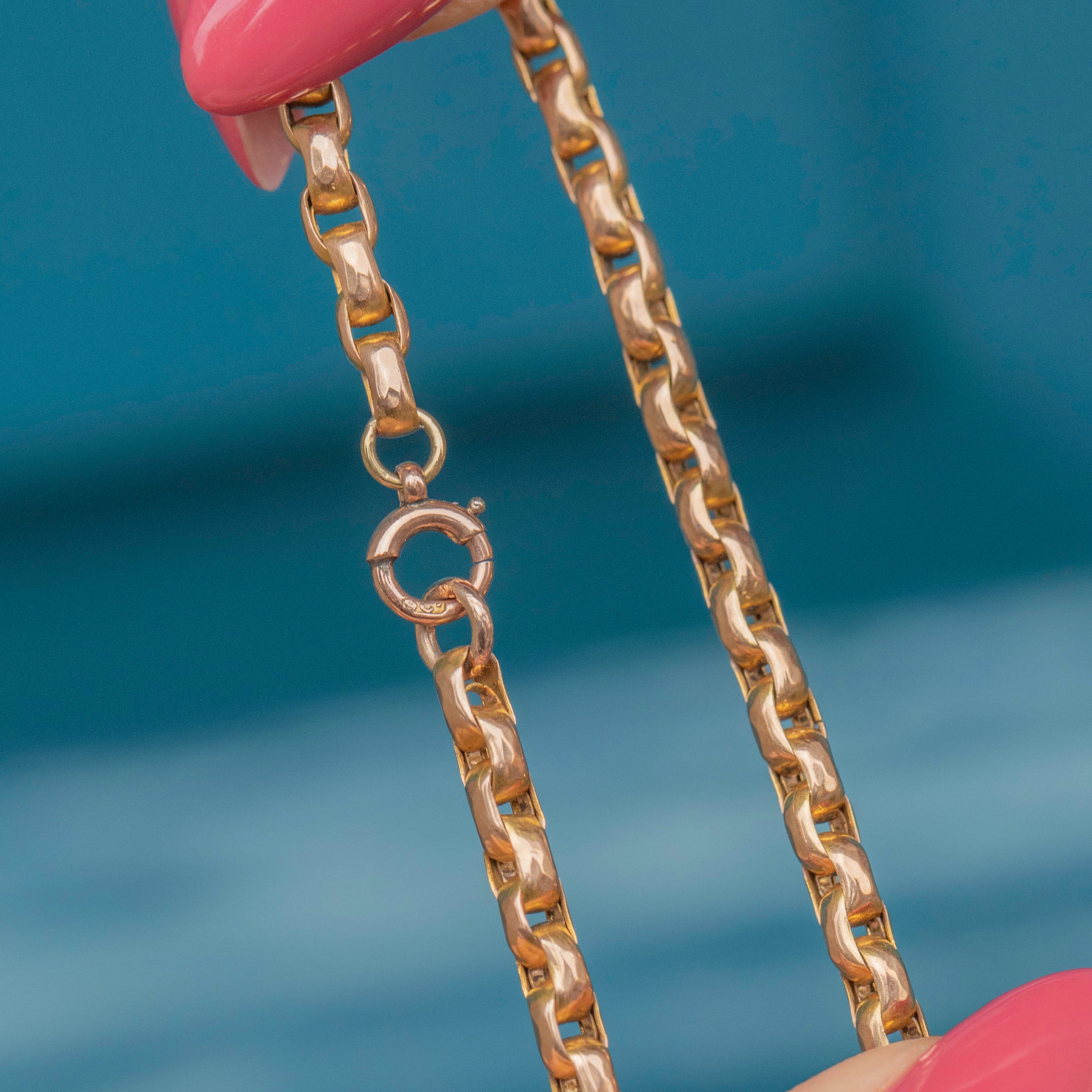 VERY GOOD-EXCELLENT. A characterful 18" antique 9ct Gold ball and tether belcher chain in wonderful condition. Her links are all well-connected and intact, and the bolt ring fastens firmly shut, so you can wear her with confidence. Whilst there is some light wear to the ball and tether details, this is very subtle! All in all, she is a gorgeous chain to complete your collection.