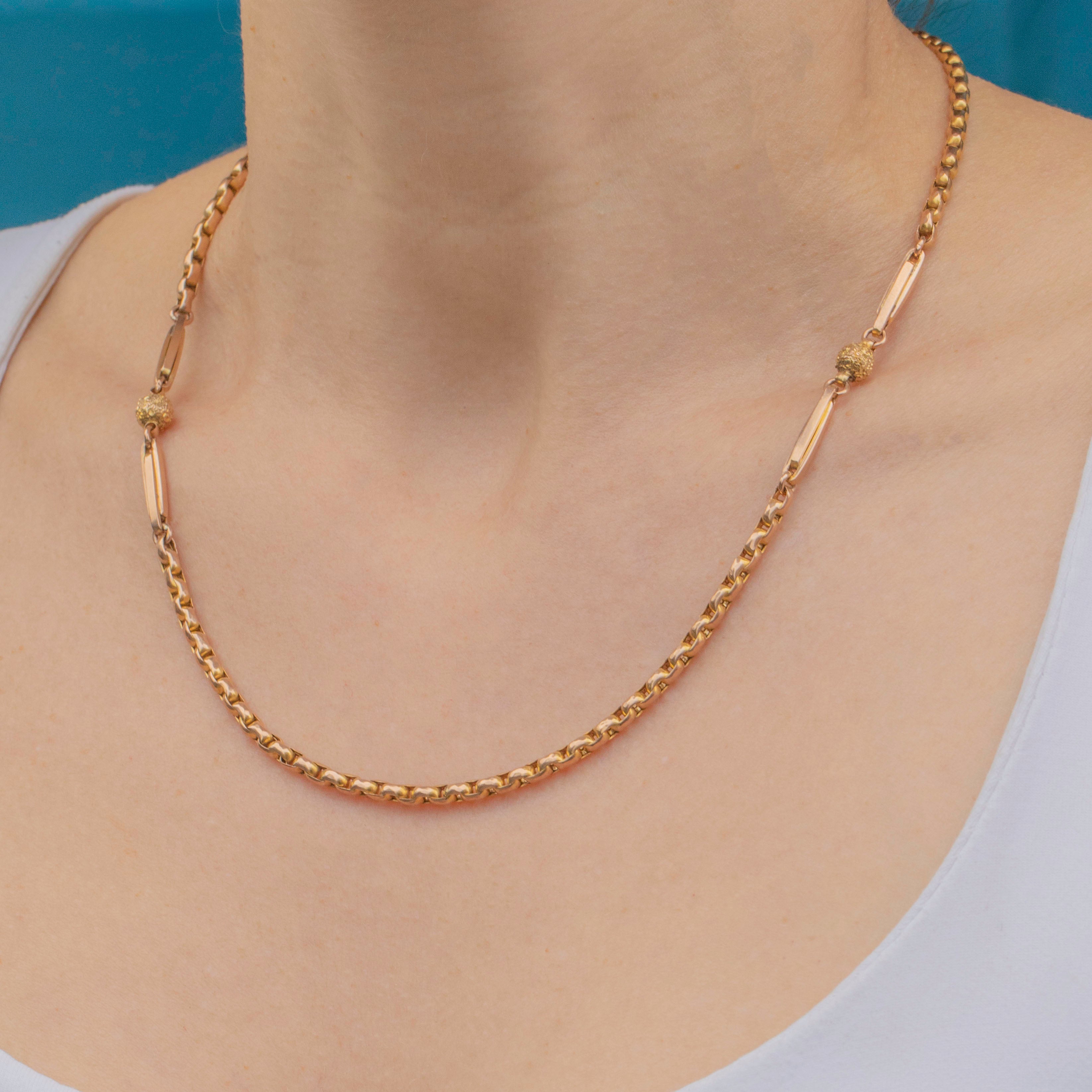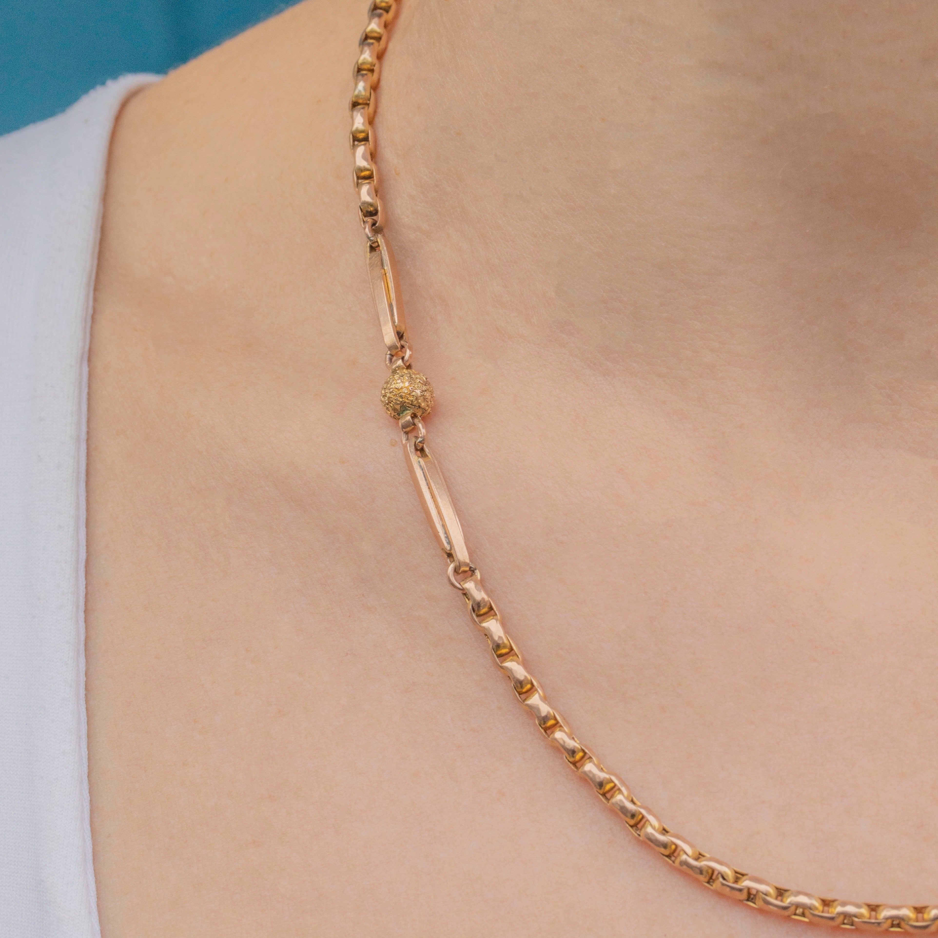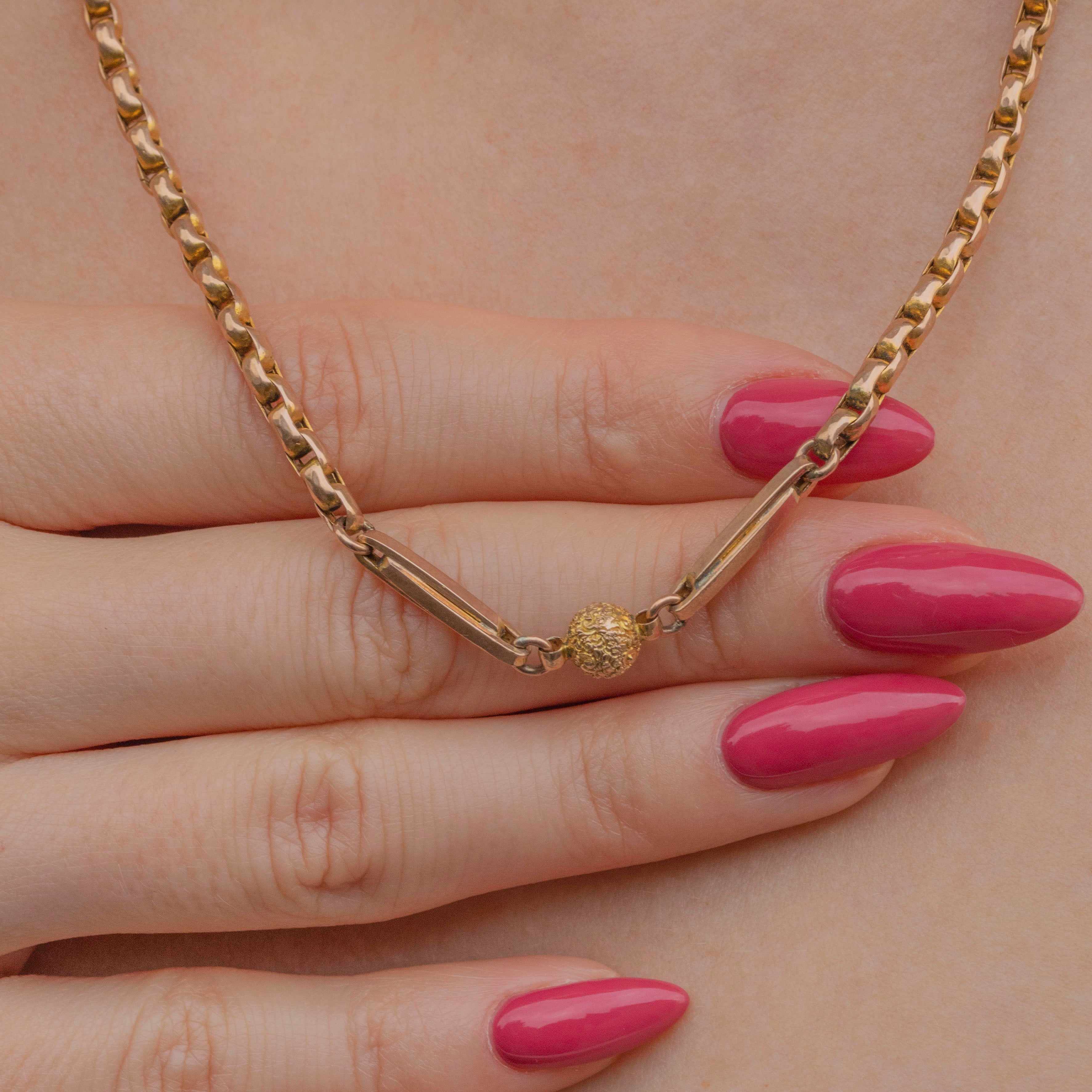 Let this 18" antique 9ct Gold ball and tether belcher chain do all the talking! With oodles of Victorian charm, this antique Gold chain is crafted from sun-kissed 9ct Gold forming slinky belcher links with ball and tether detailing.