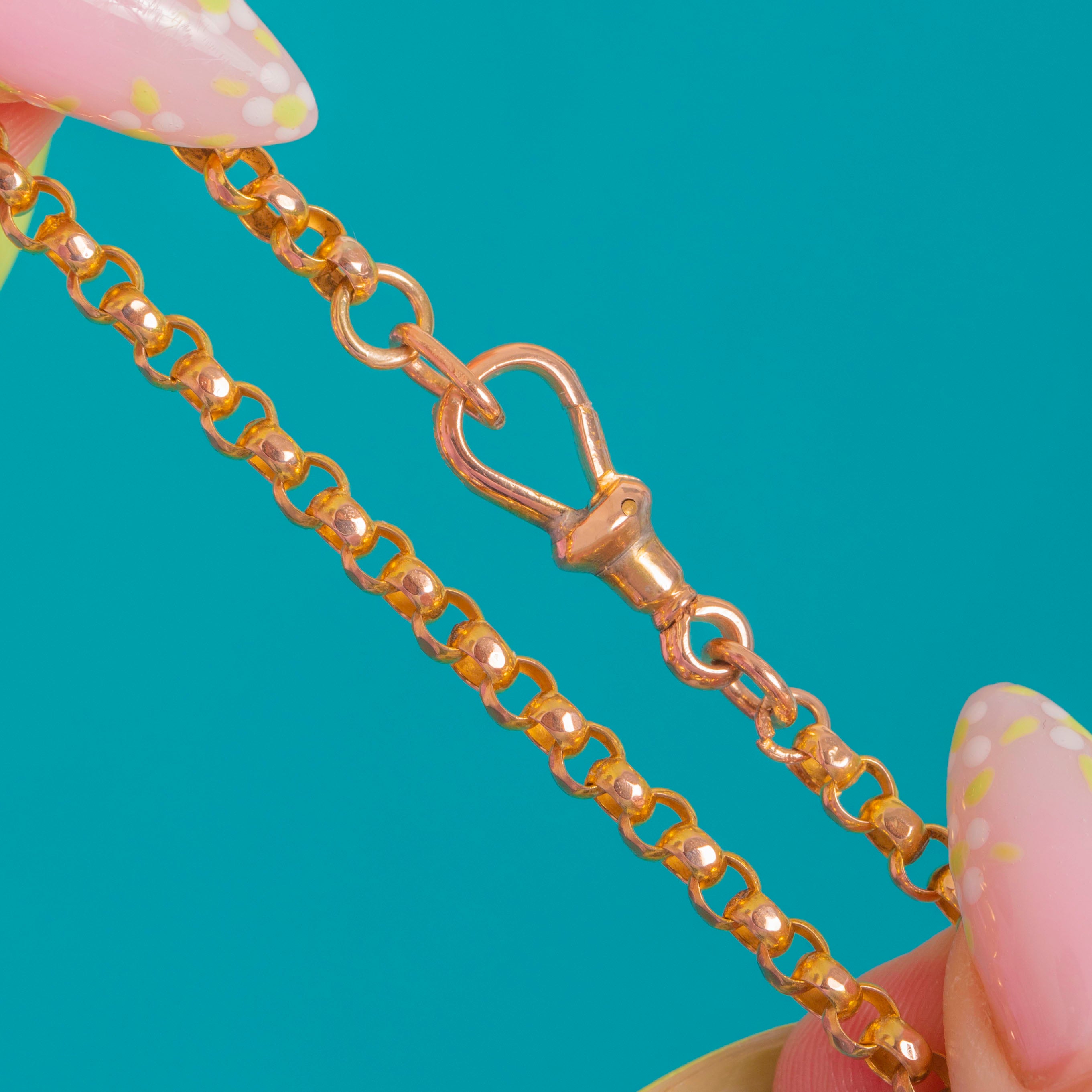A timeless Victorian 9ct Gold Belcher chain, finished with a classic dog clip clasp. The rounded Belcher links have a clean, polished look that drapes beautifully, offering effortless elegance with a subtle utilitarian edge. Wear it alone for a refined glow or use the dog clip to showcase a favourite pendant, fob, or charm.