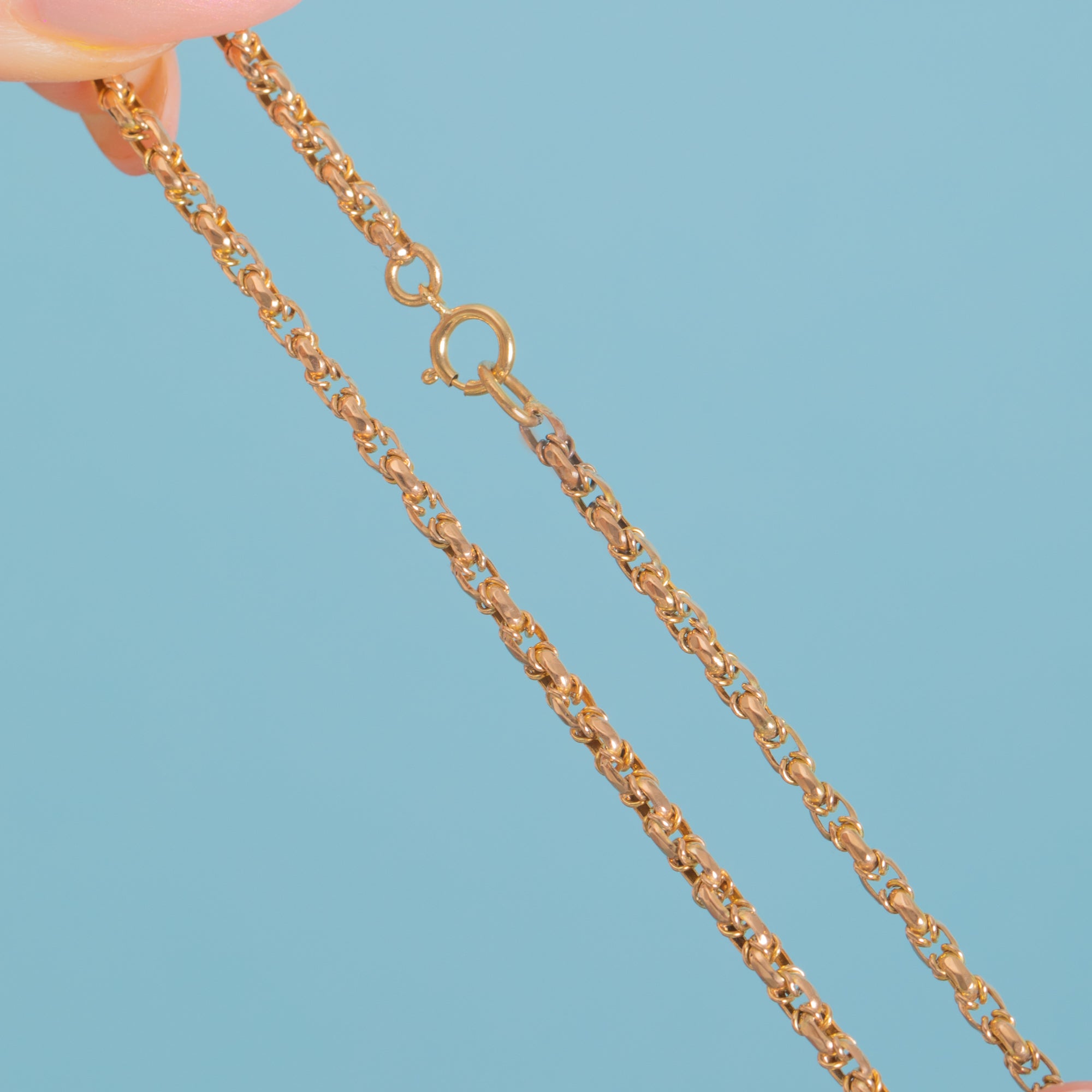 EXCELLENT. This 18" antique 9ct Gold fancy link chain is in excellent condition. Each link is uniform and secure, and her bolt ring is in great working order. With little signs of wear, she will bring you years of wear and enjoyment!