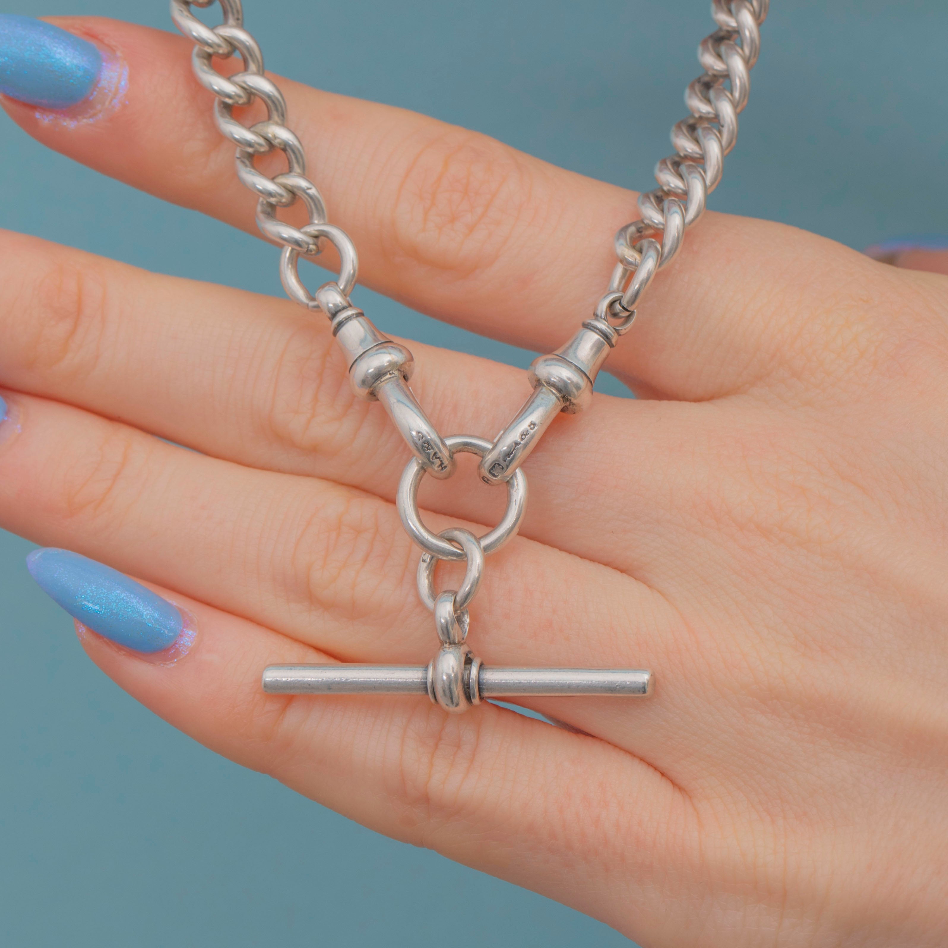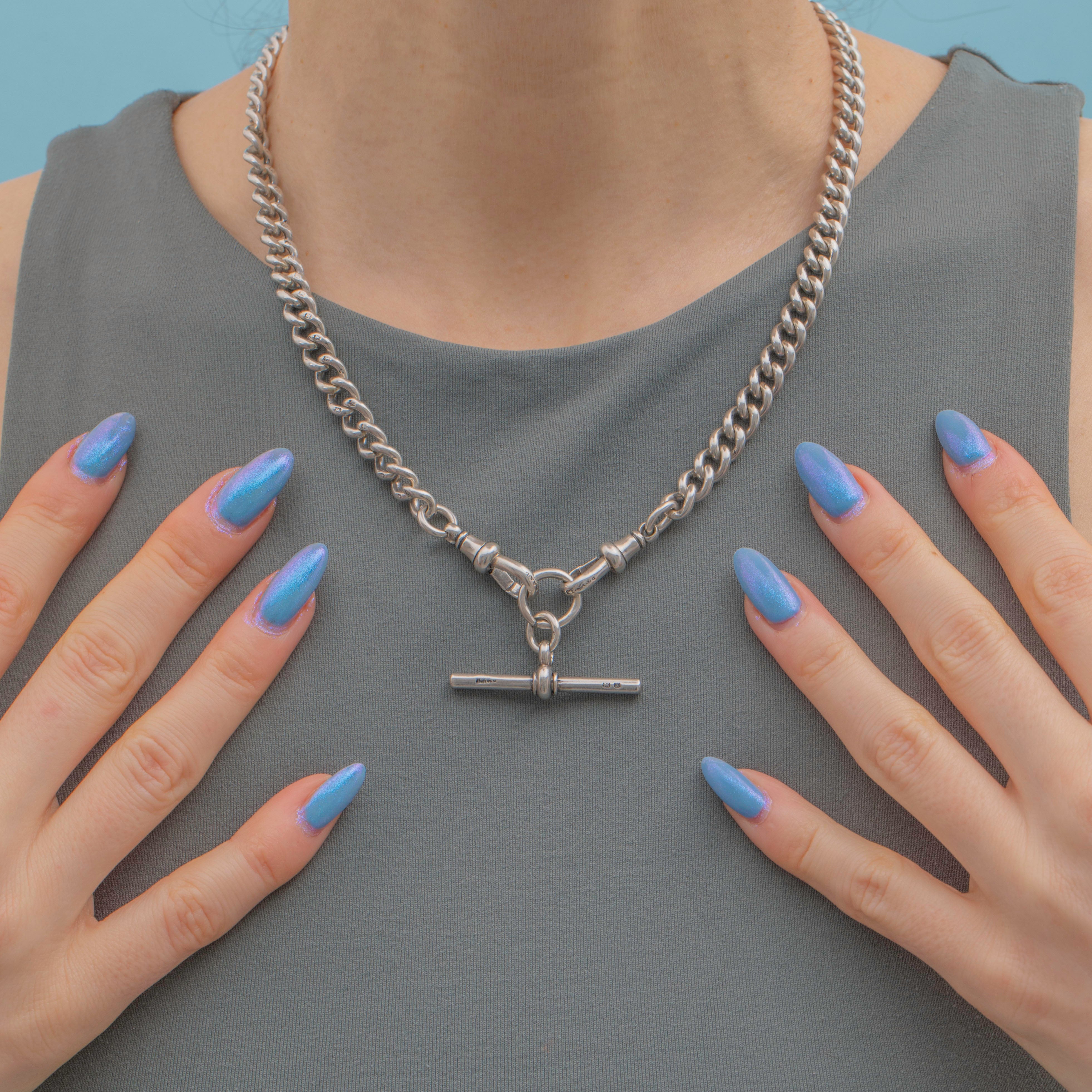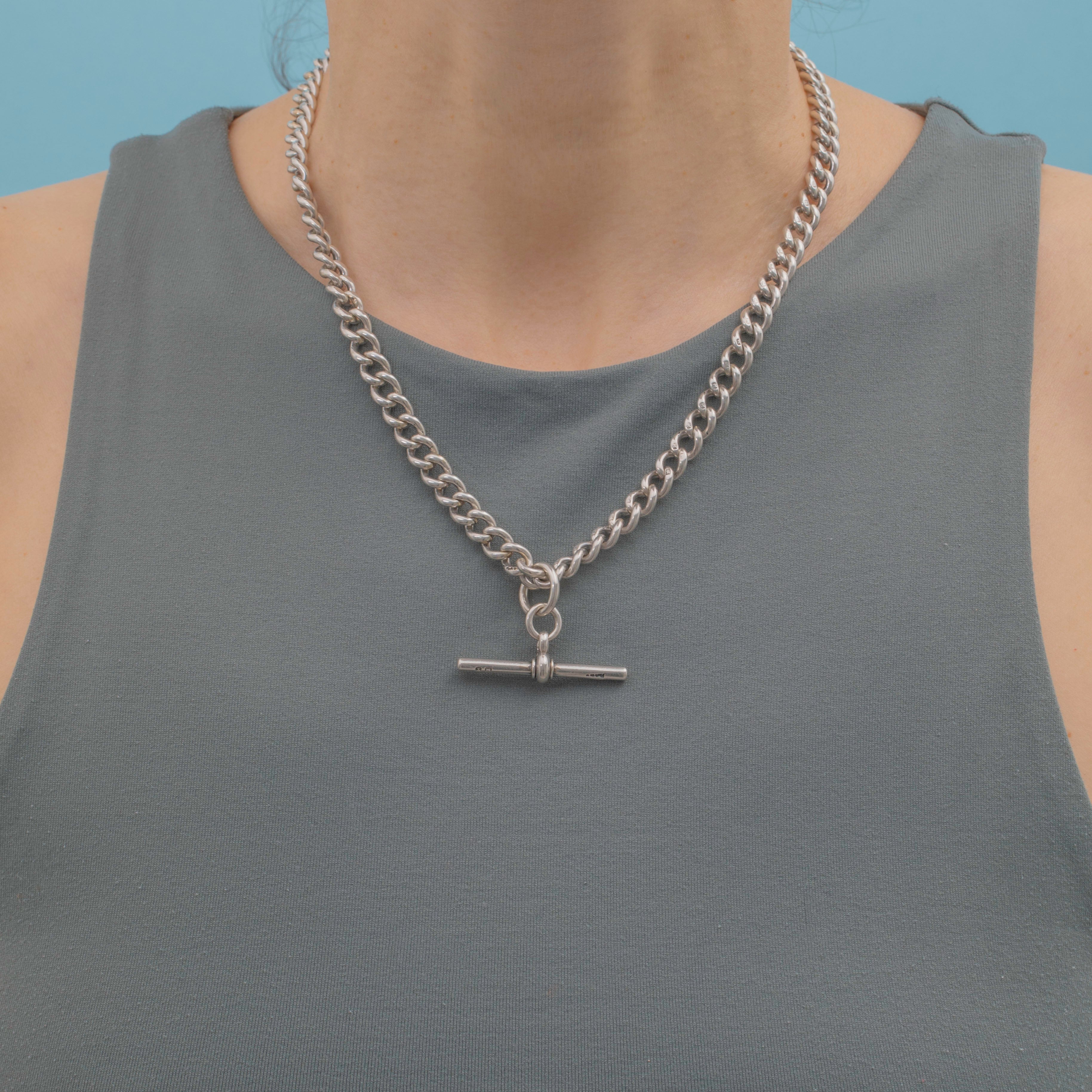 Each link on this Victorian Silver curb chain is stamped with a Lion Passant, and the T-bar and dog clips are all perfectly matched! Chunky, versatile and lustrous, she is a great piece to complete your look day-in-day-out!