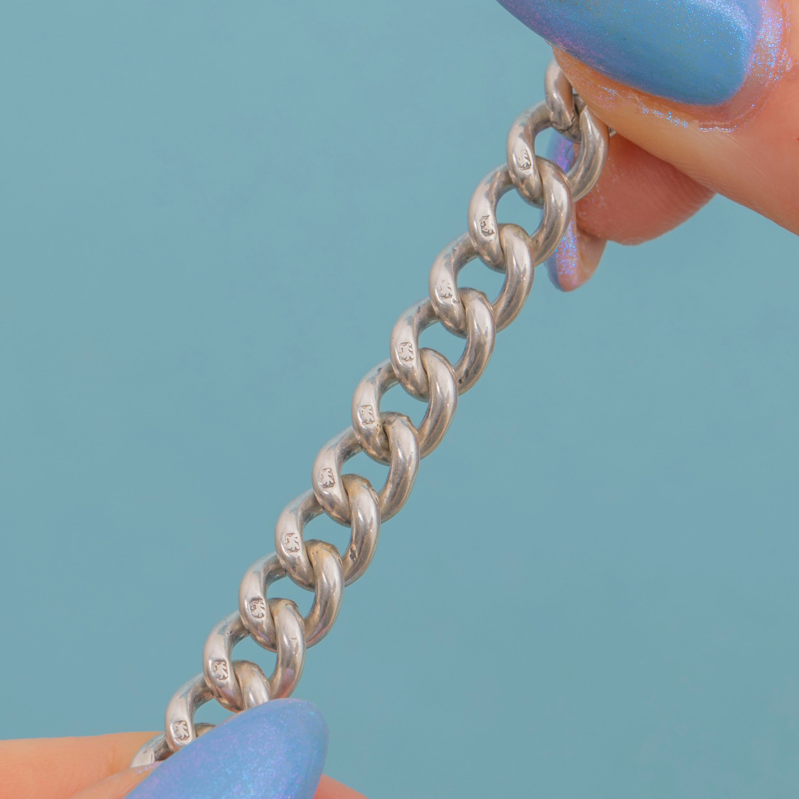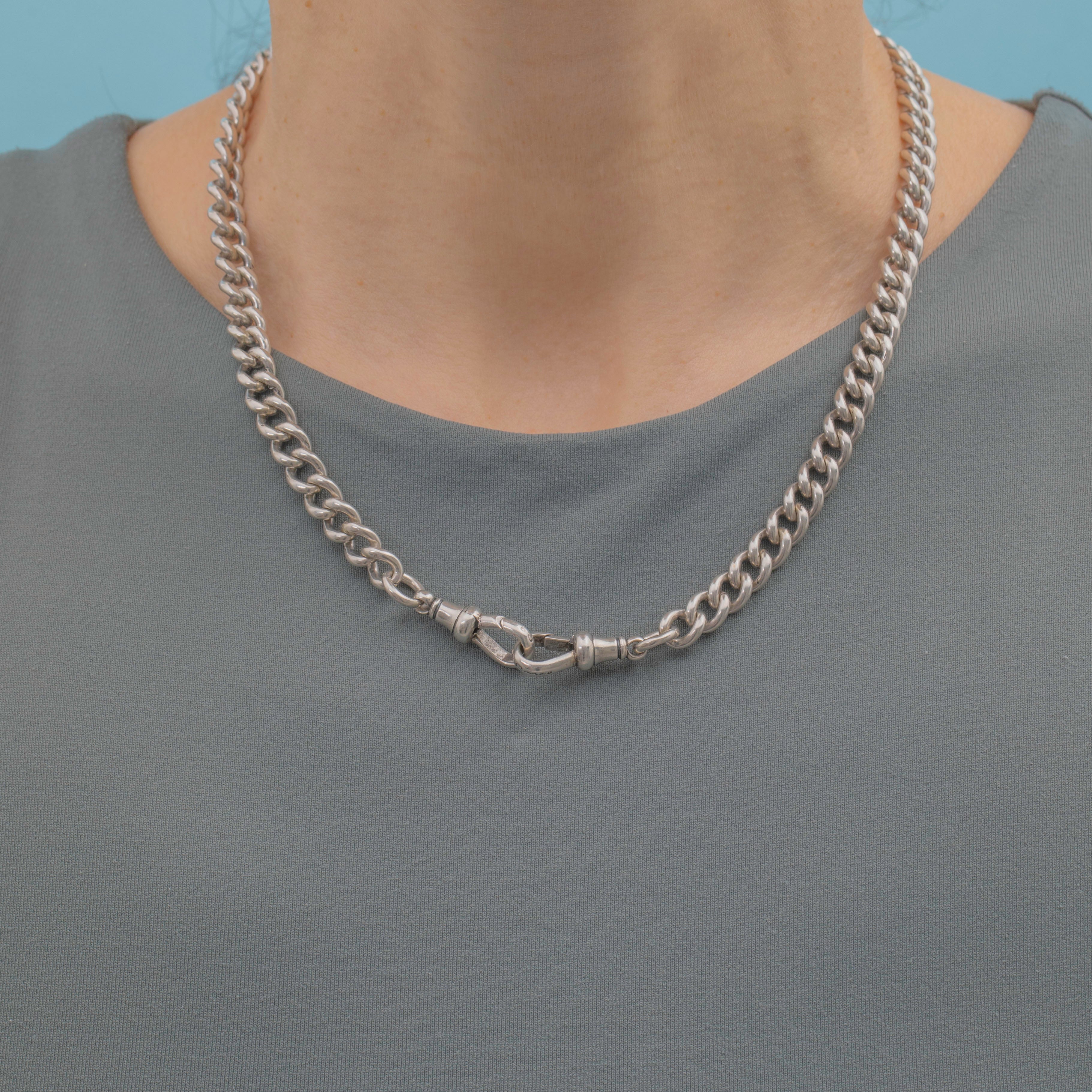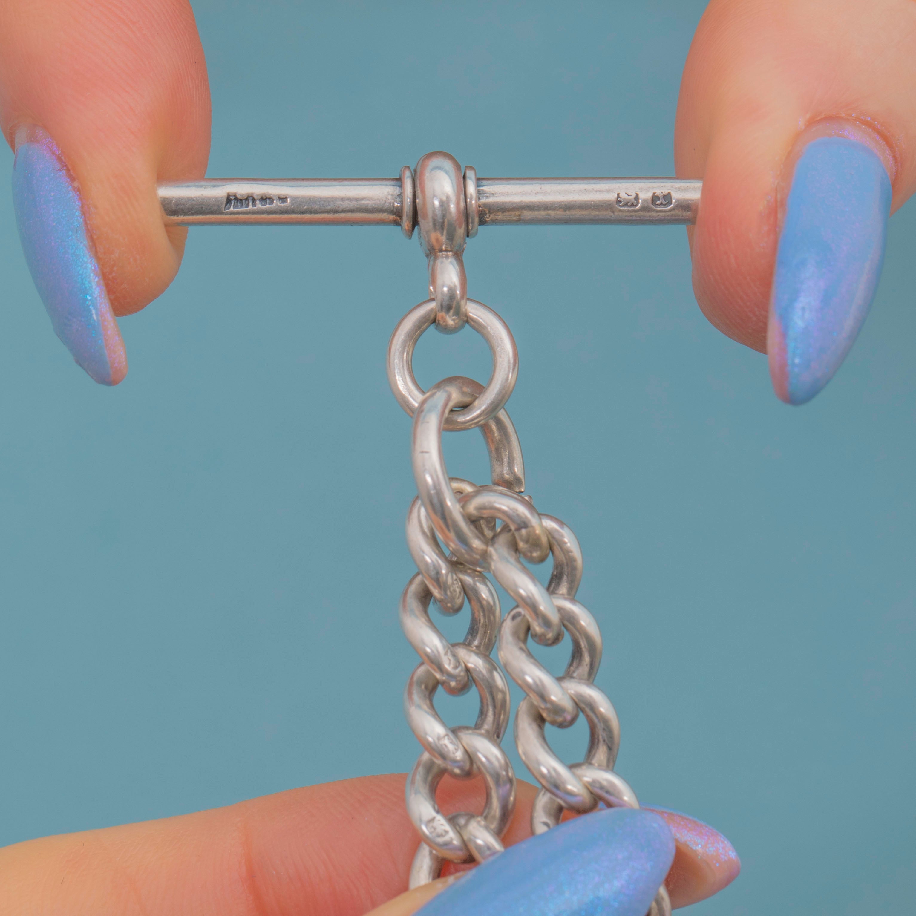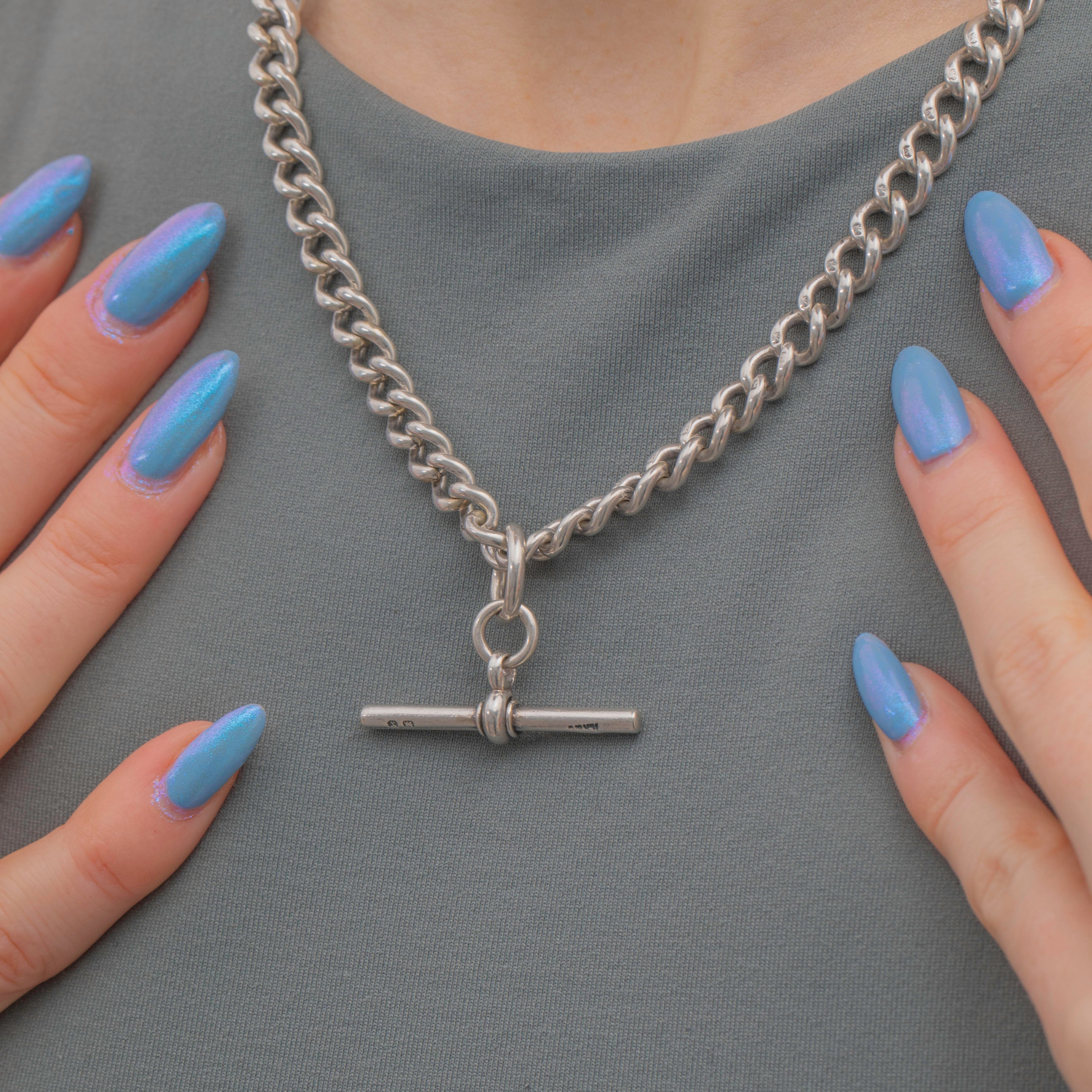 Each link on this Victorian Silver curb chain is stamped with a Lion Passant, and the T-bar and dog clips are all perfectly matched! Chunky, versatile and lustrous, she is a great piece to complete your look day-in-day-out!