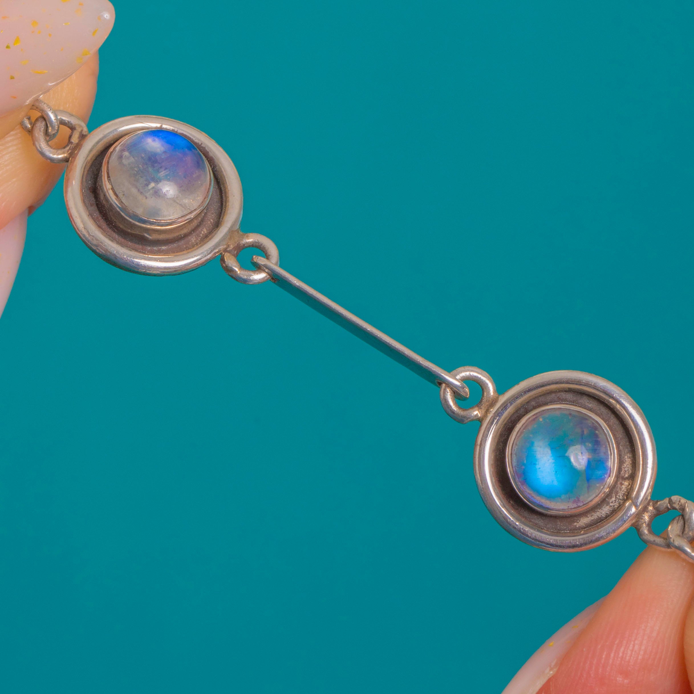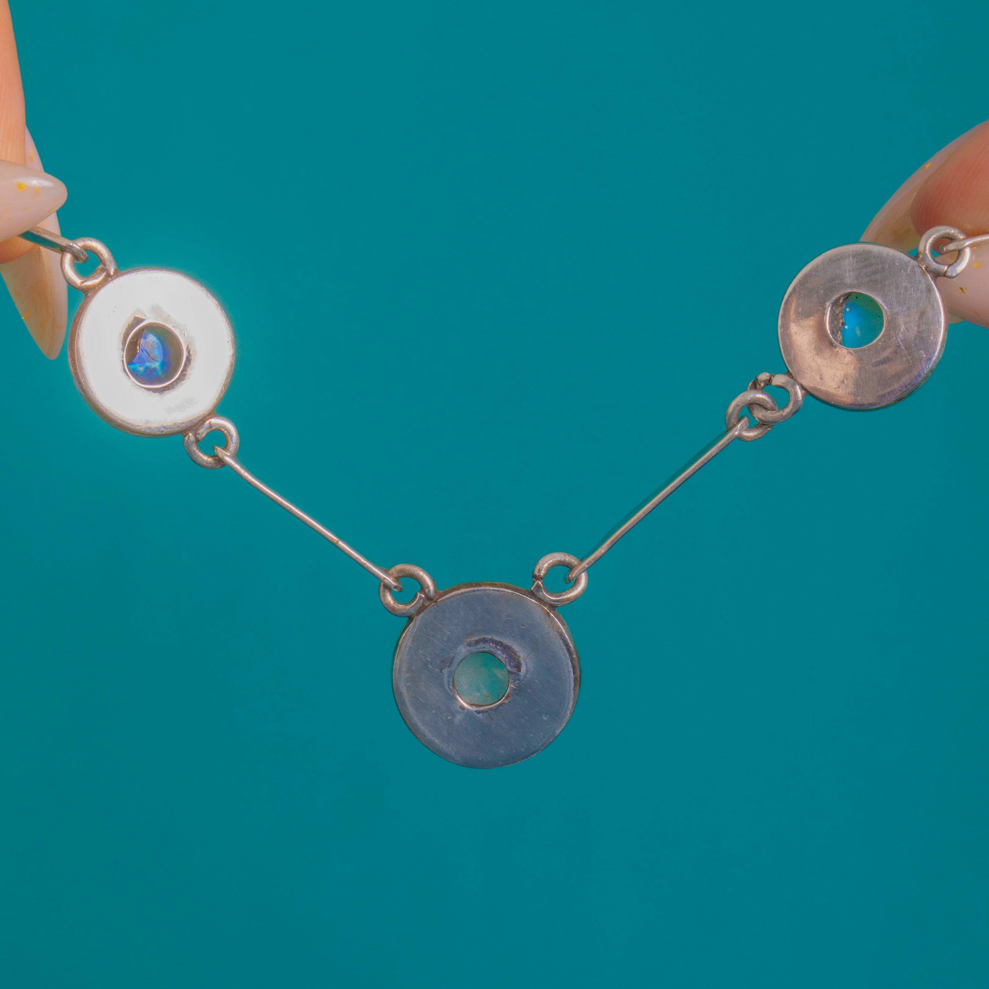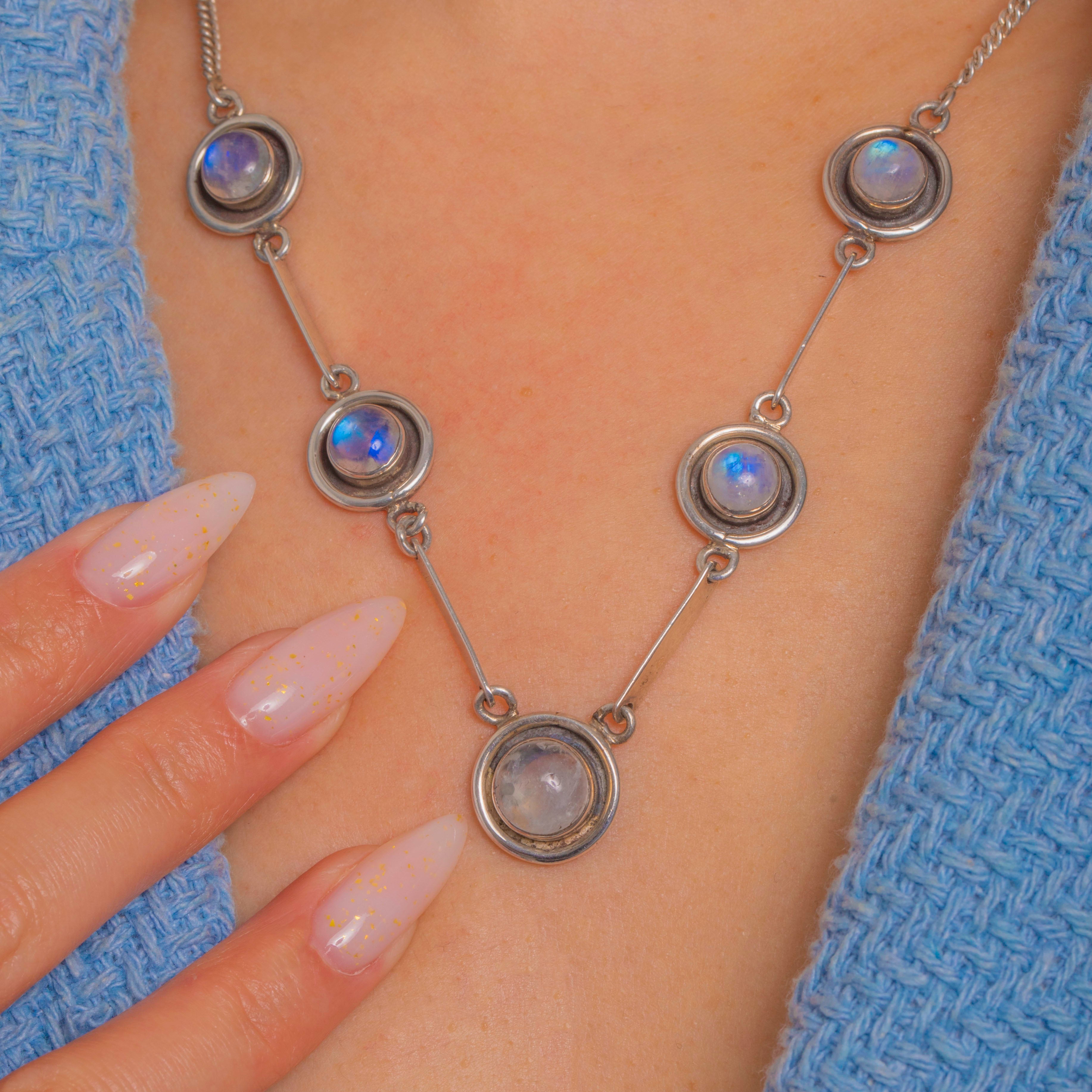 A sleek Art Deco station necklace alive with blue-flashed Moonstone cabochons, this piece balances minimalism with quiet drama. Five round Moonstones glow within concentric circular “target” mounts, their luminous sheen amplified by softly oxidised Silver that lends depth and definition.