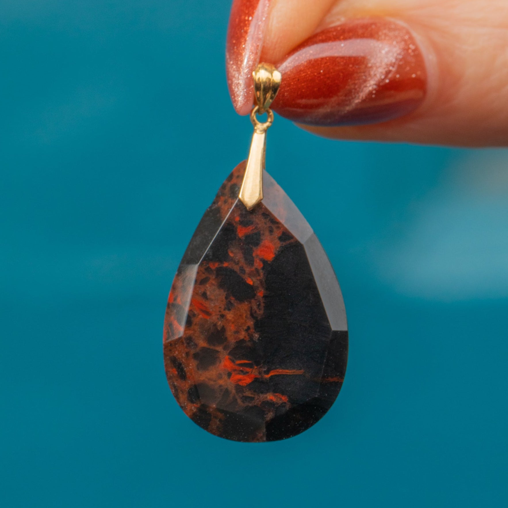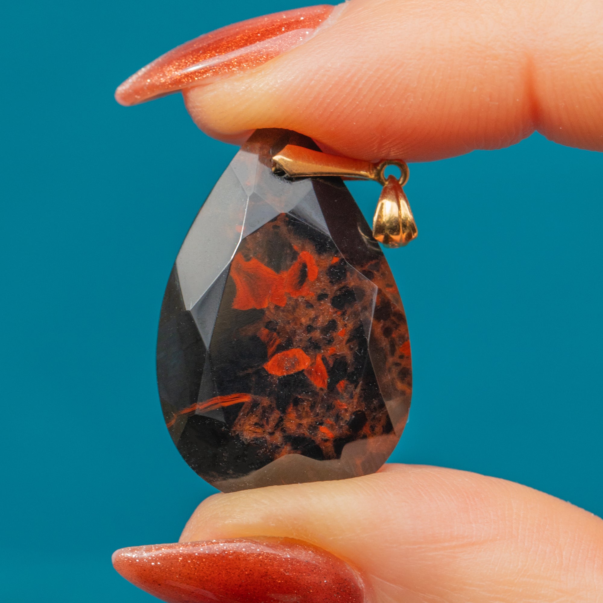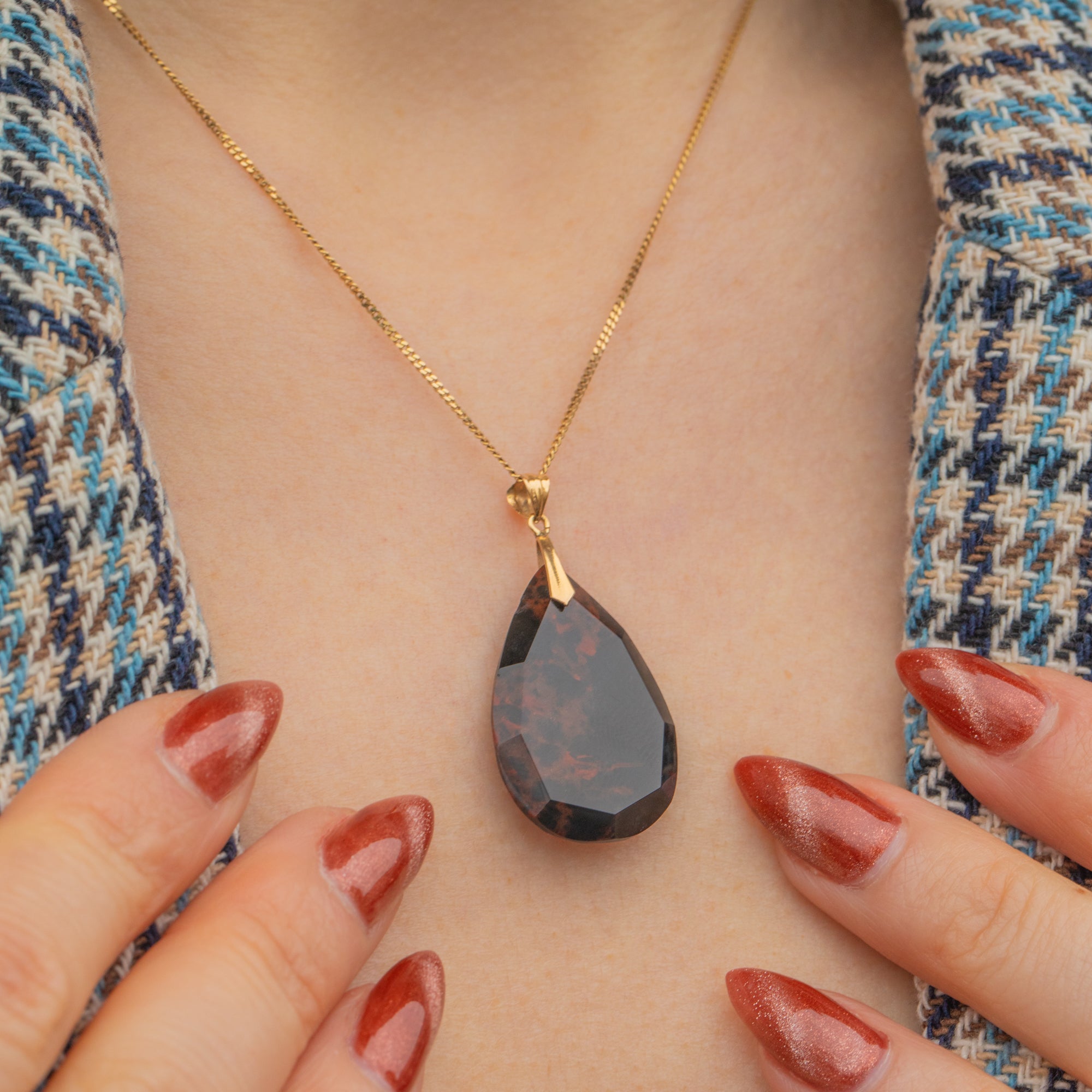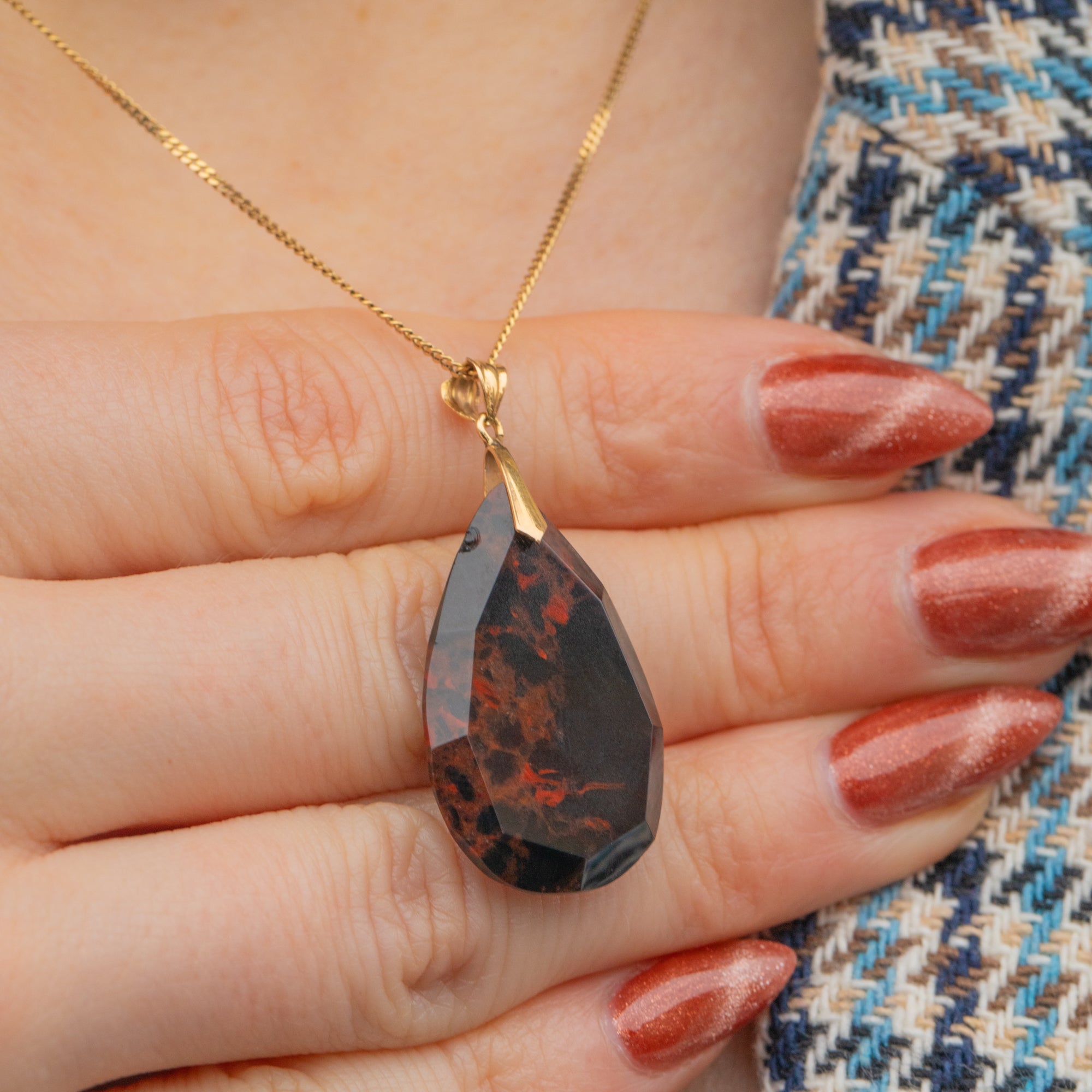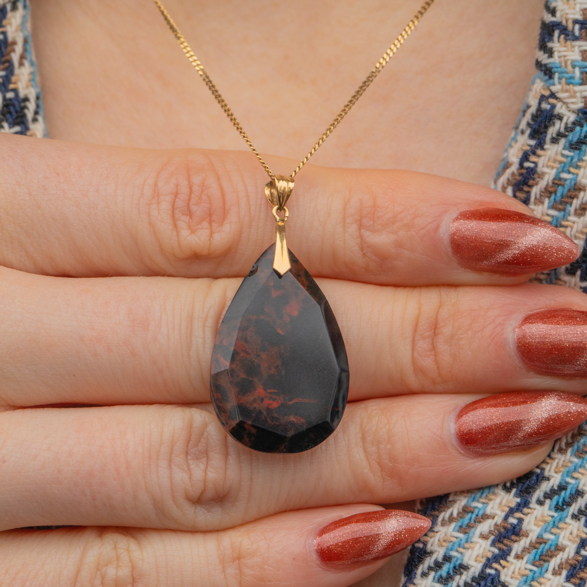 VERY GOOD: This 18ct Gold Agate pear drop pendant is in very good condition. Her Bloodstone is gorgeous, with lovely facets and a radiant saturation. There is a chip to the side of the stone, however, this does not detract from her beauty. With a secure bale, she is in lovely condition with a high-shine polish and gorgeous patternation.