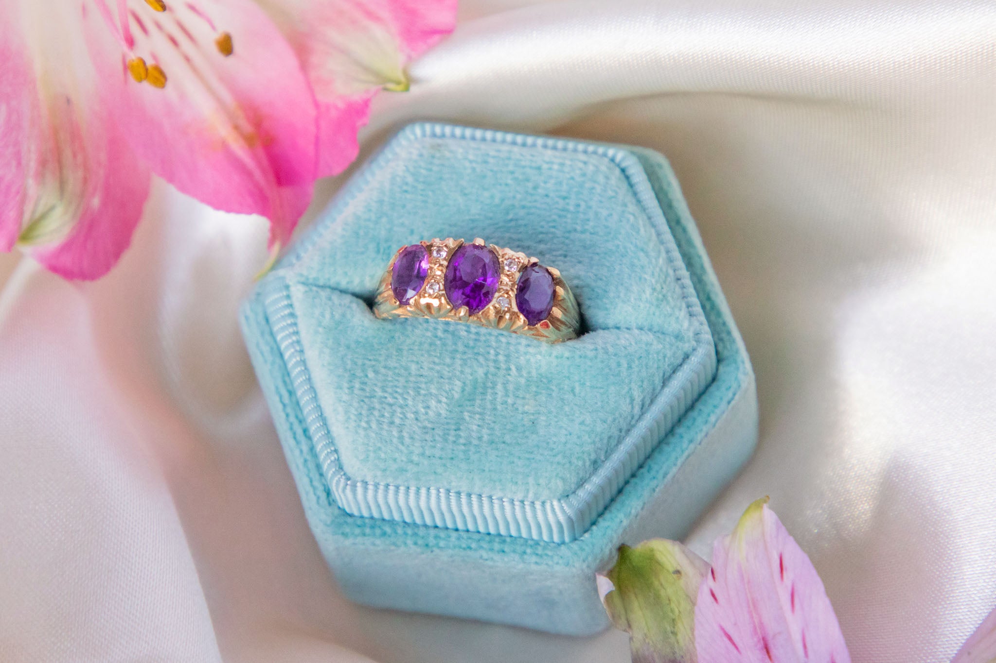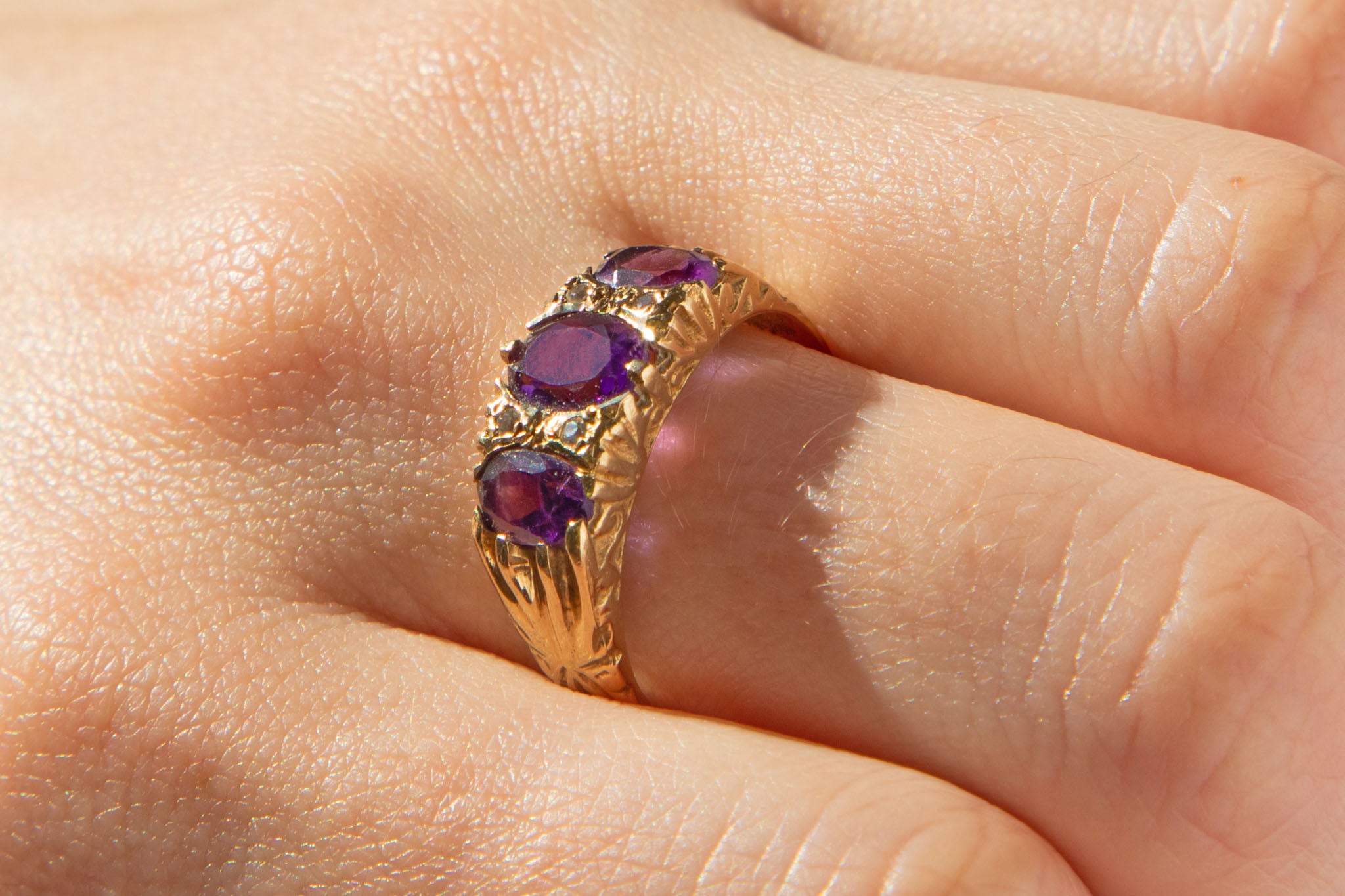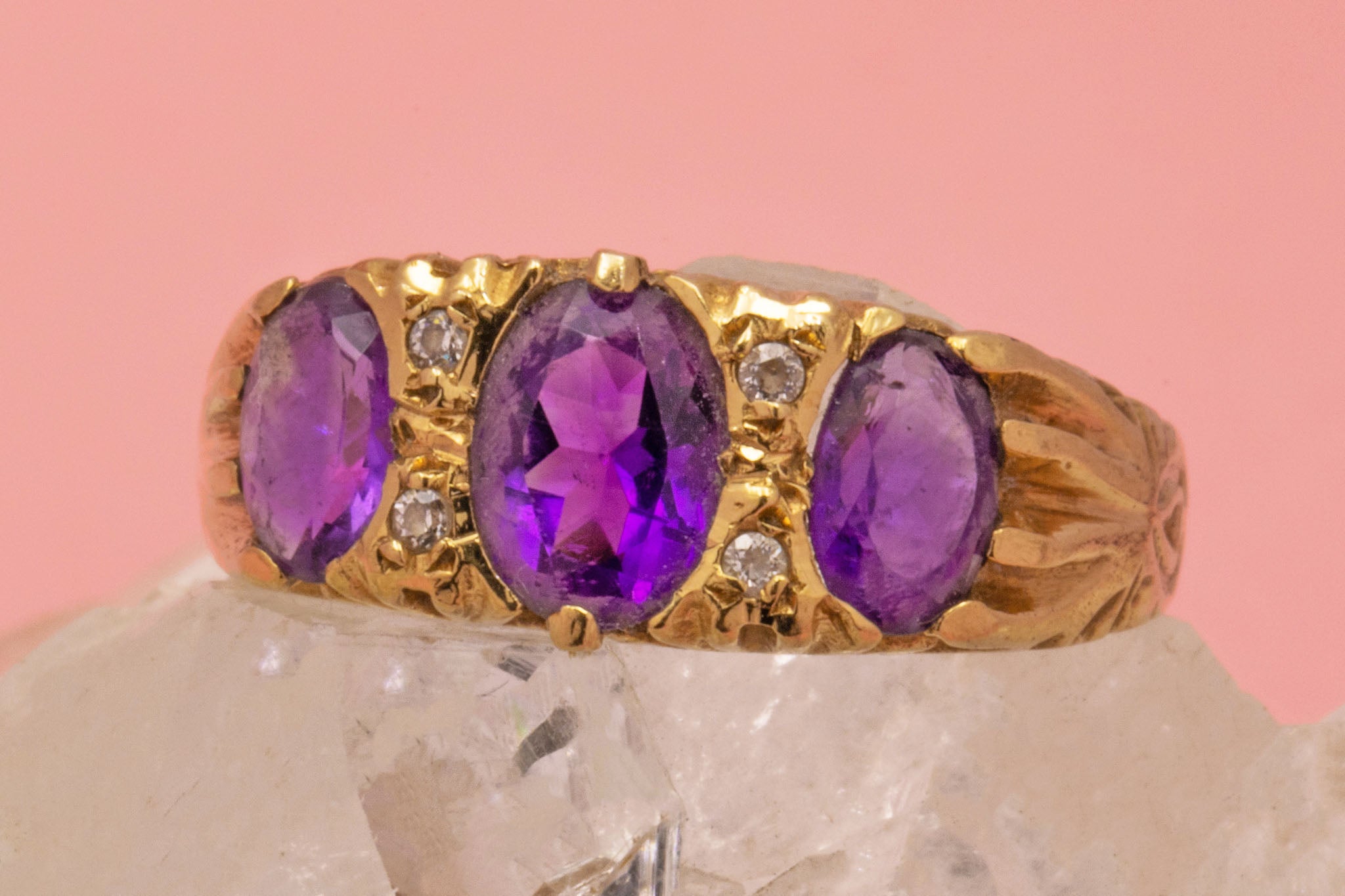 This antique 9ct Gold Amethyst Diamond ring is simply stunning! The ring is inlaid with three mouthwatering purple Amethysts, accompanied by four dazzling rose-cut Diamond spacers.