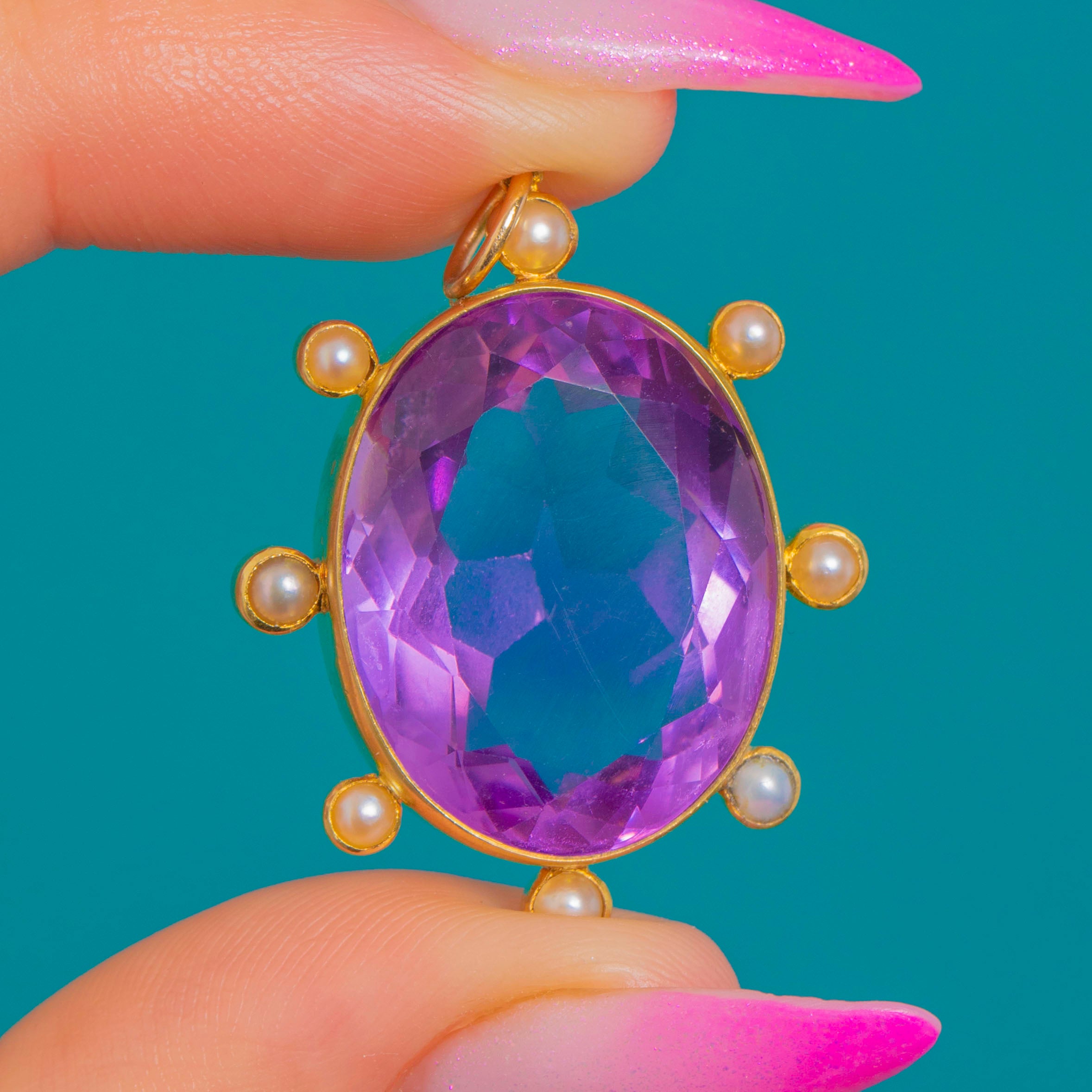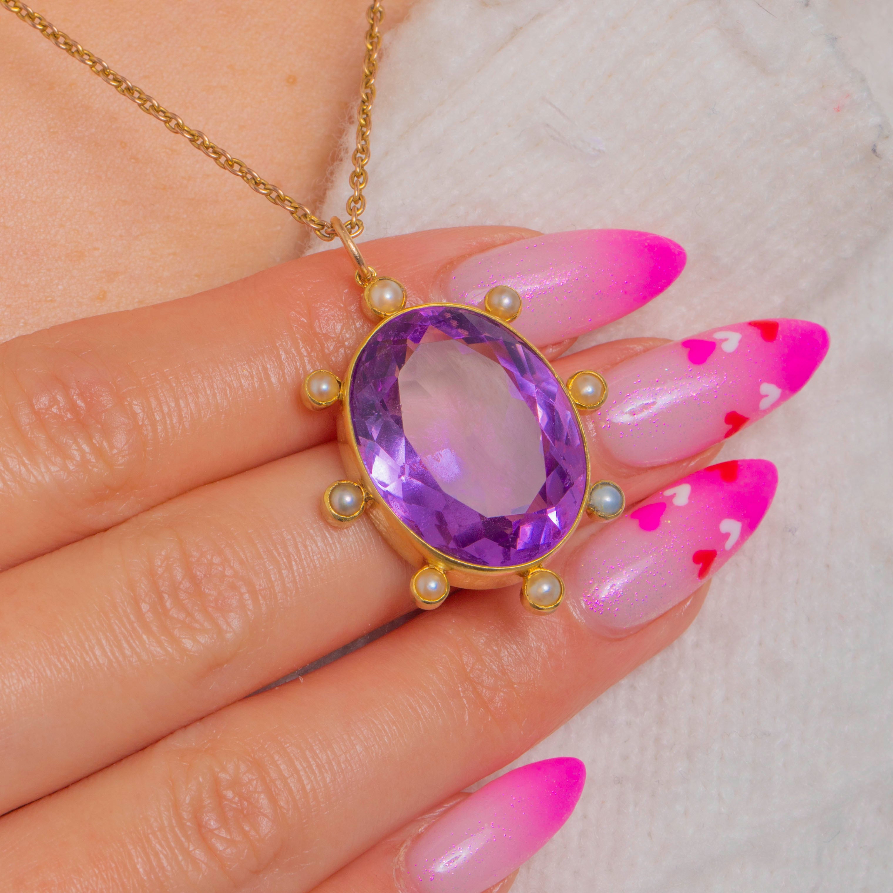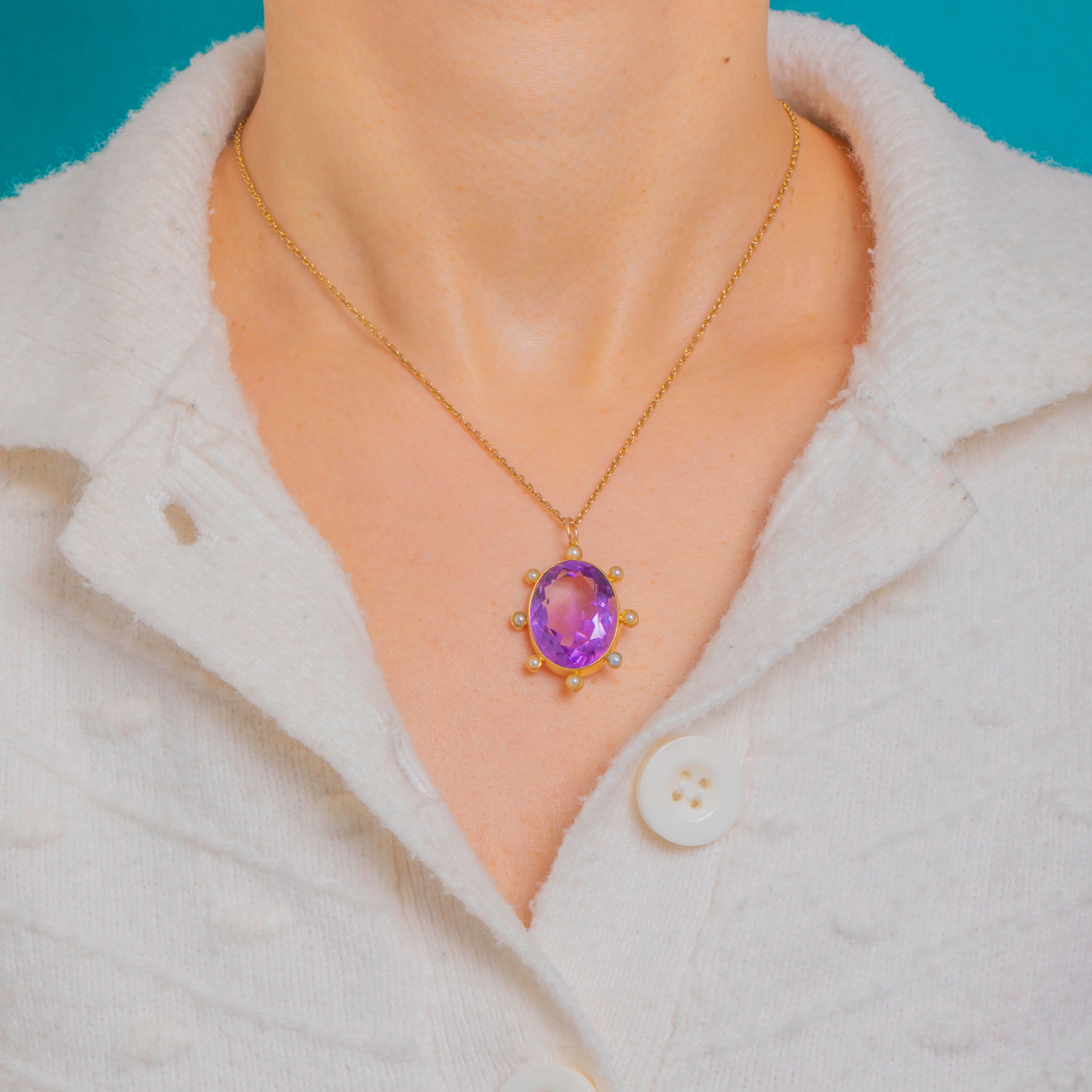 EXCELLENT: The Amethyst is bright and lively with crisp facets and natural internal inclusions visible under close inspection, with no chips visible. The Seed Pearls are intact with a pleasing lustre. The 18ct Gold setting and fixed bail are secure with only light surface wear consistent with age, and no visible repairs.