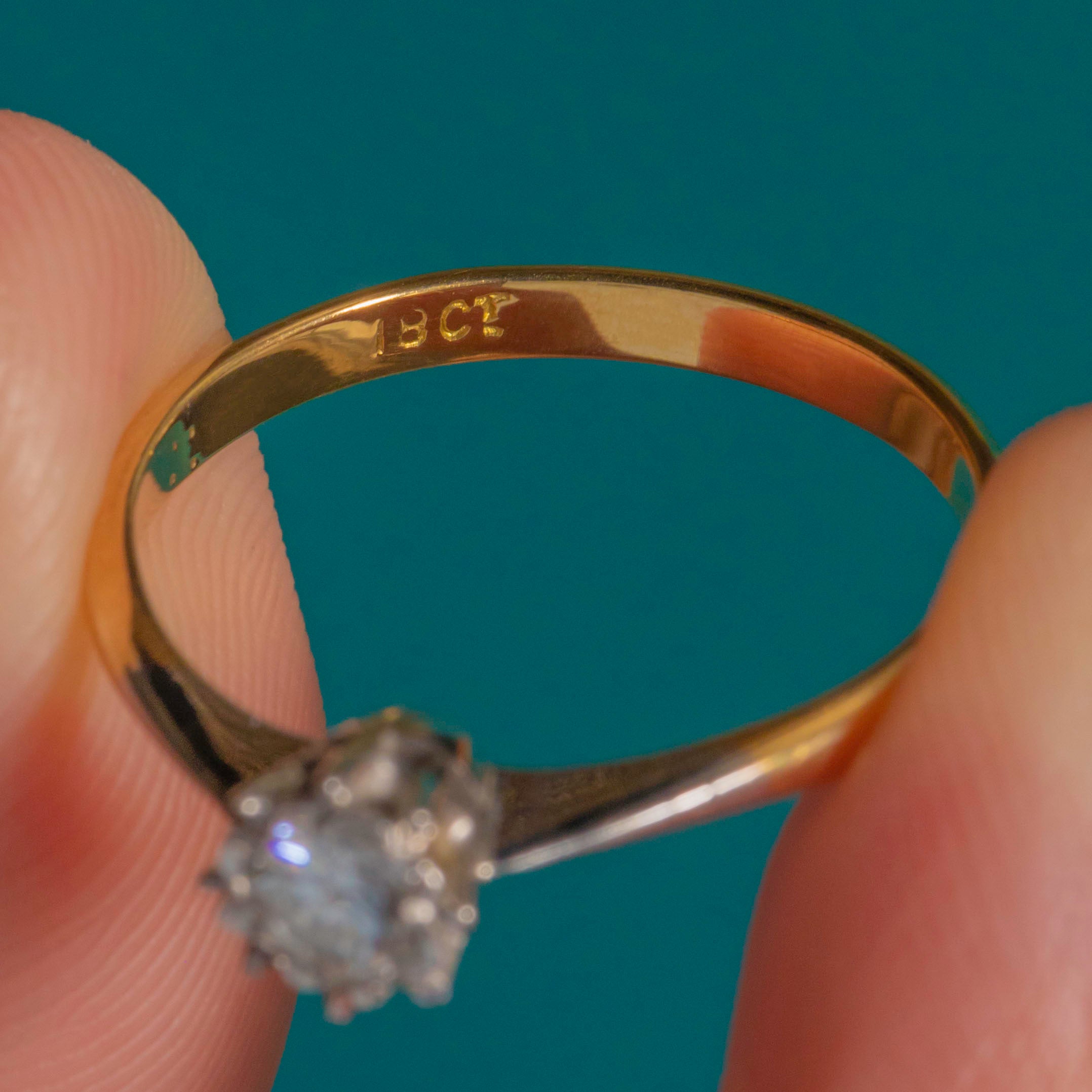 EXCELLENT: The Diamond is bright and lively, securely set with no visible chips or abrasions. The 18ct Gold band and mount show only light wear commensurate with age, with all original details crisp and well-preserved.