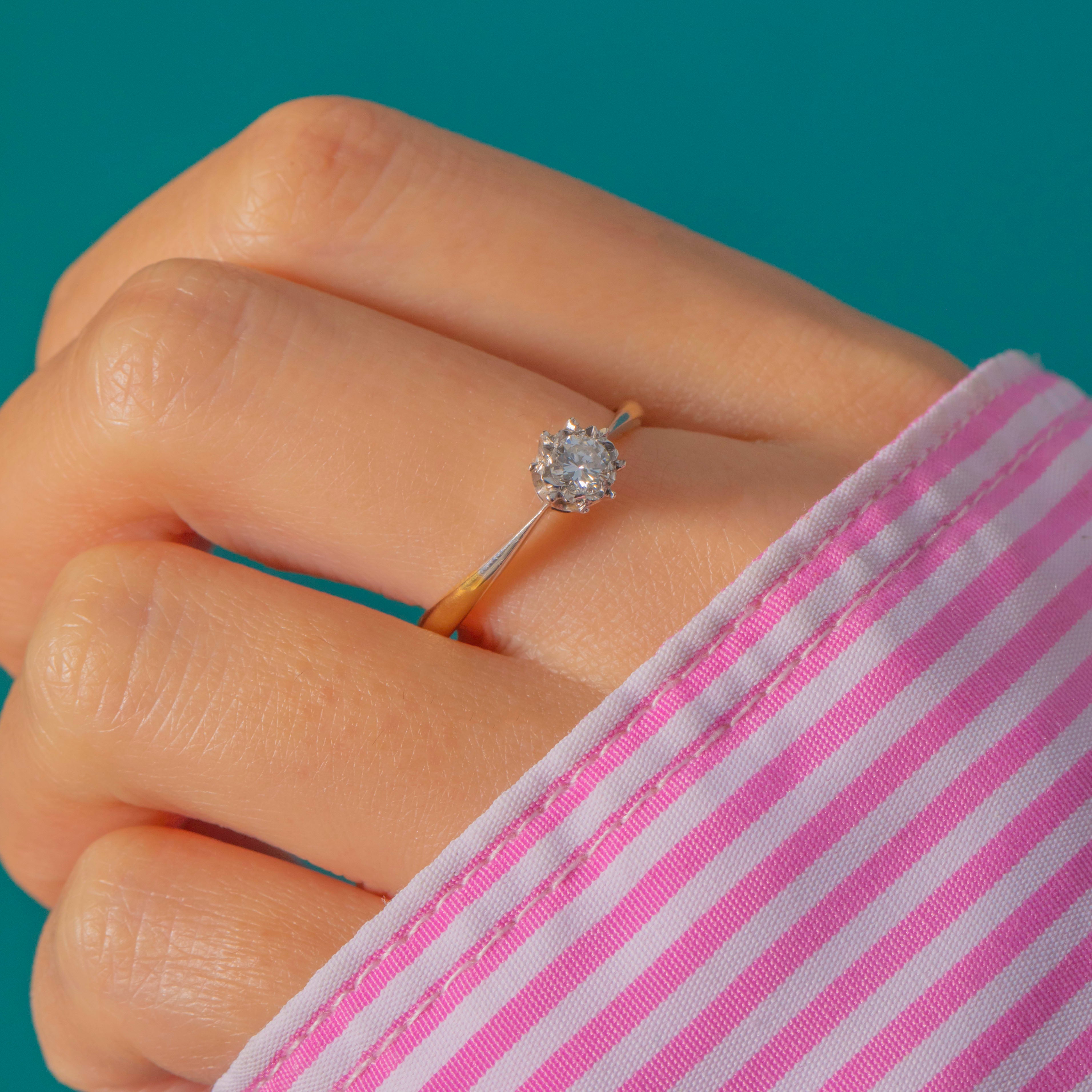 A timeless Art Deco Diamond solitaire ring that captures effortless 1930s elegance. The sparkling 0.30ct old-cut Round Diamond sits proudly in a classic six-claw crown, lifted by sculpted shoulders that taper into a smooth 18ct Gold band. The white Gold setting enhances the Diamond’s natural brilliance, creating a radiant play of light with every movement.