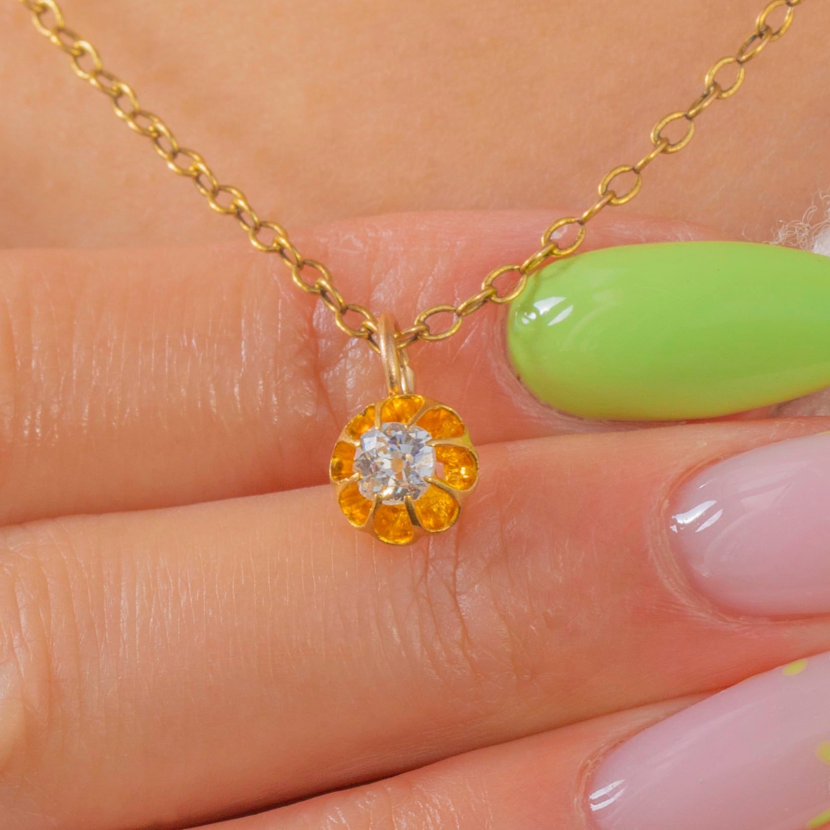 EXCELLENT: The Old Mine Cut Diamond is bright and secure with no obvious chips or abrasions. The buttercup setting and jump ring show only light, superficial surface wear commensurate with age.