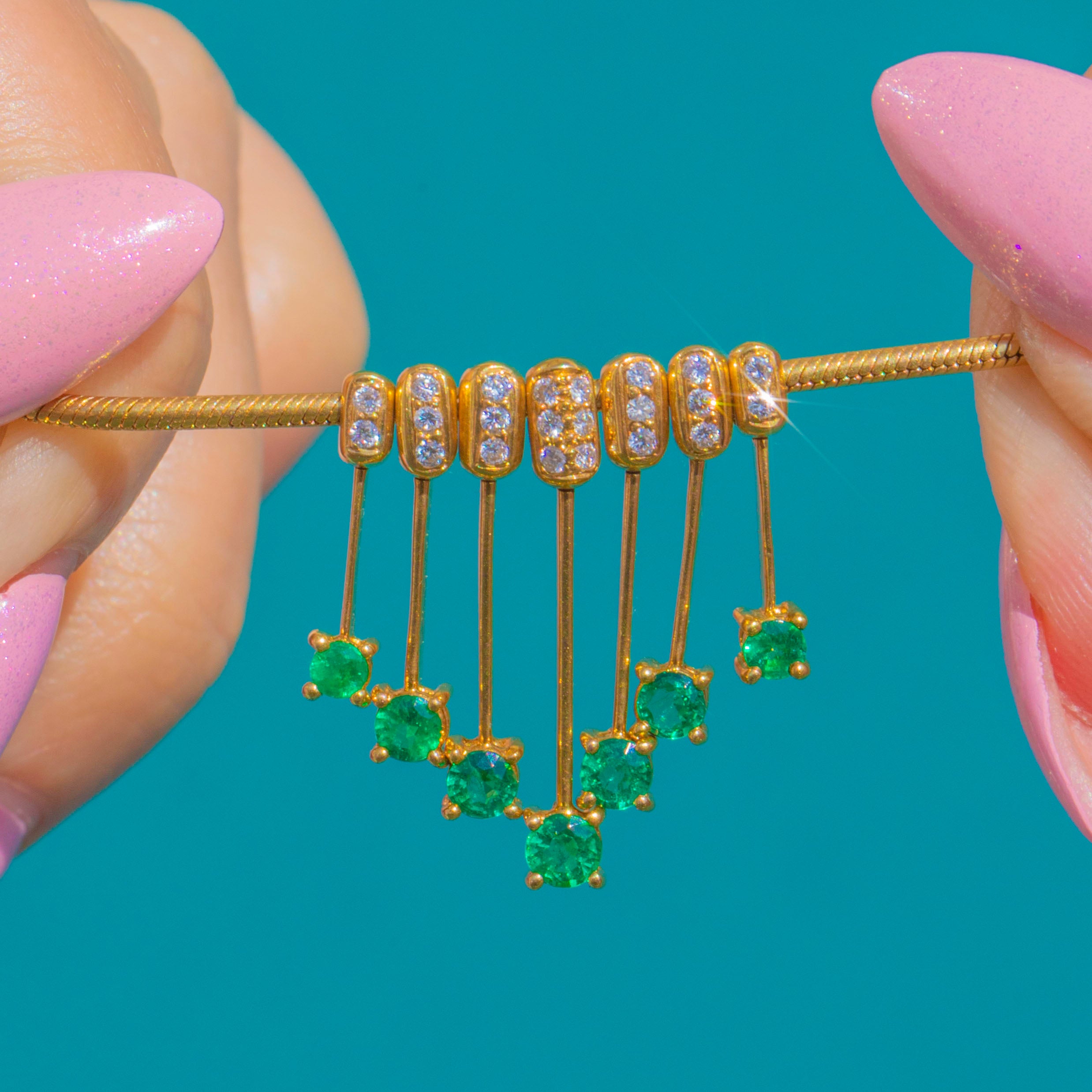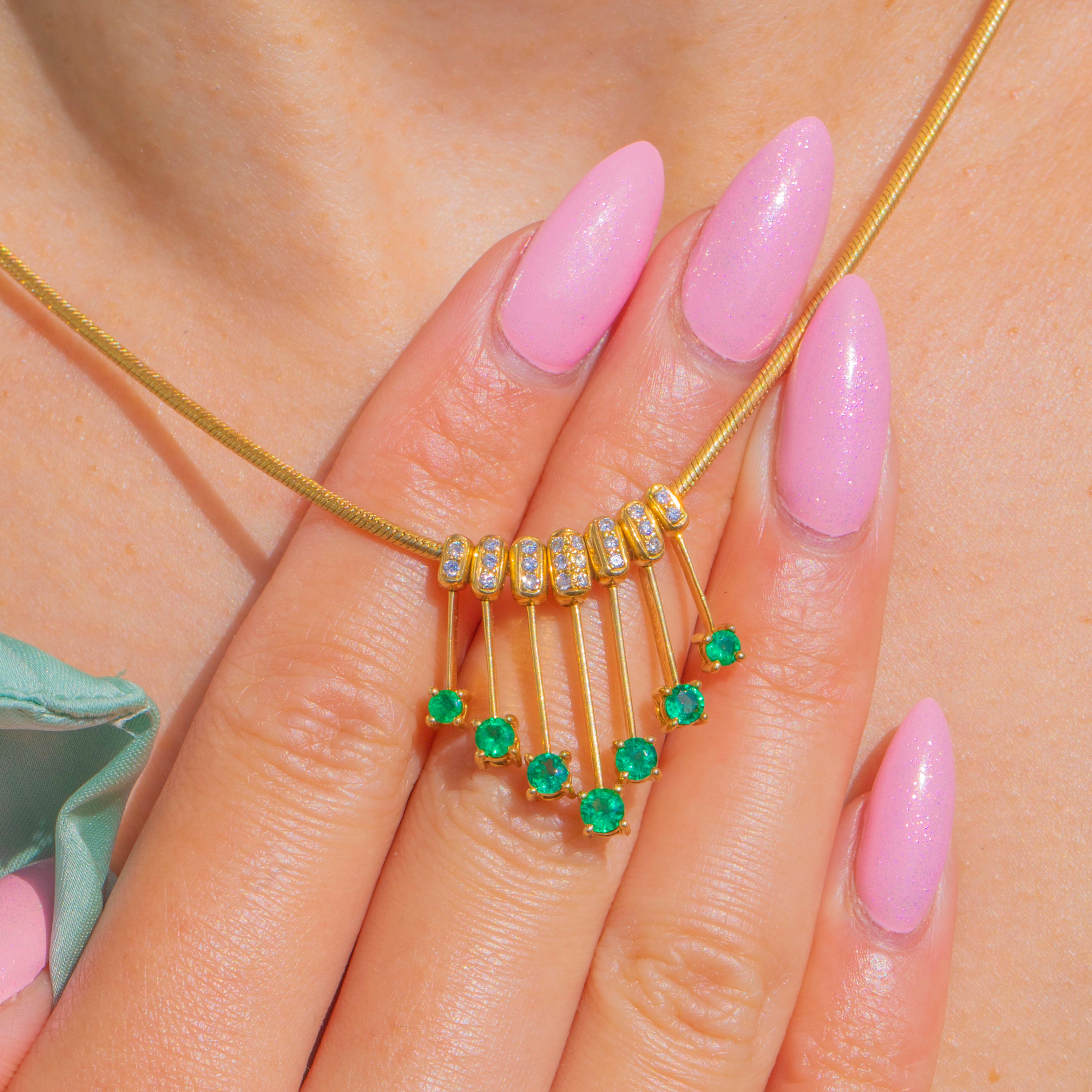 A luminous take on the classic fringe motif, this 18ct Gold necklace drapes from a fine snake-style chain to a beautifully articulated graduated tassel. A curved row of pavé-set Diamonds leads the eye to slender Gold rods, each finished with a vivid Emerald for a fresh pop of green and captivating movement.