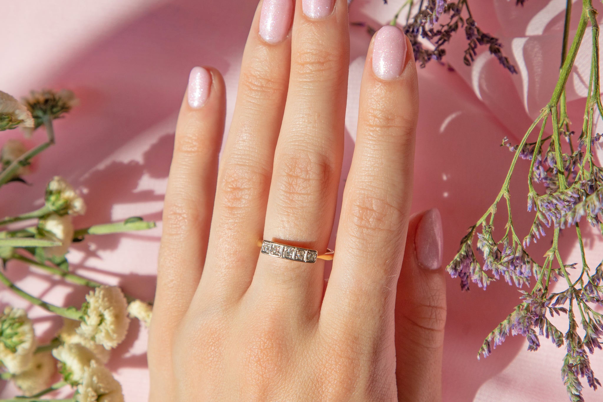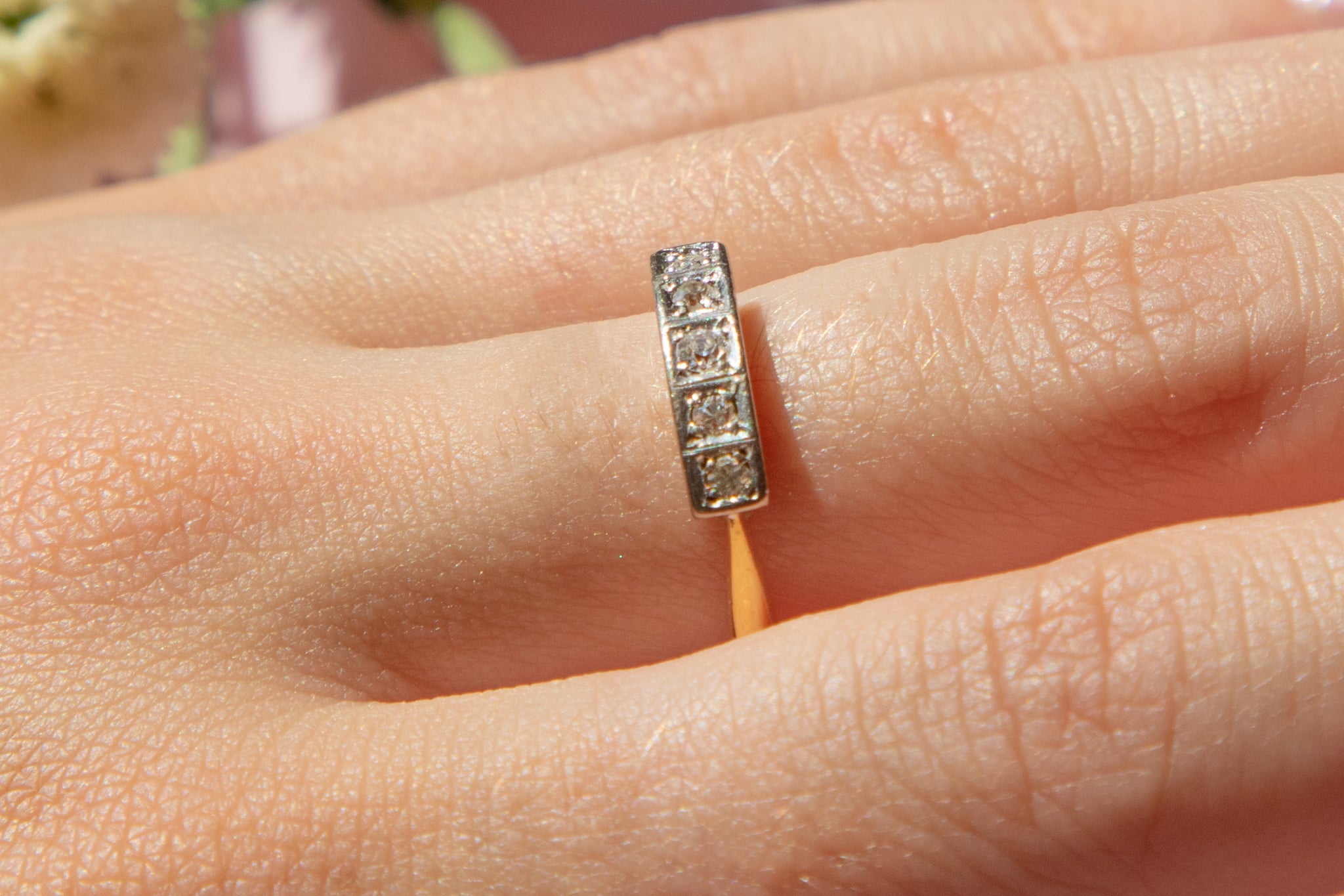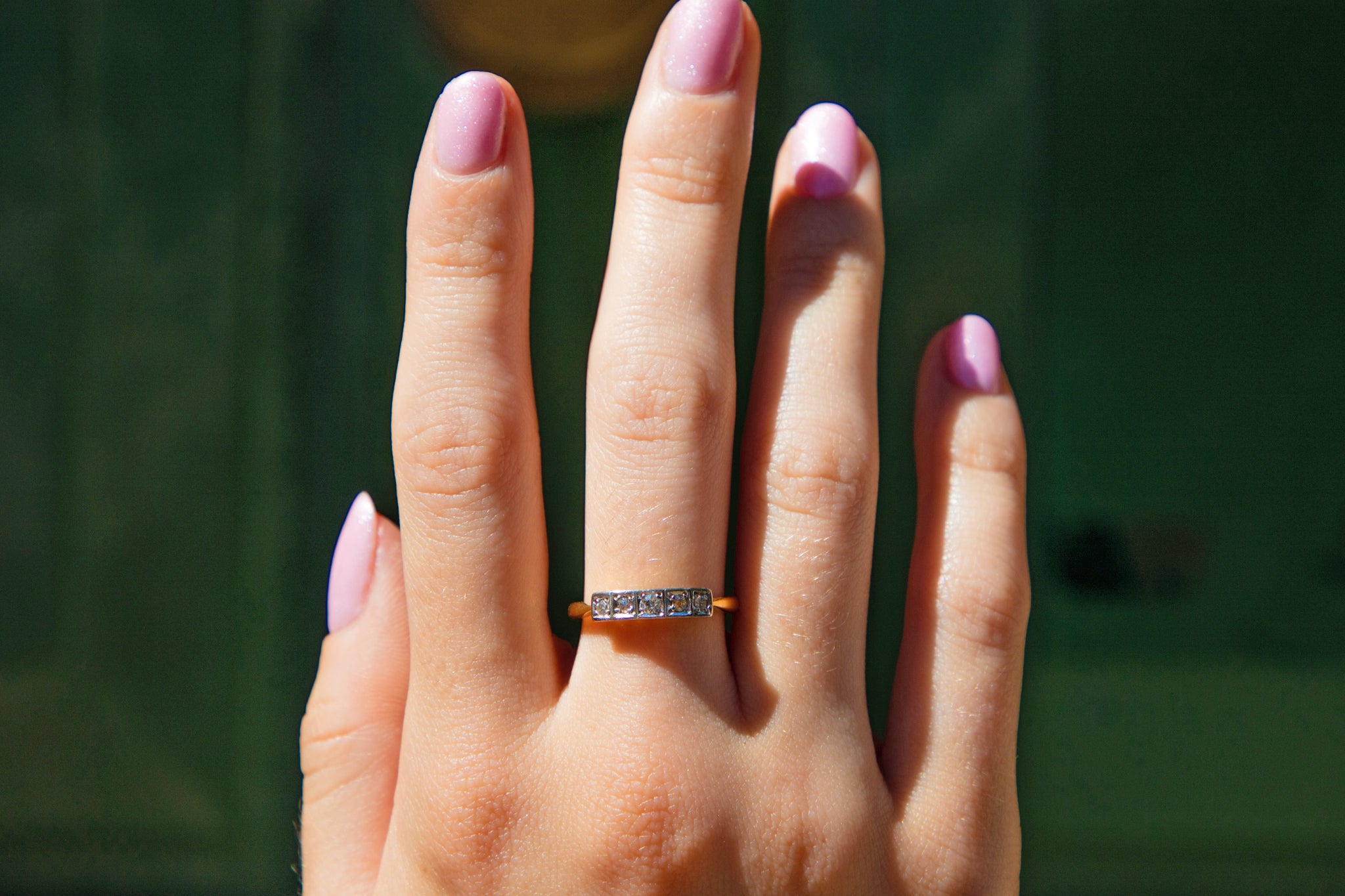 EXCELLENT. This 18ct Gold five stone Diamond ring is in excellent condition. Her Gold is glossy and bright, settings are intact, and she is free from any damage to note. Each Diamond is securely nestled into its settings completely free from any chips or fleabites, so you can wear her with confidence! A divine vintage Gold ring to add to your collection.