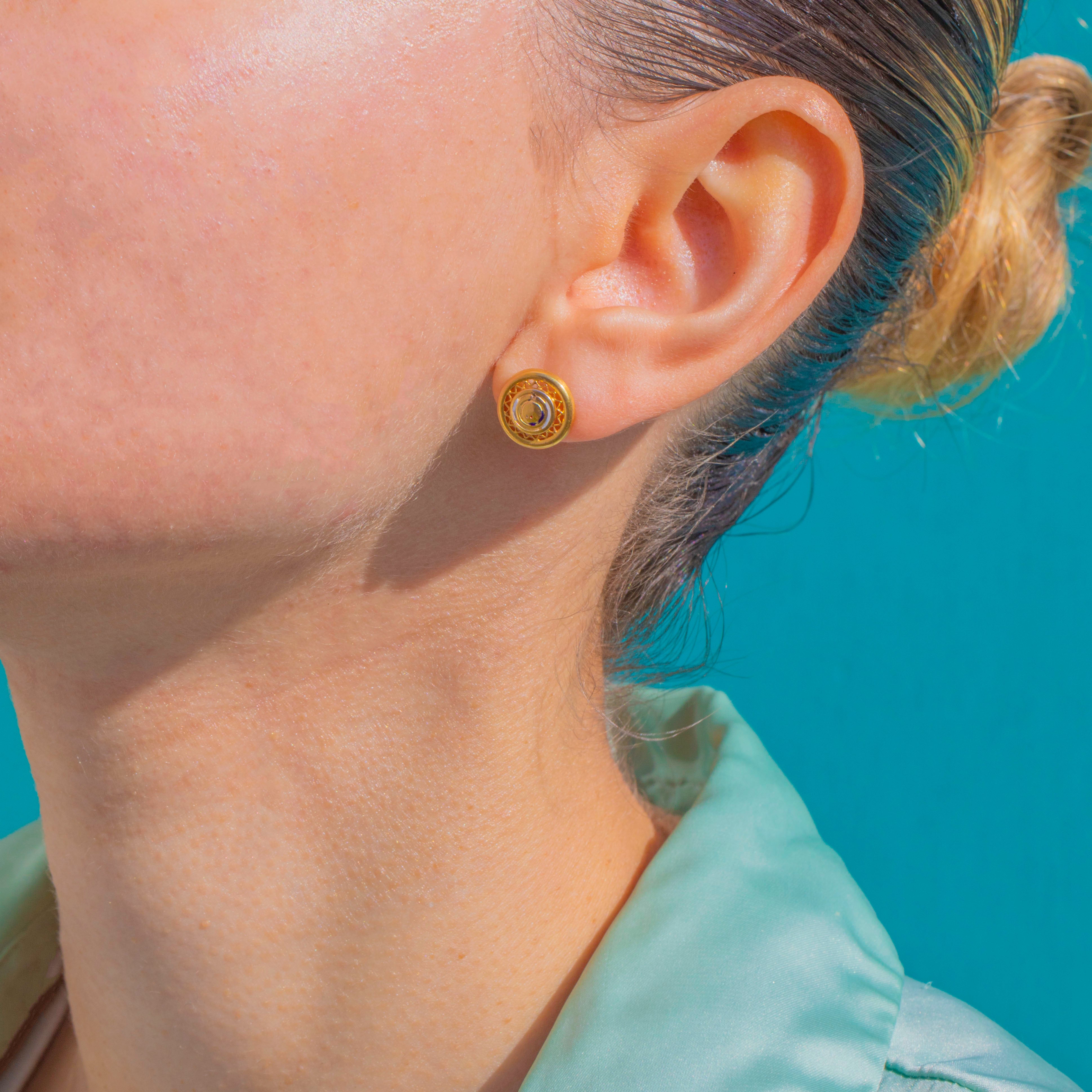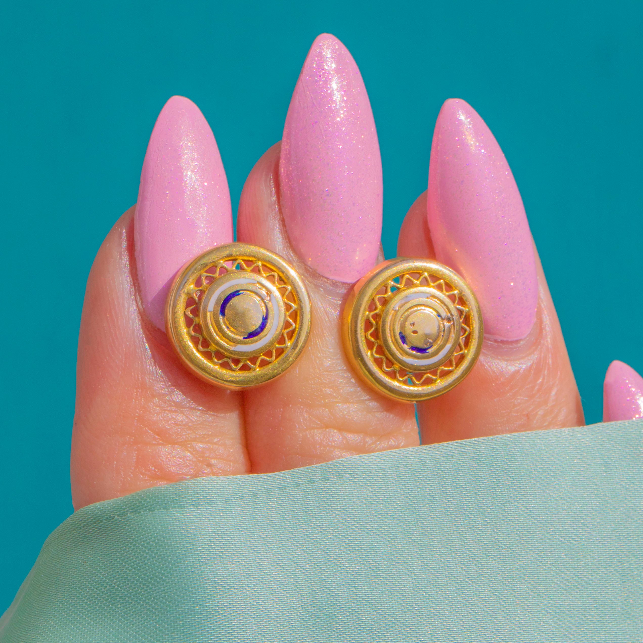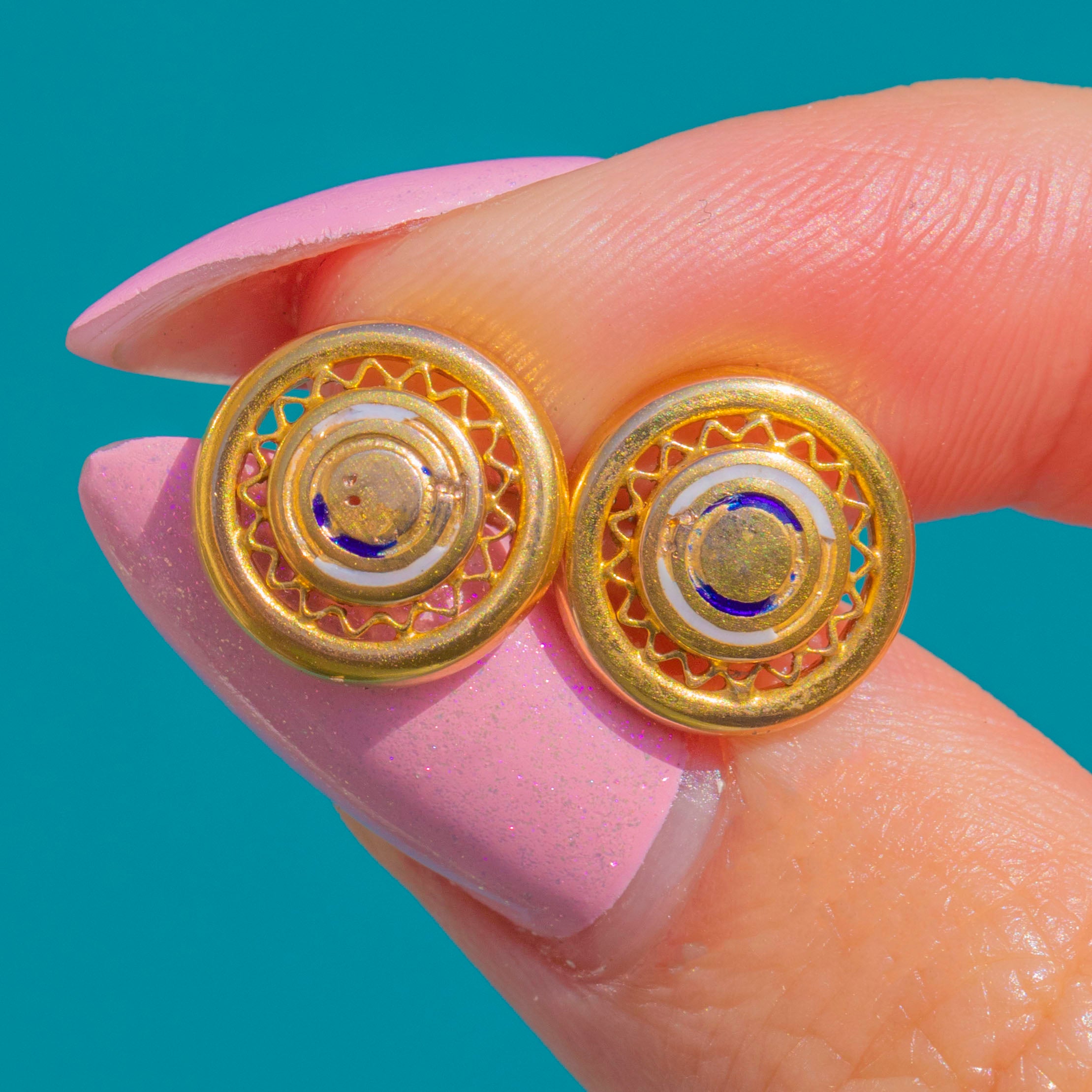 These refined French Victorian circle studs bring together luminous 18ct Gold and glossy Enamel in a chic, button silhouette. A raised domed centre is framed by crisp concentric rings, an openwork sunburst gallery and a delicate beaded edge, creating a graphic play of light and shadow with every turn.