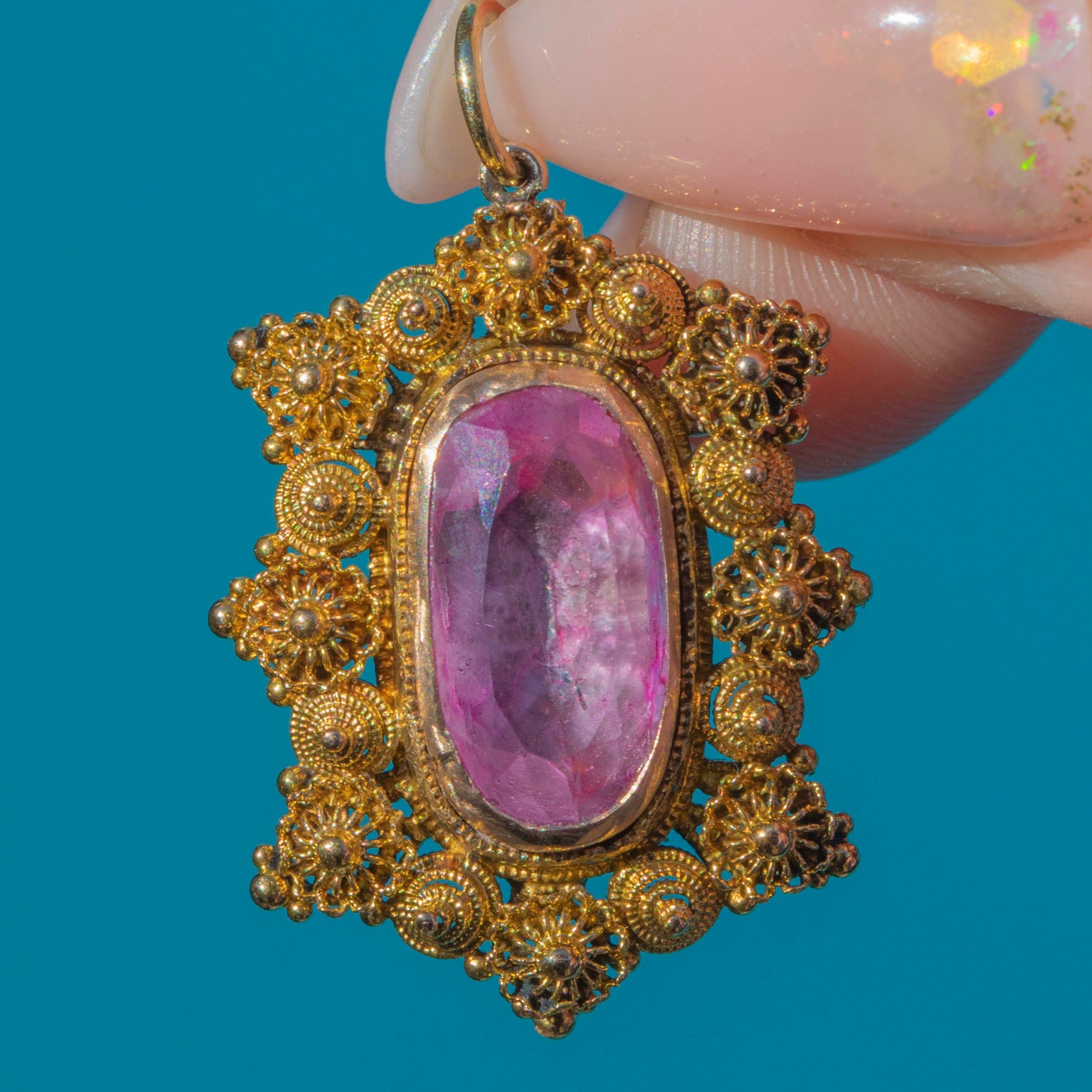 The prized gem is framed by a spectacular 18ct Gold cannetille surround, with intricate Gold coils and granulation forming a decorative starburst border. This detailed craftsmanship is characteristic of the early 19th century, when cannetille work was at the height of fashion. Its ornate, lace-like texture gives the piece both delicacy and impact.