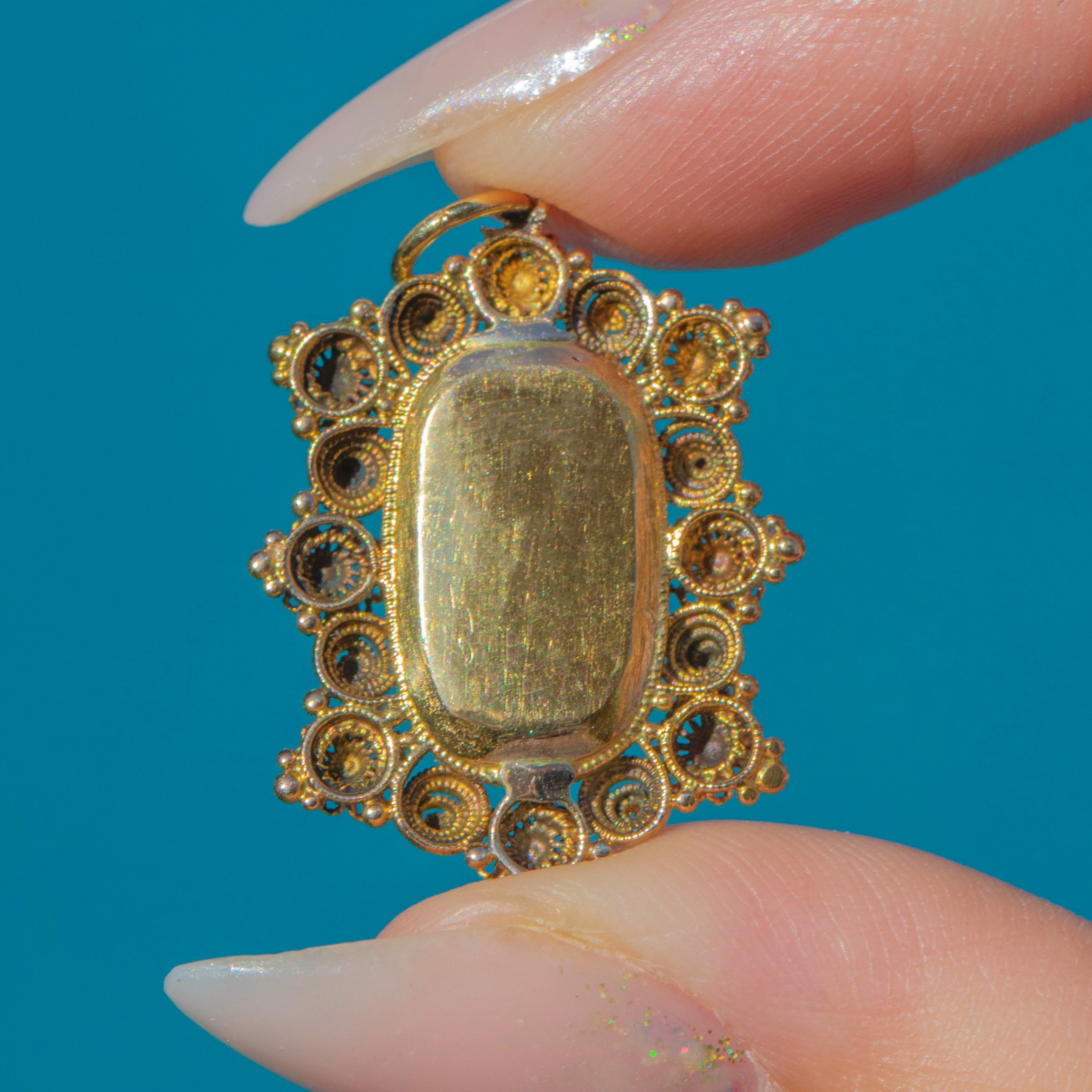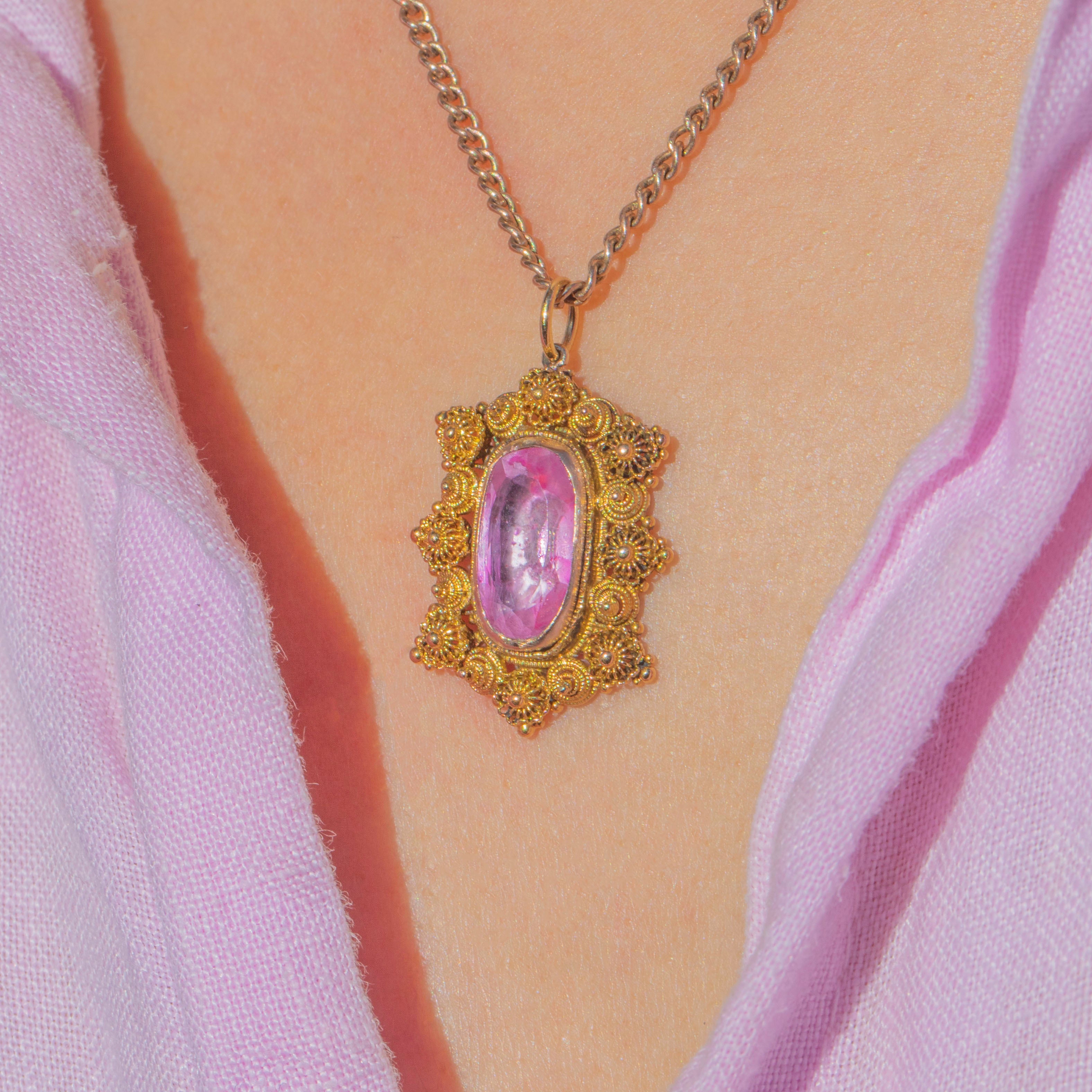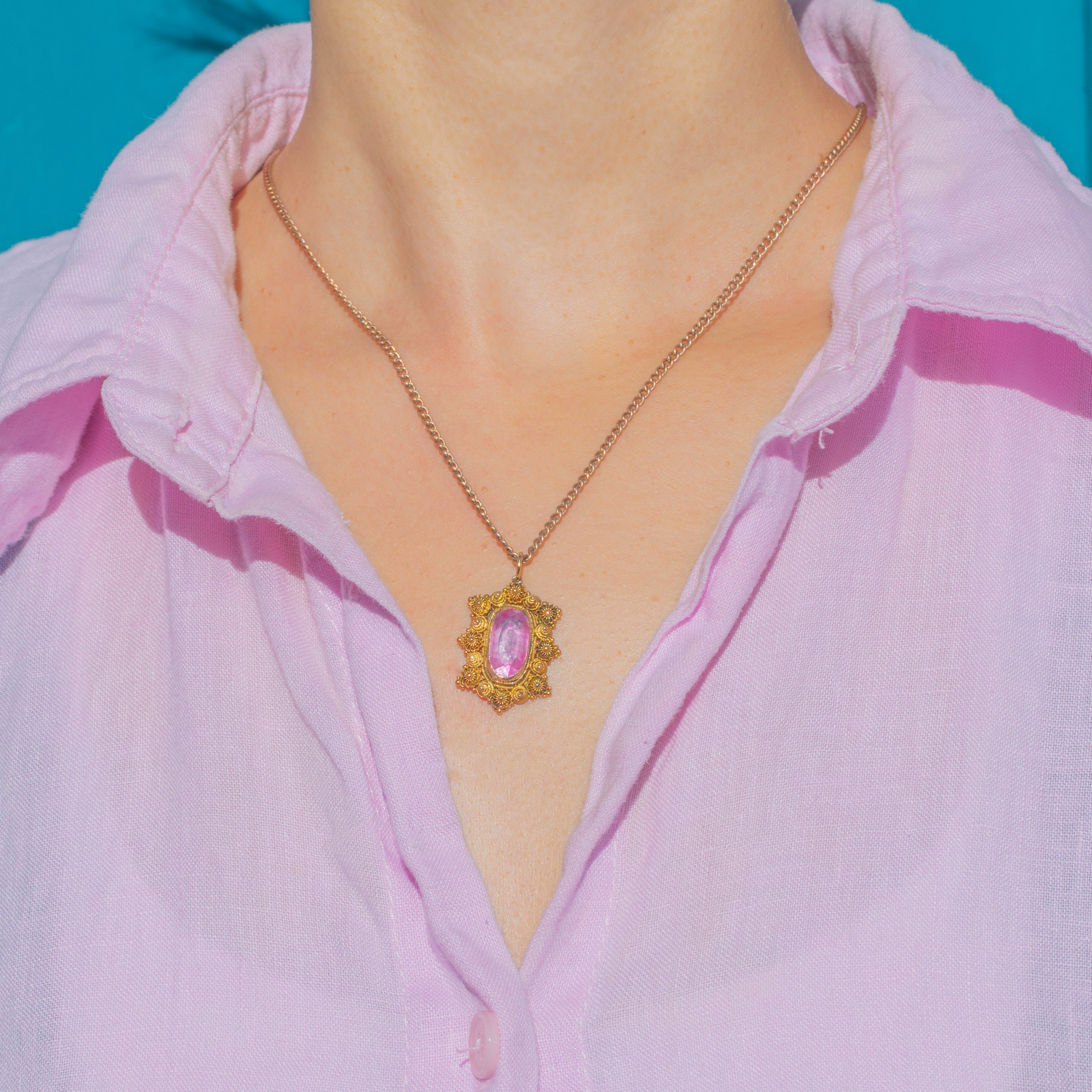 EXCELLENT: The pretty Georgian Pink Topaz is the most sought-after, luscious baby pink, and shows some natural inclusions. The foiling is intact and the charm has only the lightest surface wear, consistent with her great age. At over 200 years old we think she looks pretty exceptional!! The 18ct Gold cannetille work is bright yellow and well preserved with only minor softening of detail. Overall, the pendant has been well cared for and remains in beautiful antique condition.
