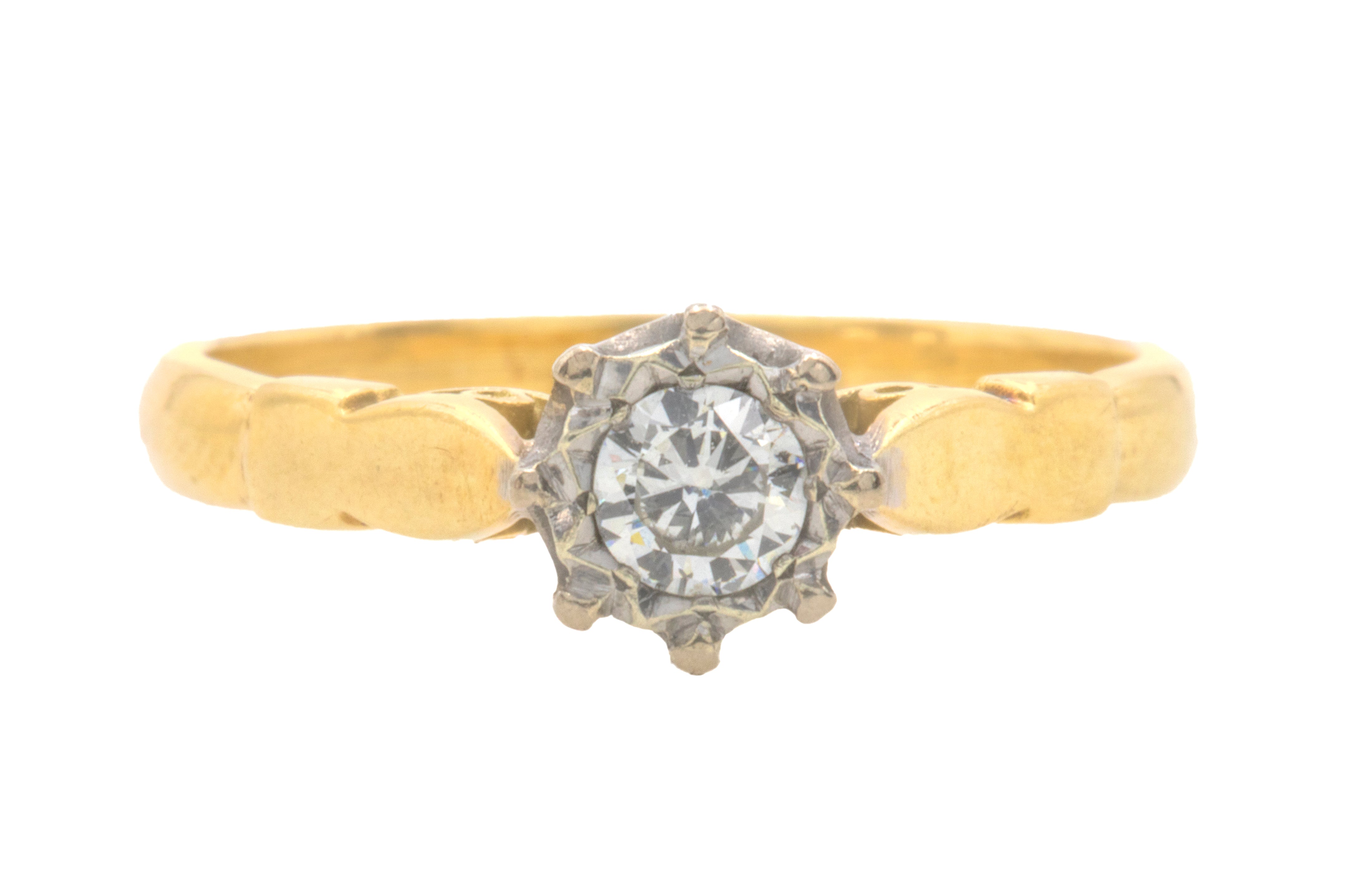 A splendid 18ct Gold illusion-set Diamond solitaire engagement ring. This gorgeous piece features a single 0.20ct Diamond at the centre, in cleverly crafted settings accentuating her size!