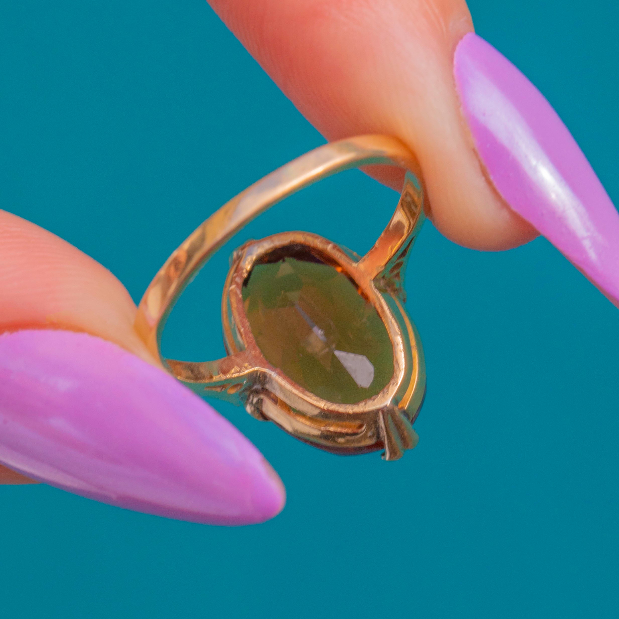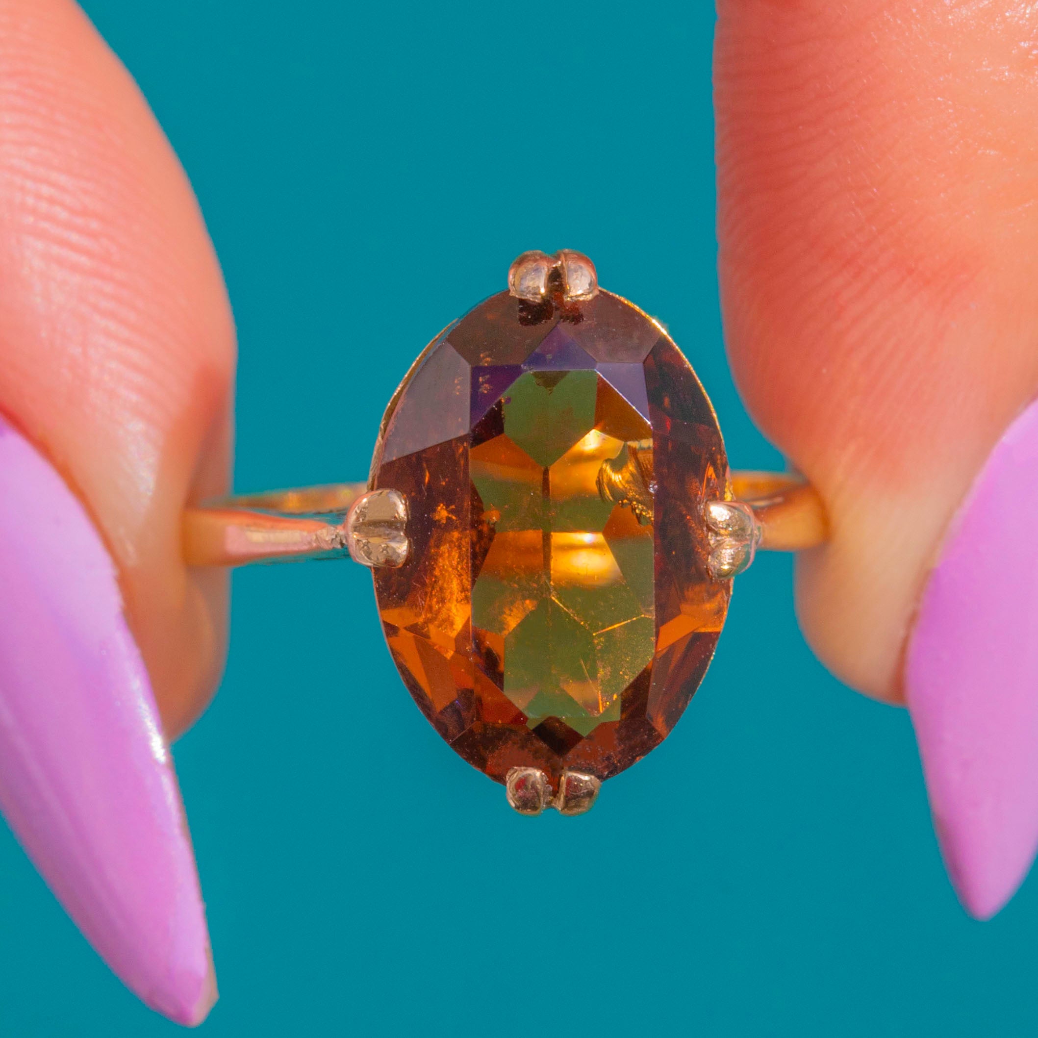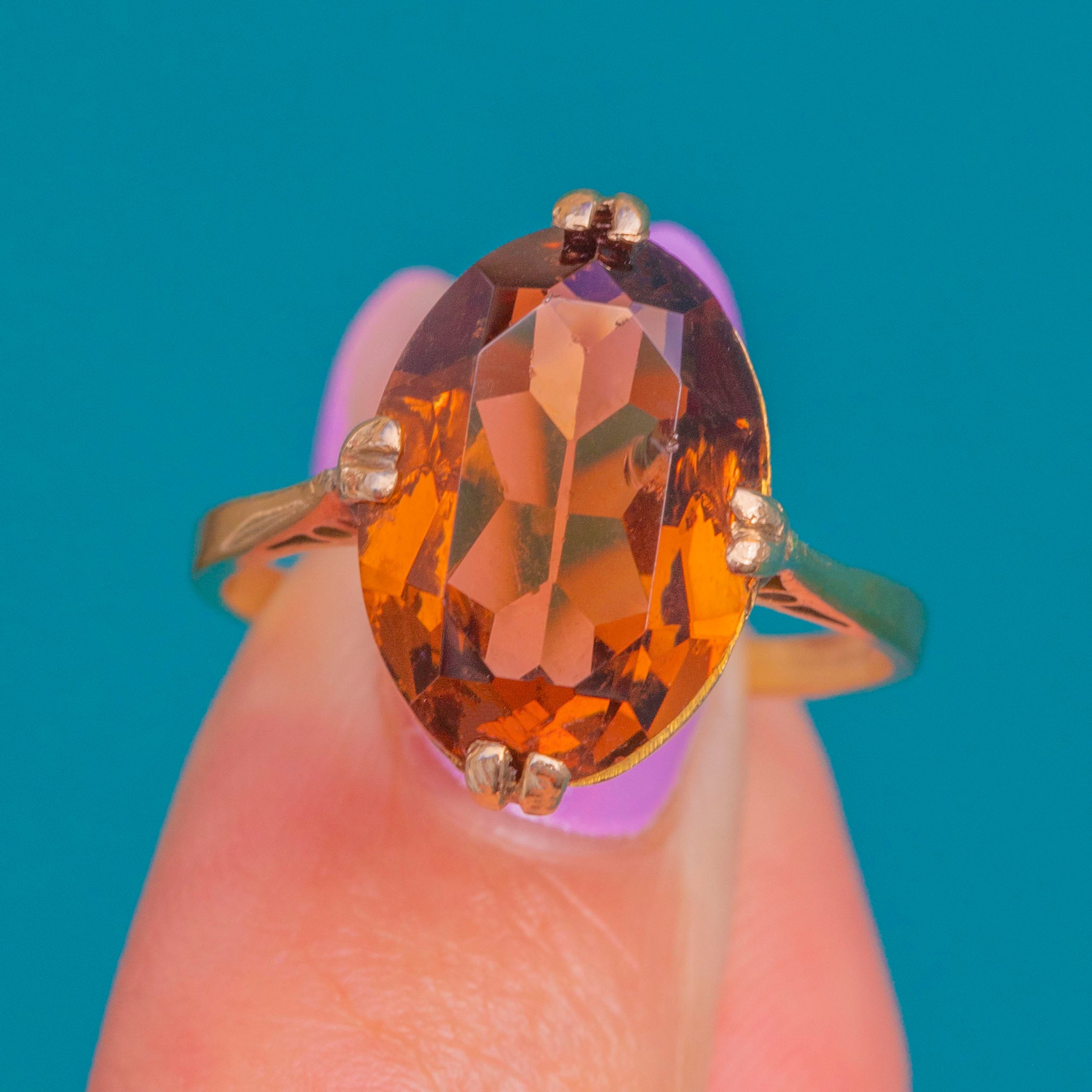 EXCELLENT: The Citrine is bright with no chips or cracks, and only minimal surface wear visible under magnification. The claws are secure and the slim Gold shank and setting show light wear commensurate with age. No obvious signs of resizing or repair.