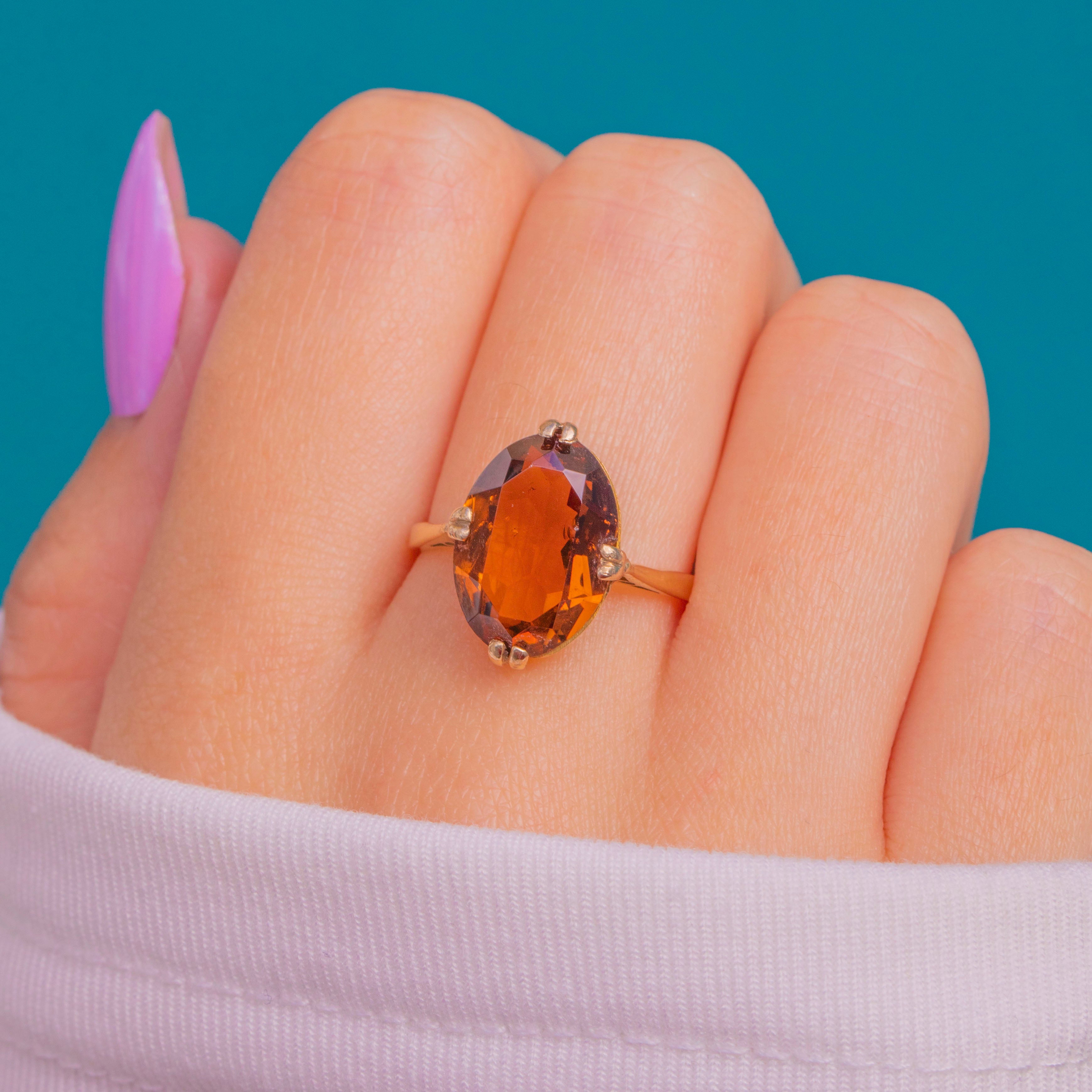 Glowing with rich Madeira hues, this Vintage solitaire ring showcases a sumptuous oval Citrine in a refined 18ct Gold mount. The elongated, faceted stone sings with warm cognac-orange tones, held securely by graceful rounded, tipped claws for a clean, elegant silhouette.
