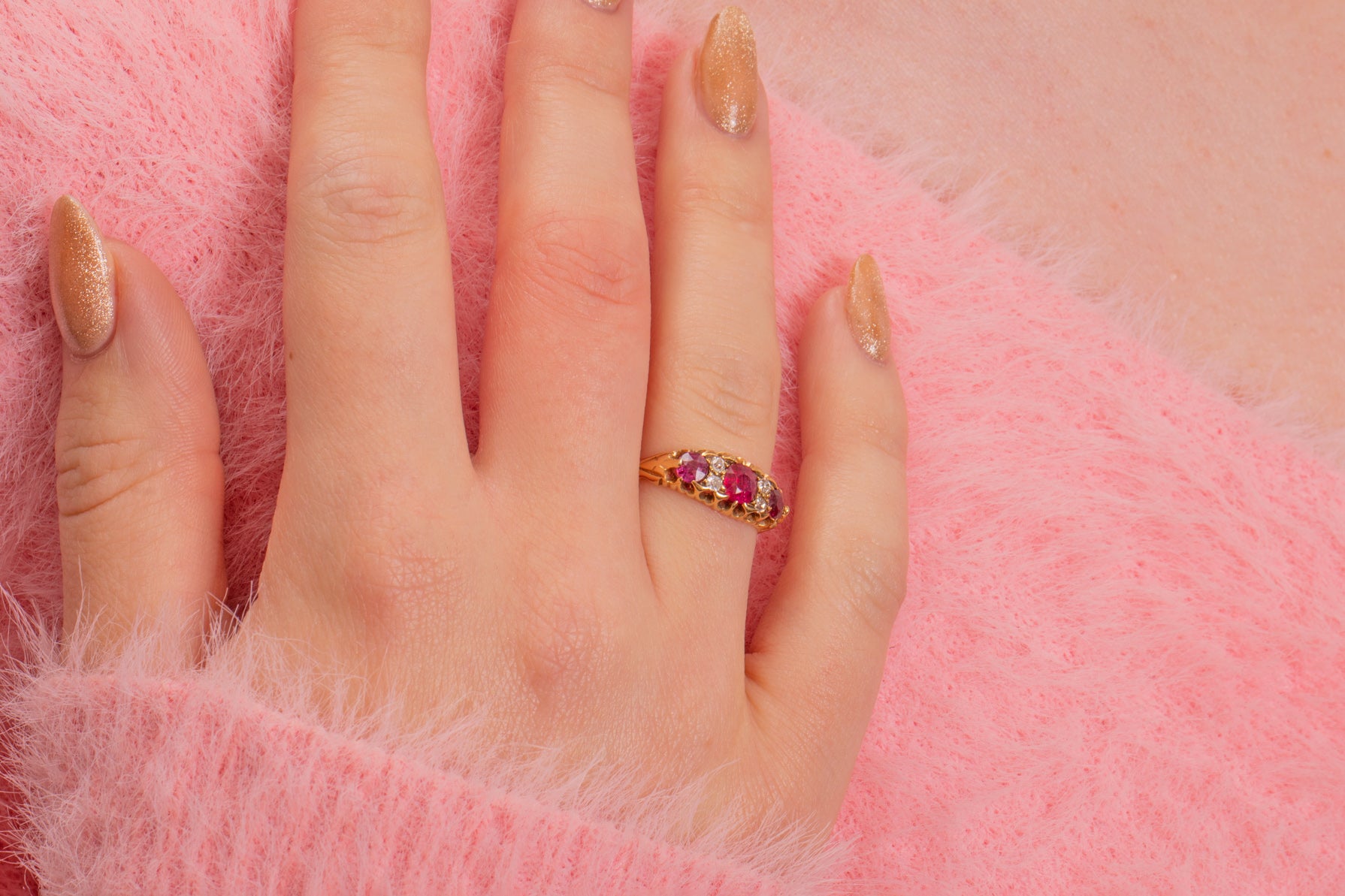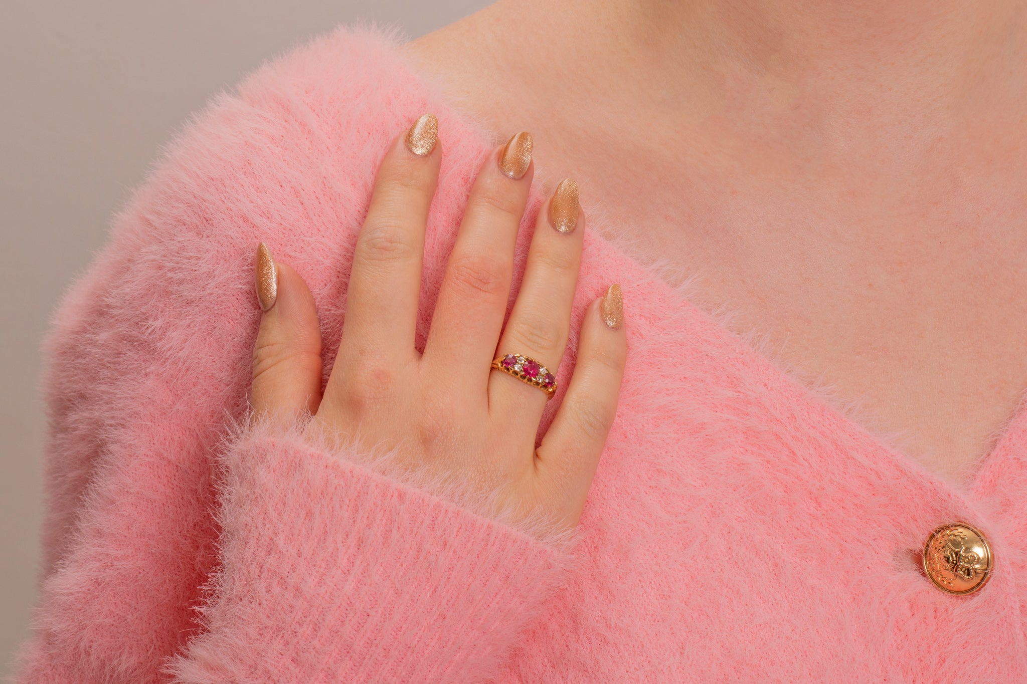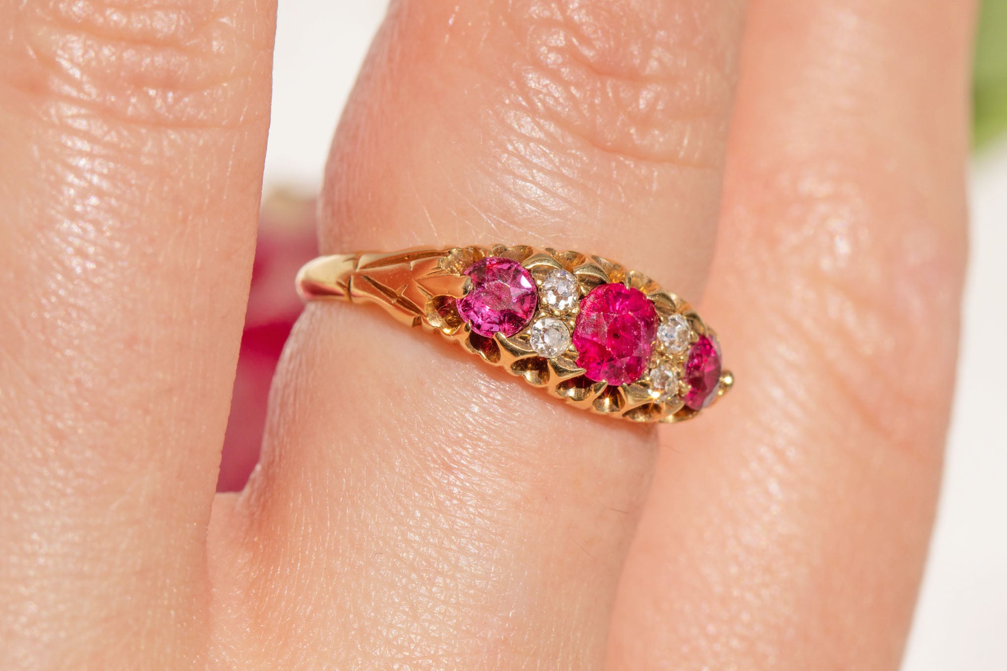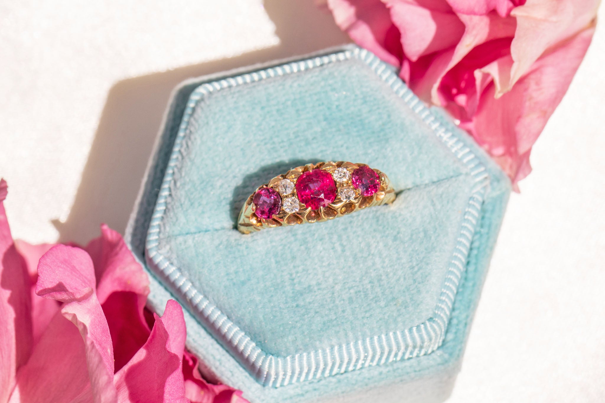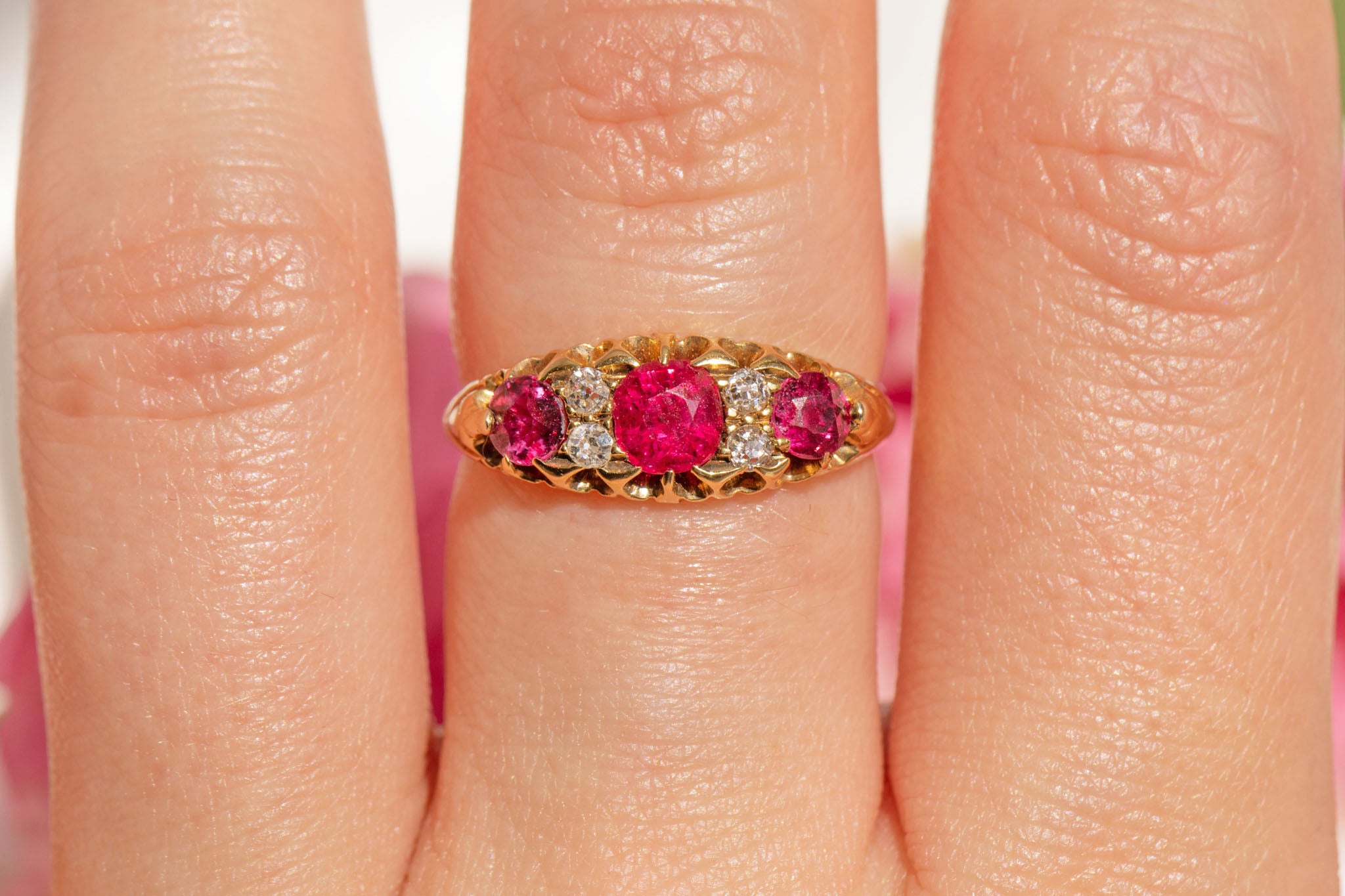 EXCELLENT. This is a splendid 18ct Gold natural Ruby Diamond ring! In excellent condition, this piece features three stunning Rubies, alongside bright and crisp Diamonds which are all secure within their settings. The inside of the smooth Gold band are crisp, and has allowed us to date the ring to 1902! We simply don't have anything other to say than 'wow'.