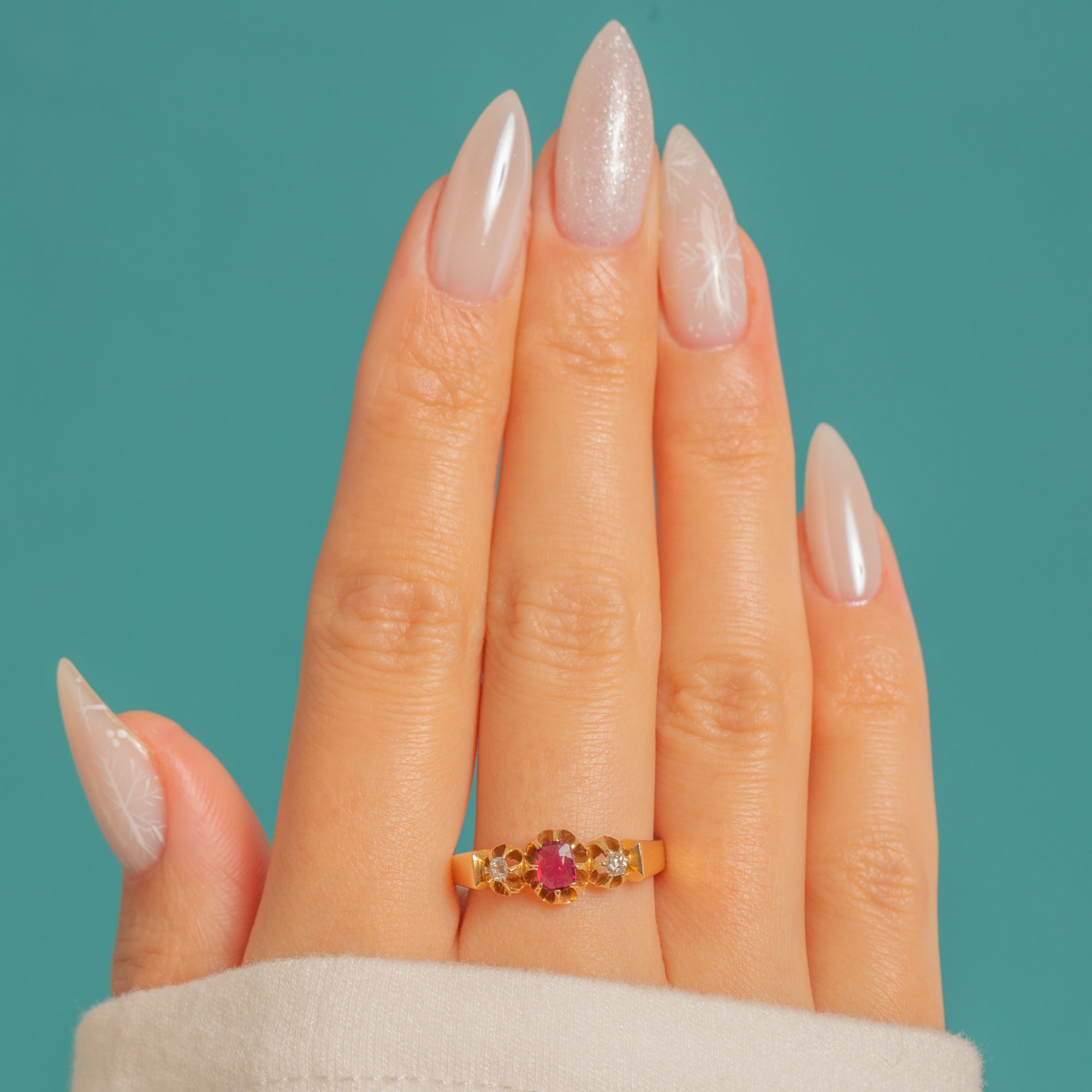 Fully hallmarked for Chester with the date letter “L” for 1911, this three-stone ring blends delicate proportions with timeless elegance. The open backs invite light through the gems, enhancing their glow. The Ruby is approximately 0.25ct, with Diamonds of approximately 0.06ct combined.