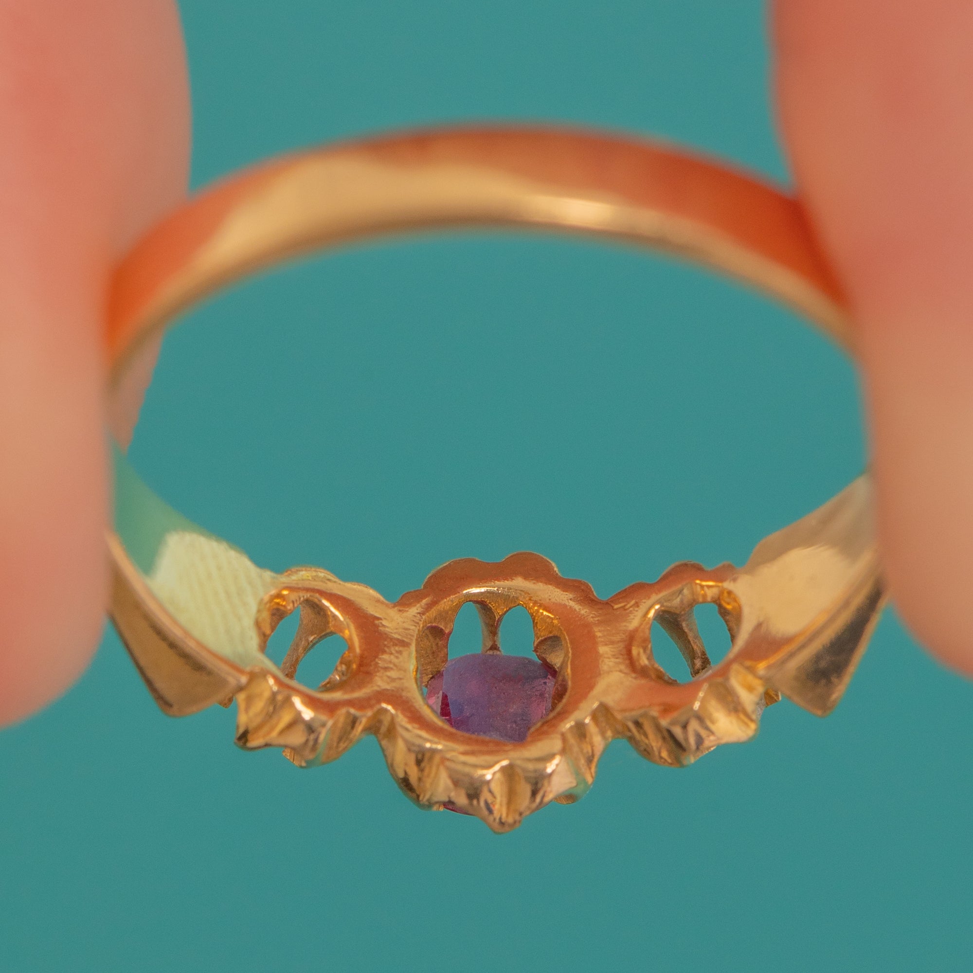 MATERIALS: Tests as 18ct Gold, Natural Ruby (0.25ct), Old Mine Cut-Diamonds (0.06ct).