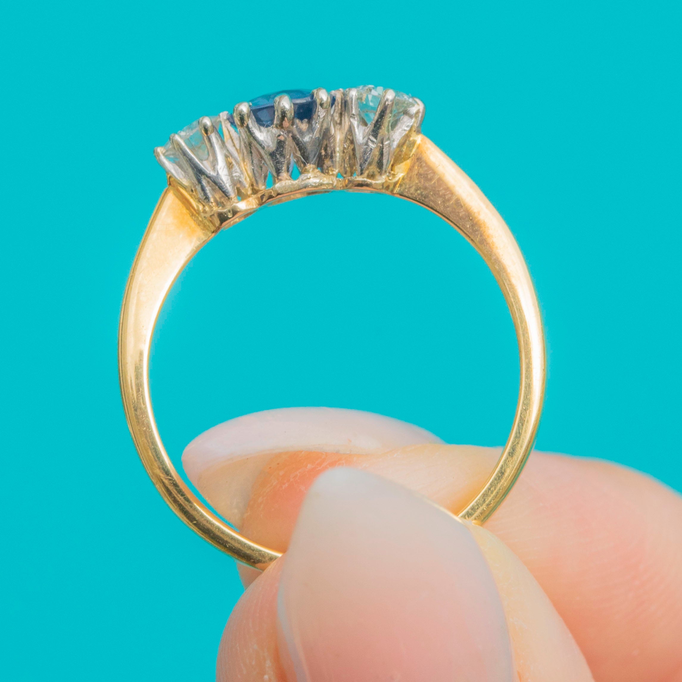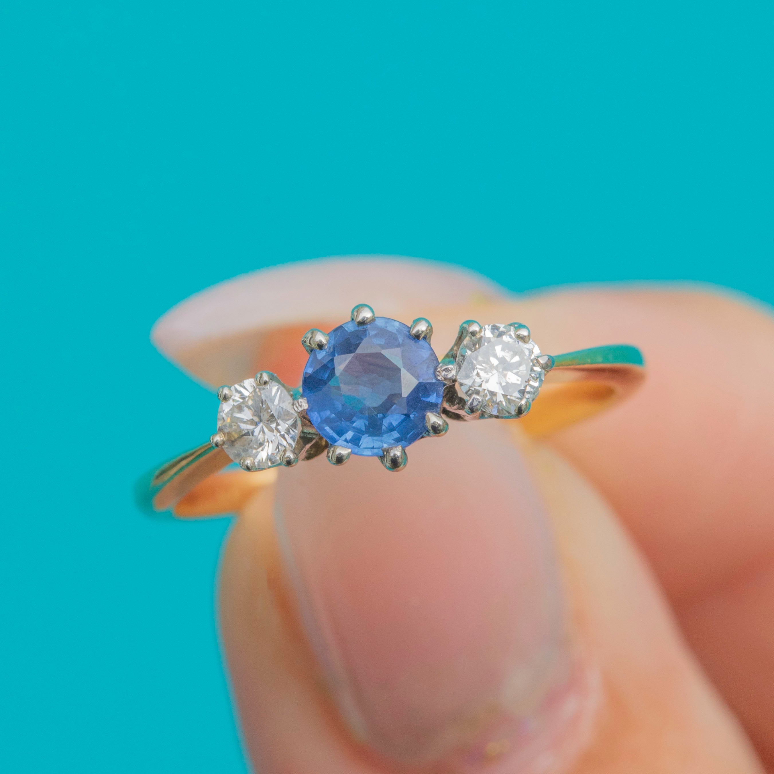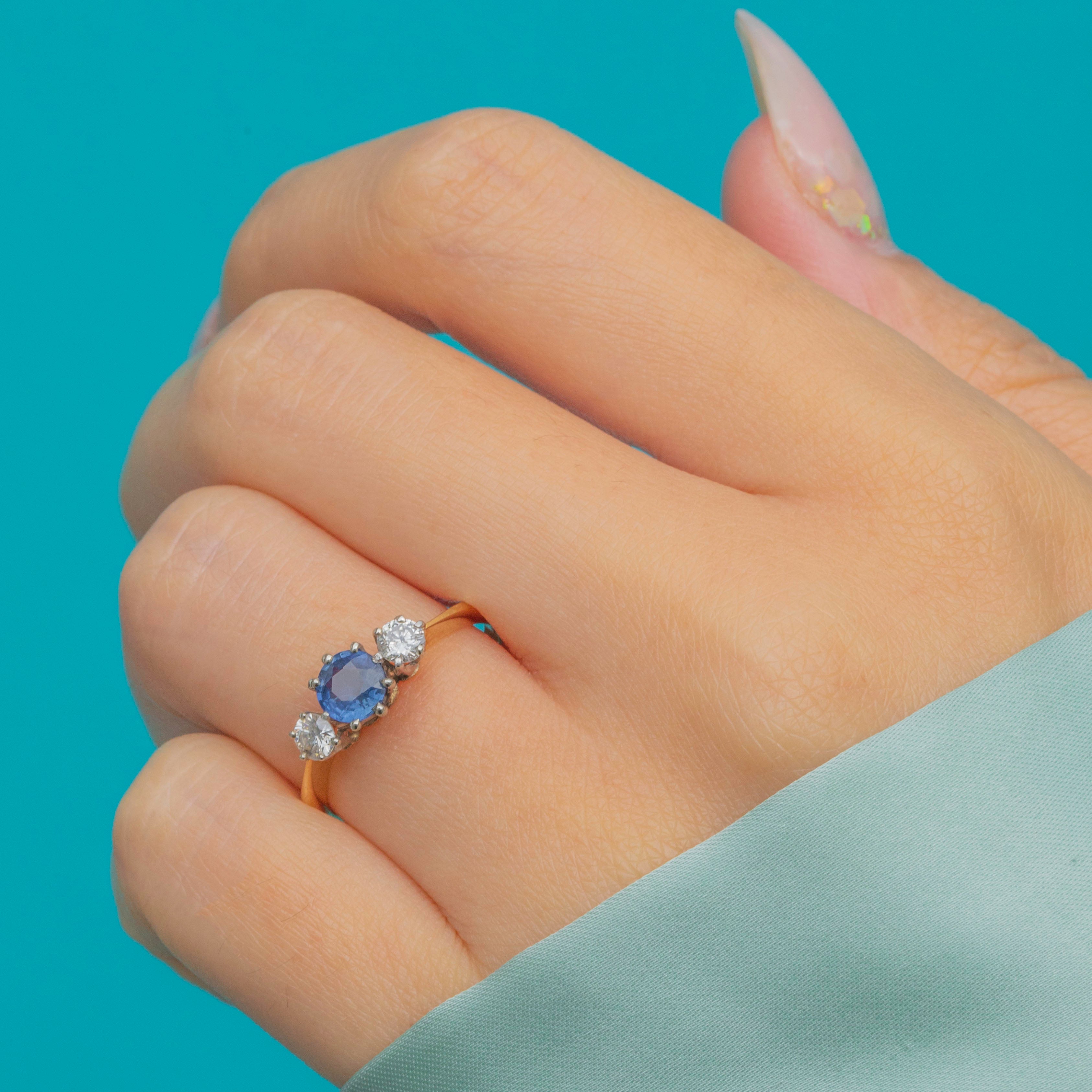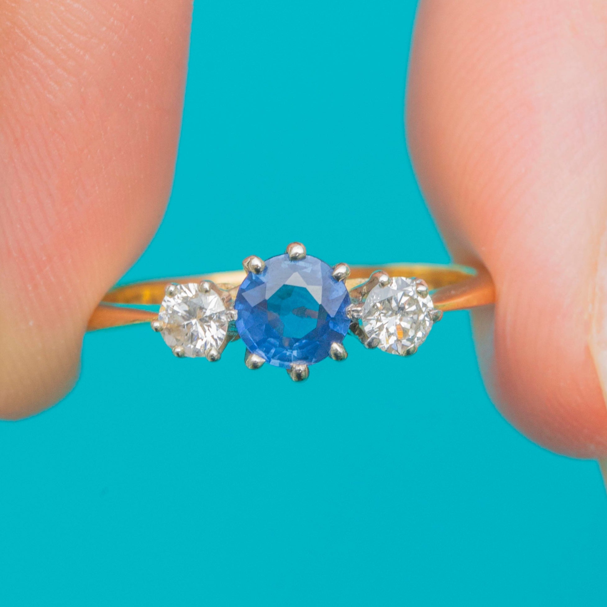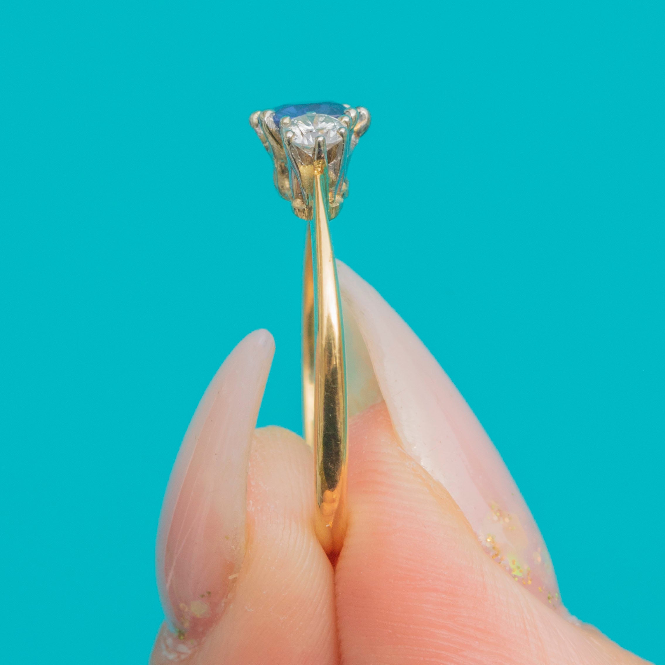 Here we have a classic antique trilogy ring in rich 18ct Gold, set with a vivid natural Sapphire between two bright, lively natural Diamonds. The sleek six-claw centre and neat shoulder stones create a beautifully balanced three-stone silhouette that’s timeless and elegant.
