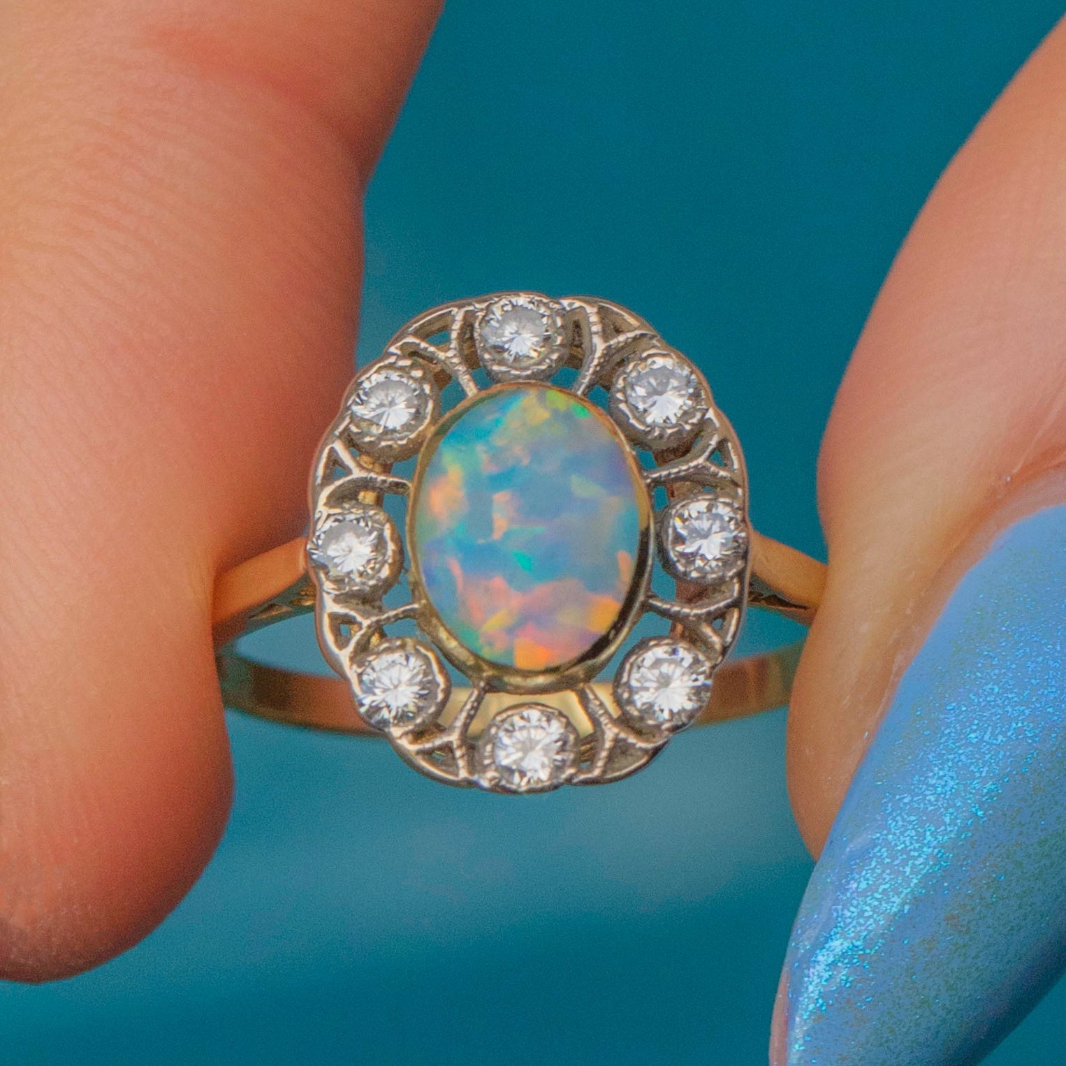VERY GOOD: With a robust shank and secure settings, this 18ct Gold Opal Diamond cluster ring is in beautiful condition! The Opal is spectacular and free from any chips or scratches, with only minor wear around the settings commensurate with age. The Diamonds are bright, securely set, and free from any fleabites. Her hallmarks have slightly worn over the years, but we can still accurately date her to 1987. All in all, a tremendous ring ready to be loved for another lifetime.