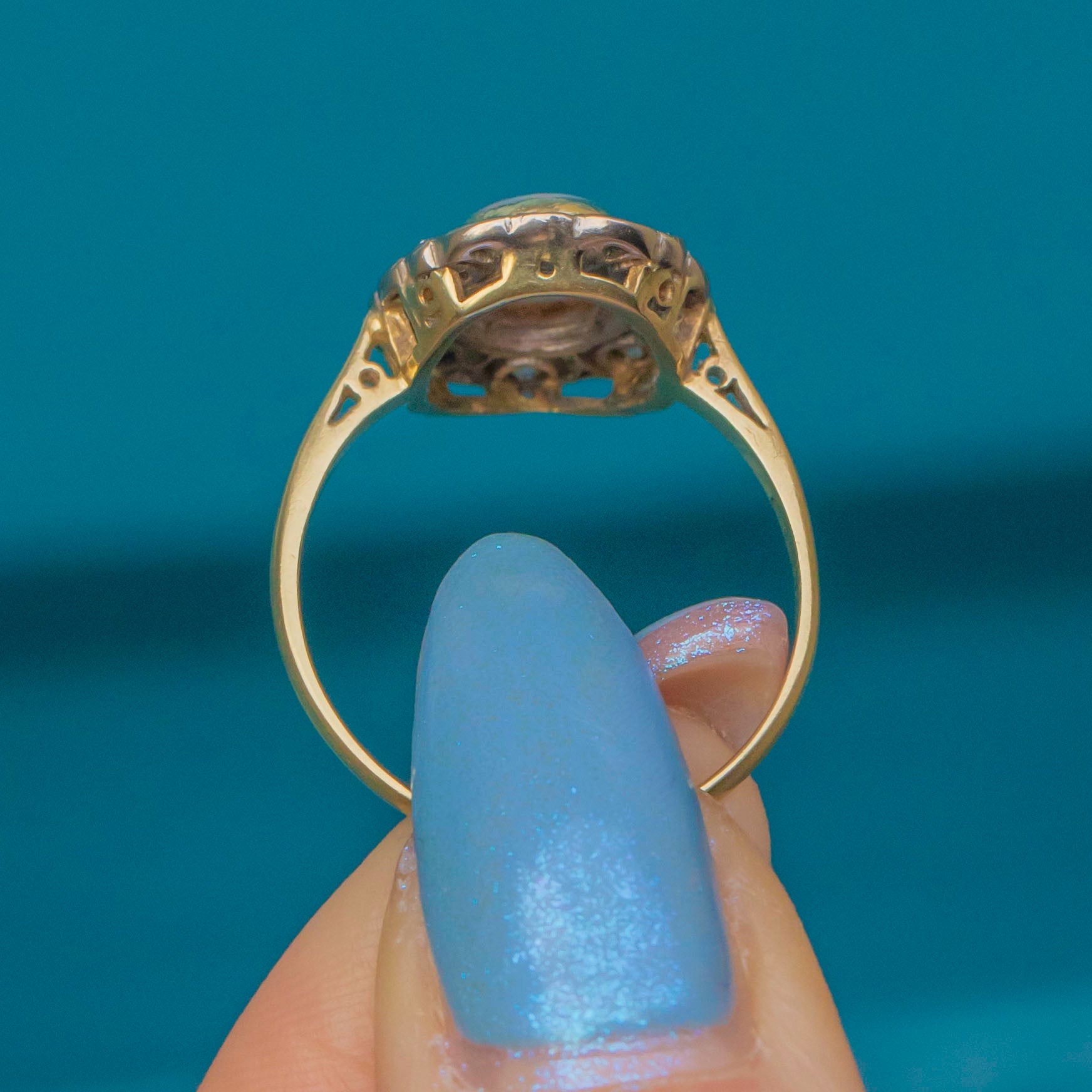 The smooth, buttery 18ct Gold band glides onto your hand a dream, securely holding her cluster in the centre of your finger. Every jewellery box deserves a plethora of opulence, and with this ring offering both Opals and dazzling Diamonds, this vintage cluster ring possesses one of the most splendorous duos there is to offer!