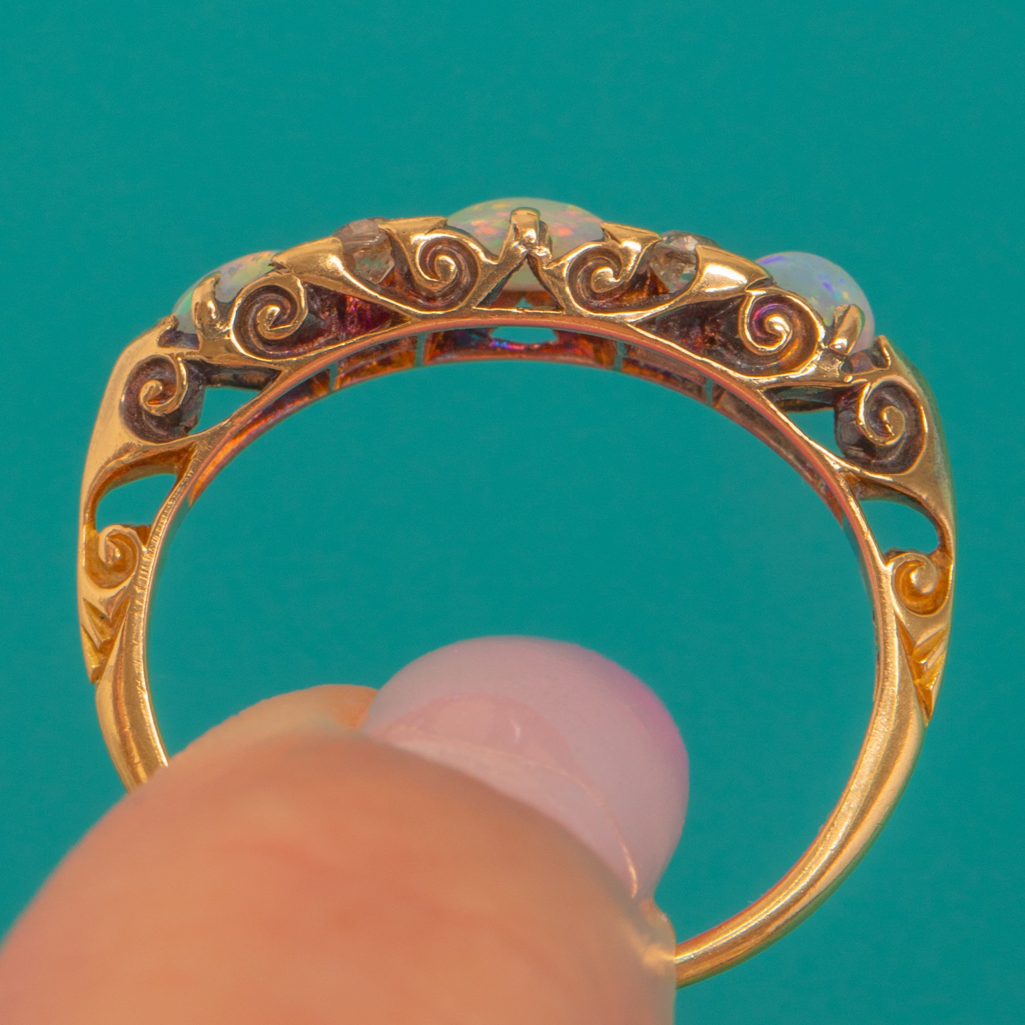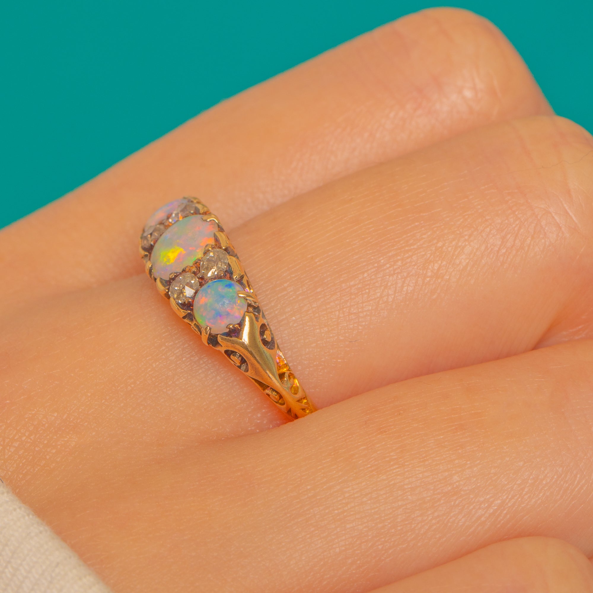 EXCELLENT: Opals and Diamonds are bright and securely set with minimal age-related surface wear visible. The 18ct Gold setting and decorative gallery are crisp with light, sympathetic wear. The band is slightly oval from a past downsizing, with no issues to wear or enjoyment.