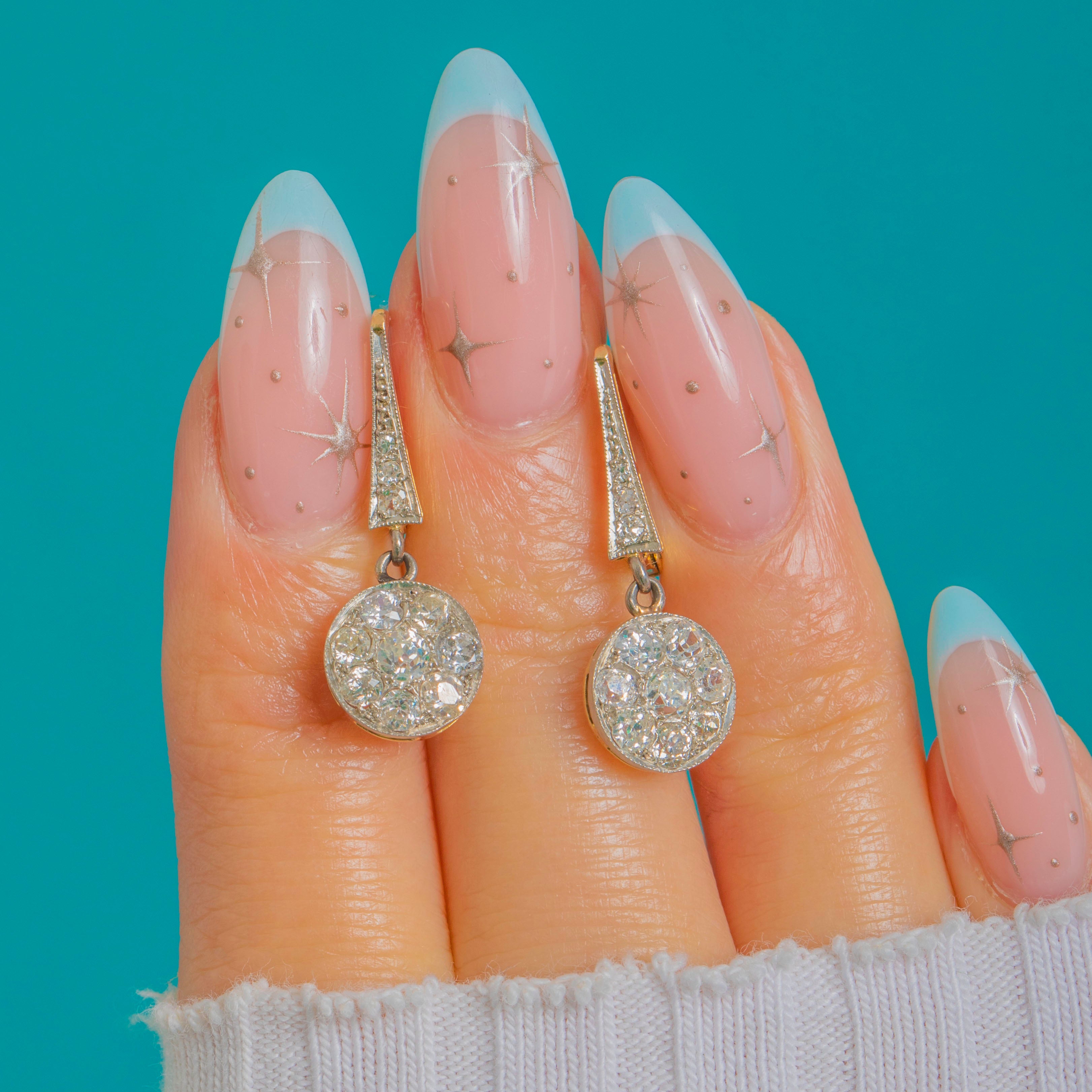 Set throughout with bright, high-crowned old mine-cut Diamonds, the earrings sparkle with a lively, antique charm. The articulated design lends graceful movement, while the crisp hand-finished settings and milgrain beading speak to the craftsmanship of the era—timeless, feminine and effortlessly wearable.