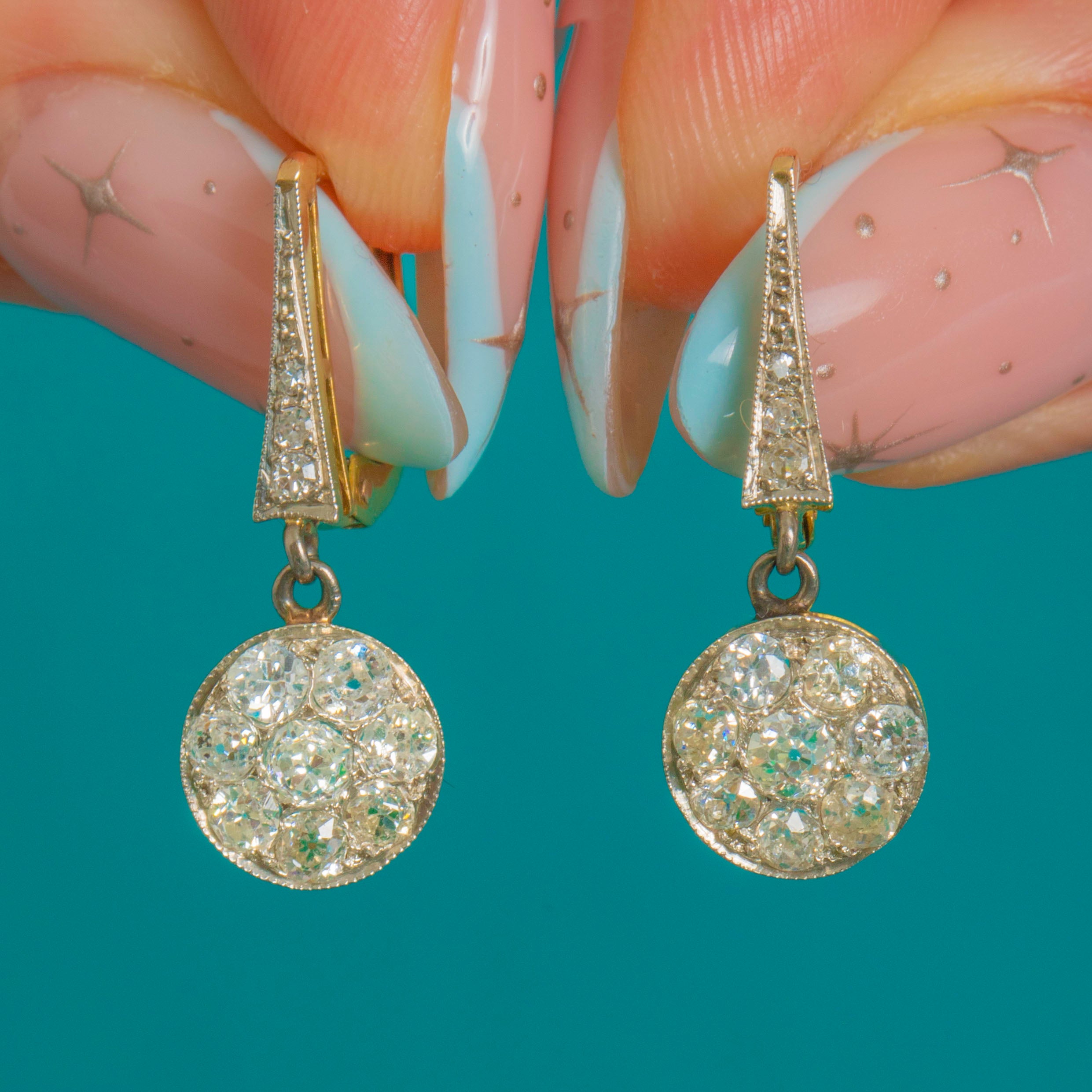 Elegant and beautifully refined, these Art Deco Diamond cluster drop earrings marry Platinum’s icy sheen with the warmth of 18ct Gold. A tapered pavé-set surmount leads to a classic round “daisy” cluster, each edge finished with fine milgrain for that exquisite early-20th-century finesse. The white-topped over yellow construction gives a subtle two‑tone glow that feels both delicate and luxurious.