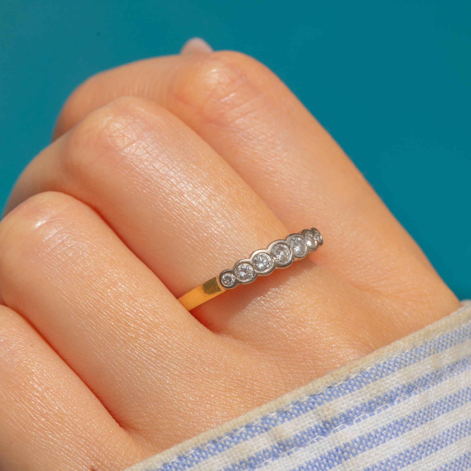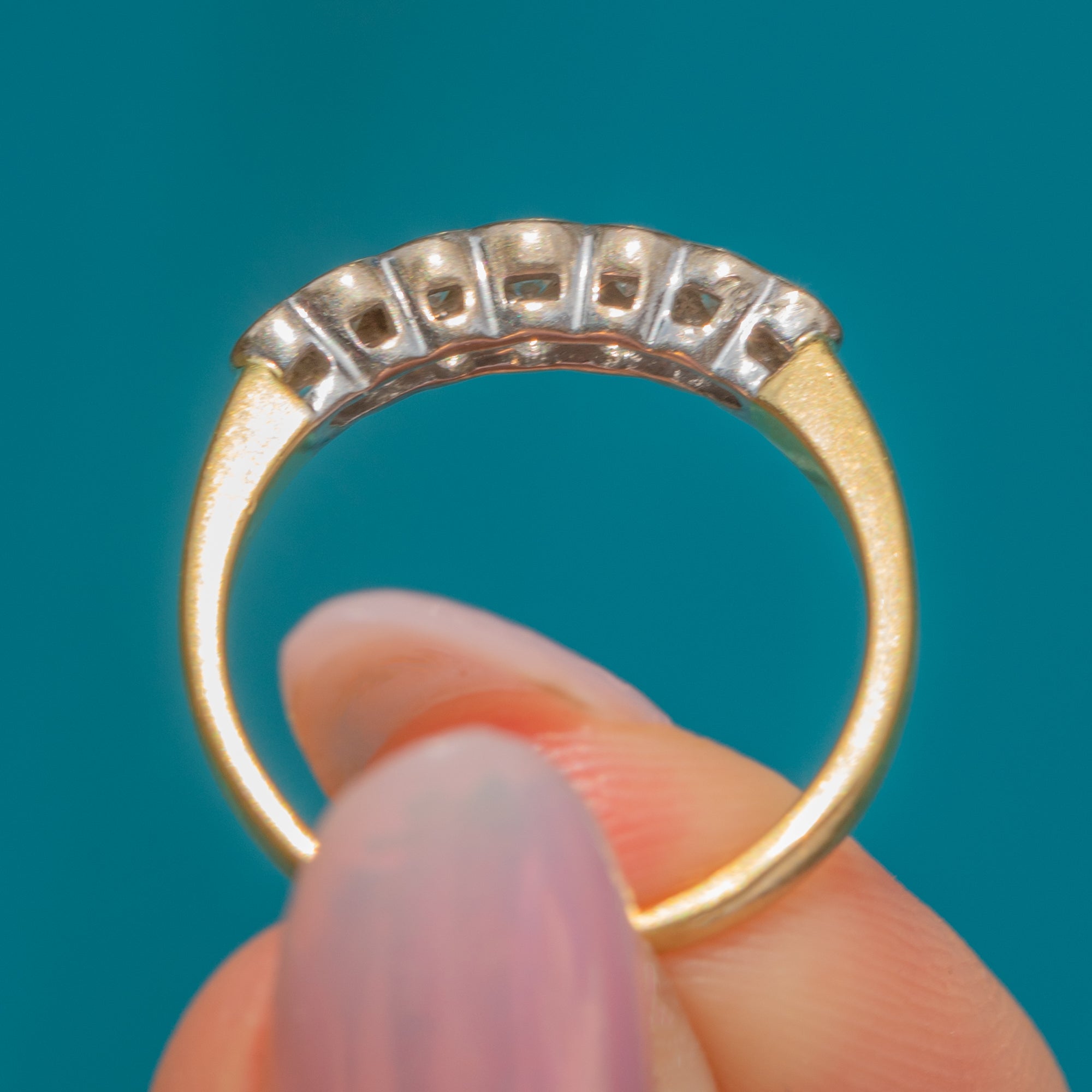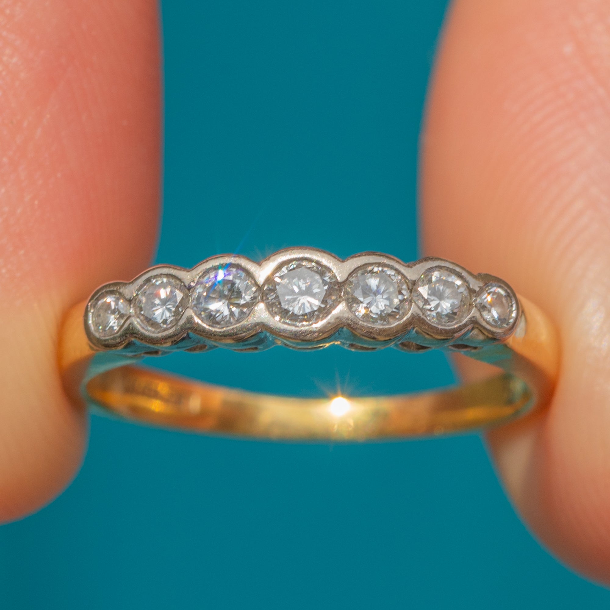 EXCELLENT: A stunning 18ct Gold Diamond ring in excellent vintage condition. All seven scintillating Diamonds are securely set and free from fleabites. The 18ct Yellow and Platinum are in glorious condition, free from dings, dents or scratches.
