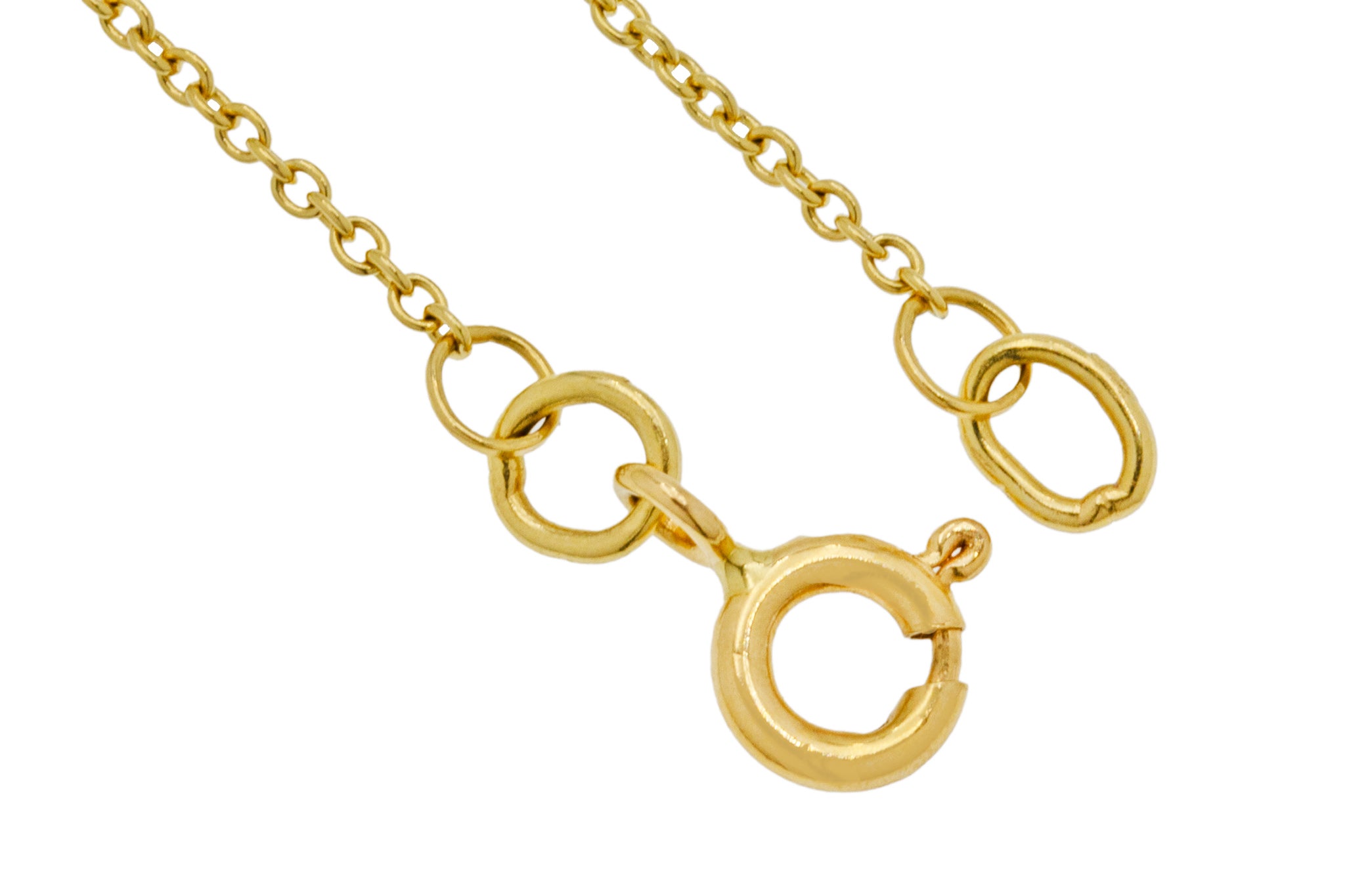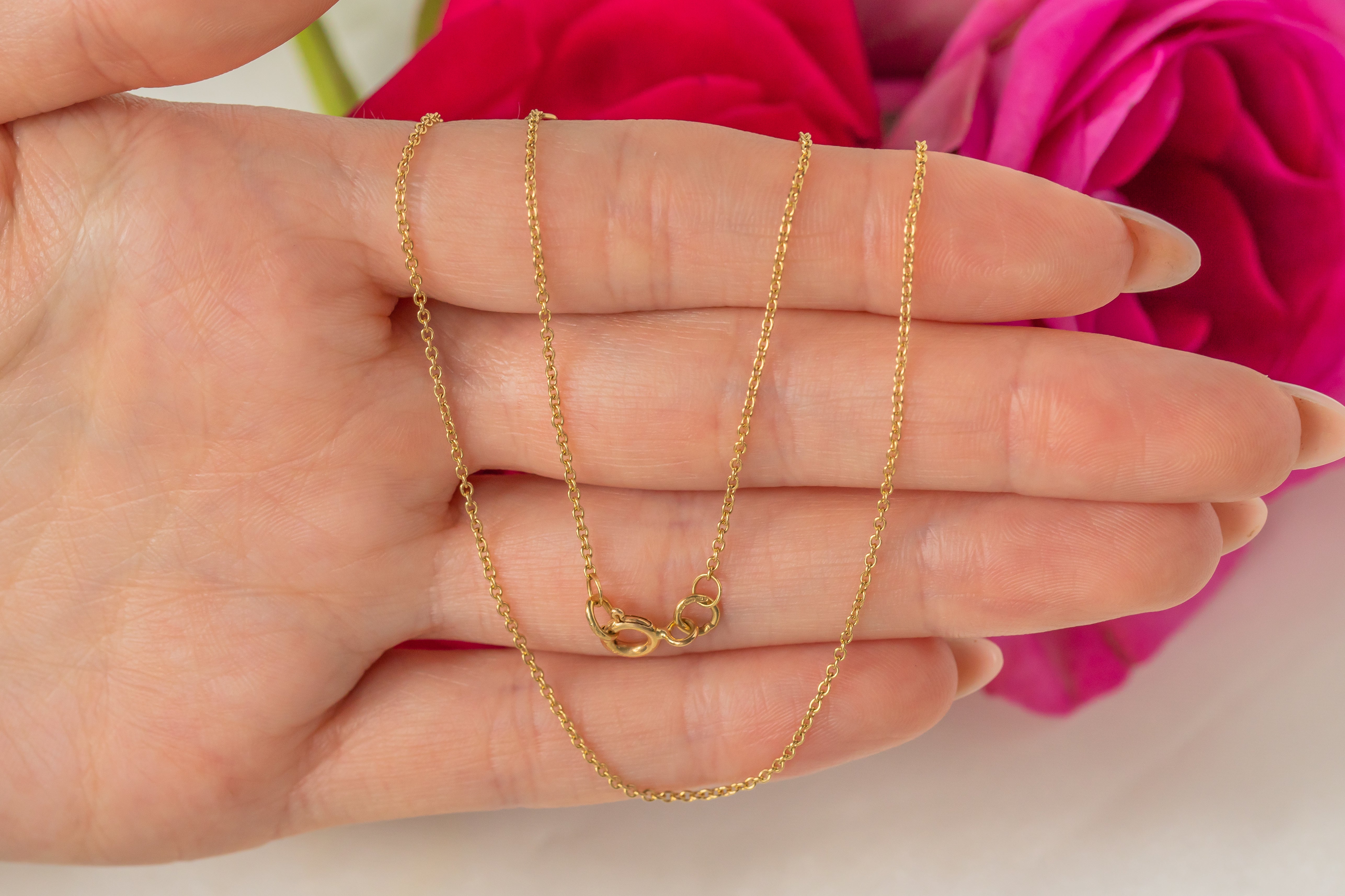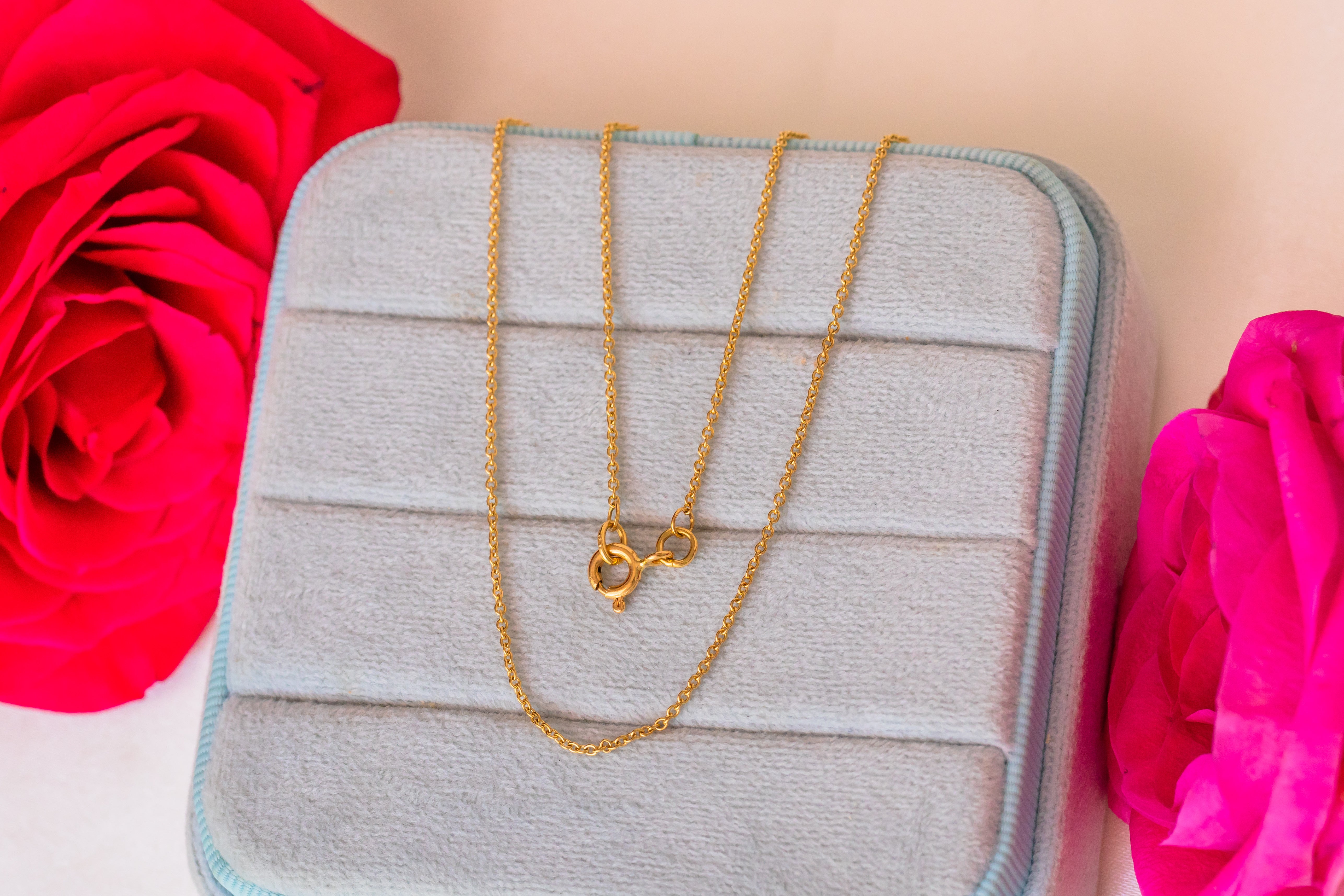 EXCELLENT. This 18ct Gold skinny pendant chain is in excellent condition. This piece has so much wear potential and hasn't aged a day since her mid-century start in life. The links are firmly attached and the bolt ring is in perfect working order, allowing you to wear it with confidence.