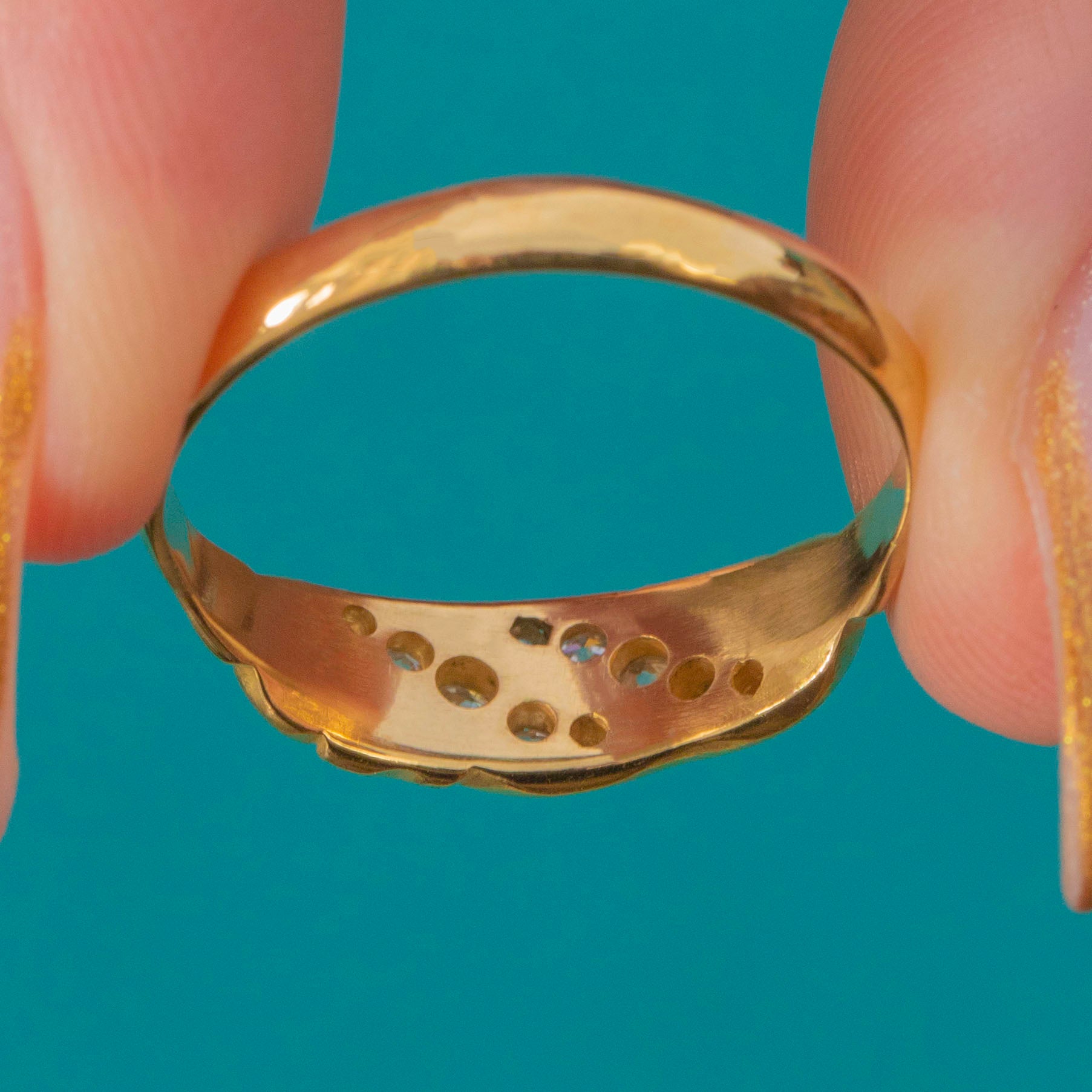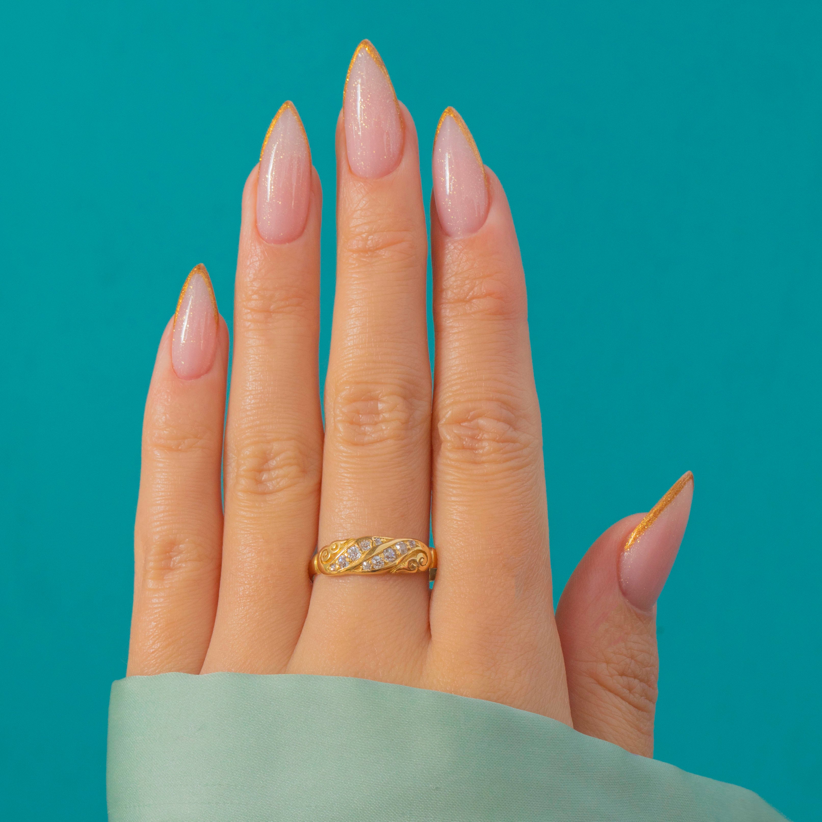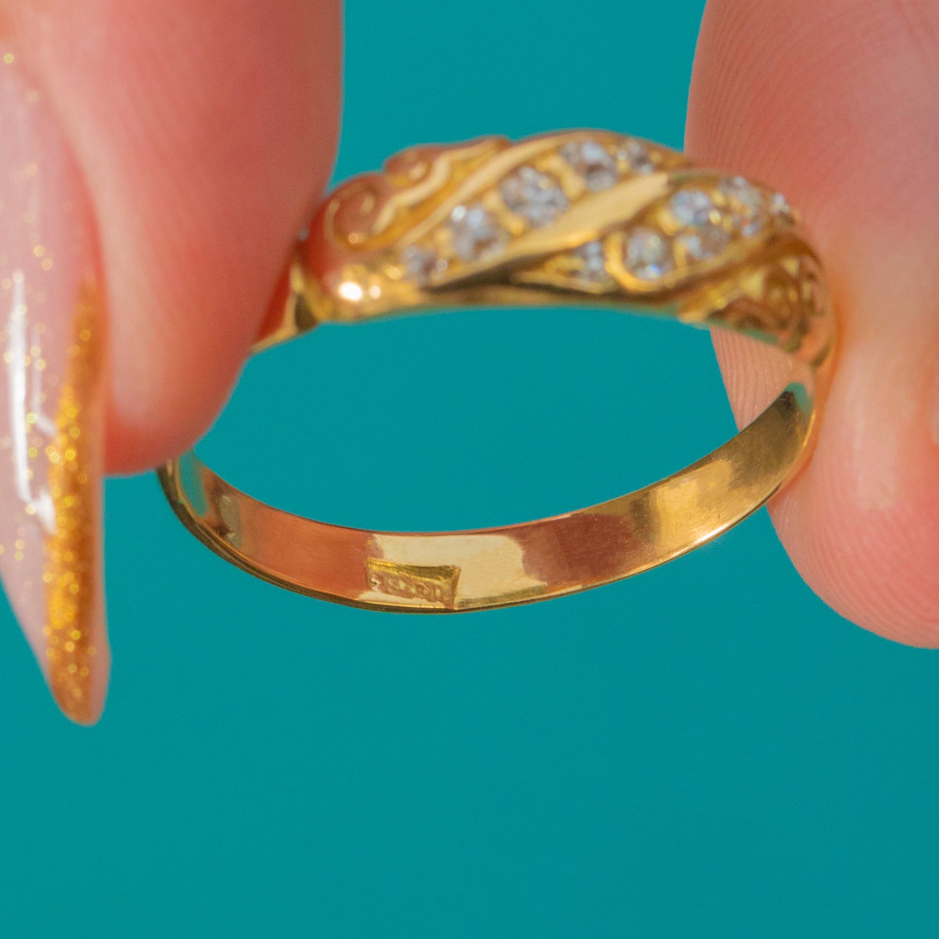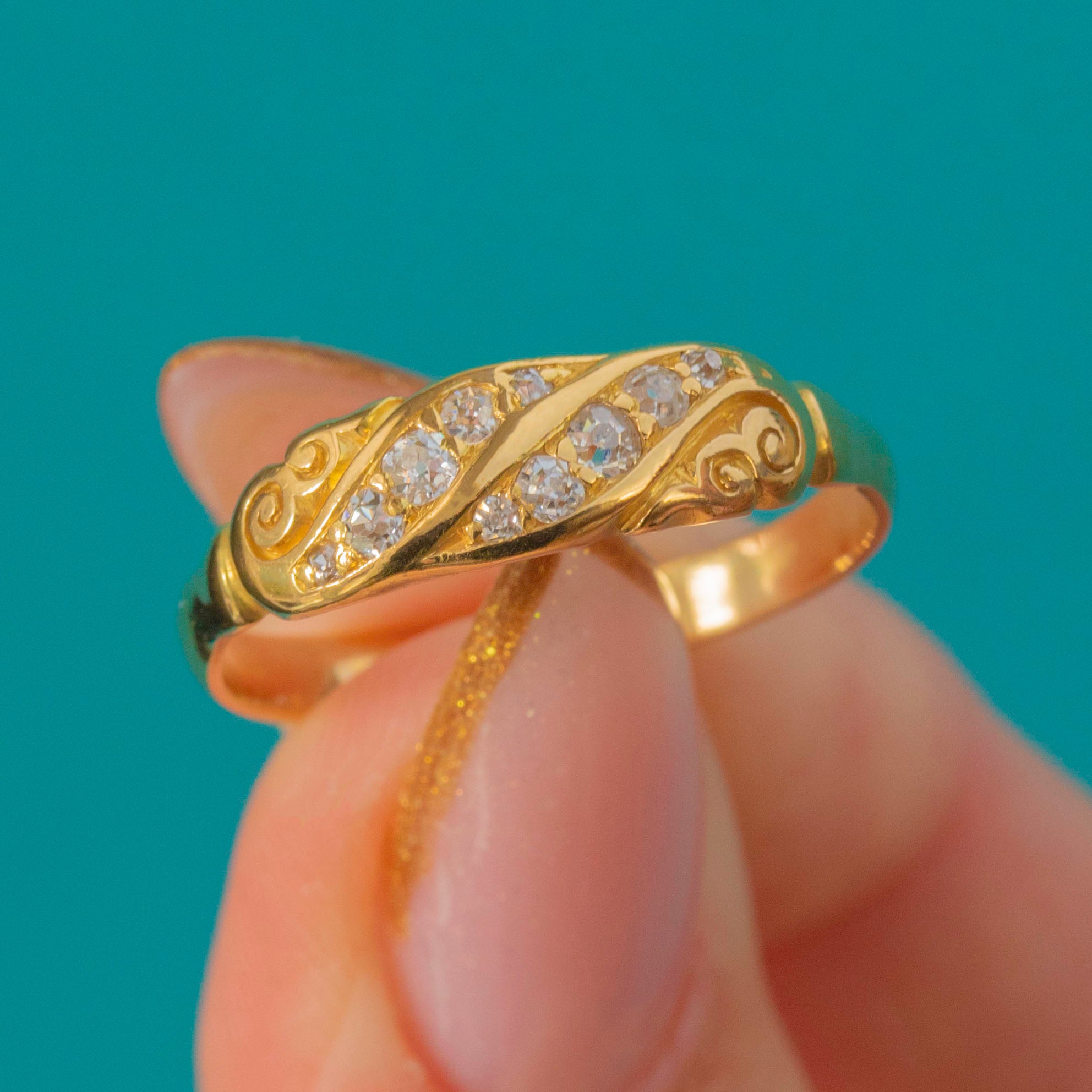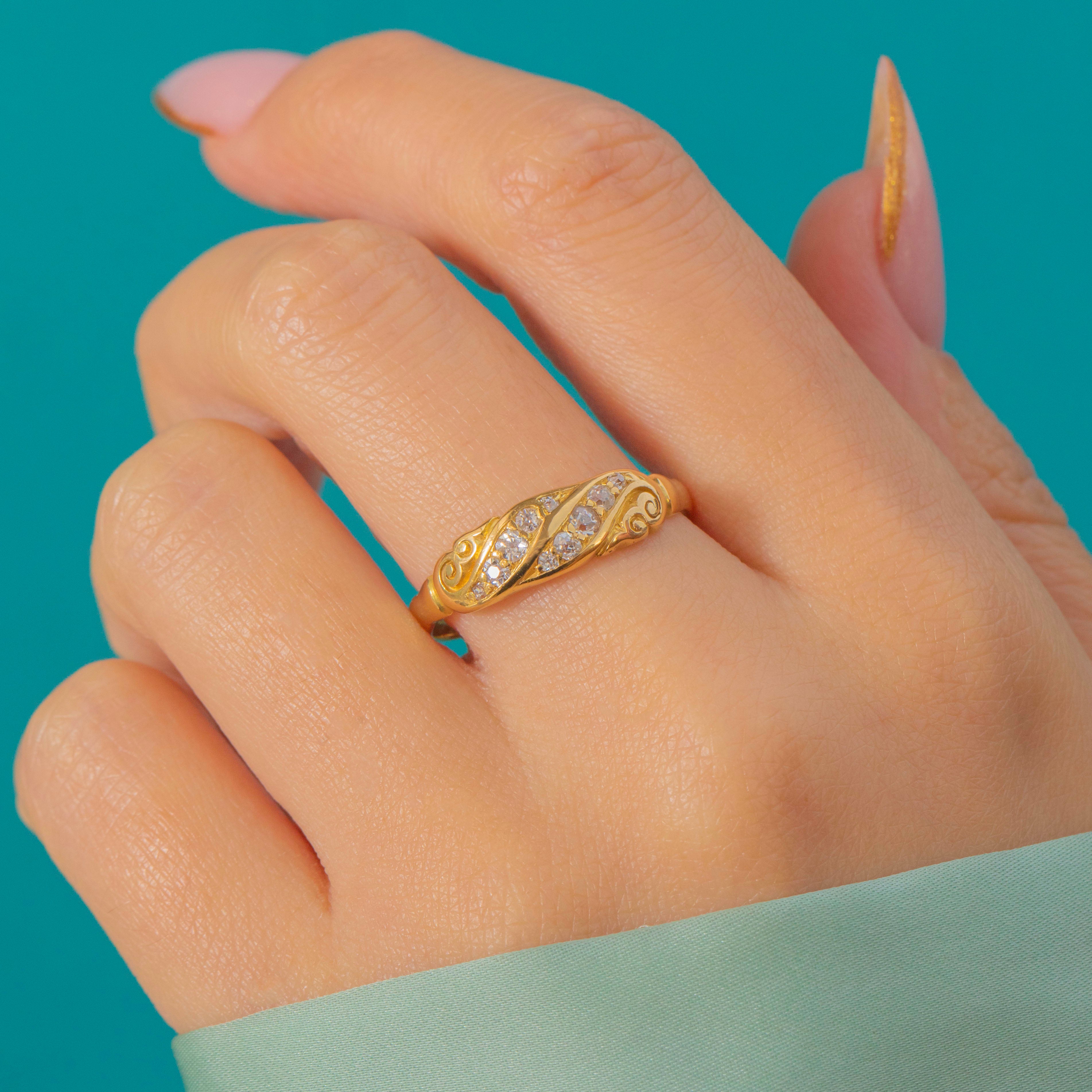 The Diamonds total approximately 0.10ct, catching the light beautifully against the buttery antique Gold. A classic and graceful piece, this ring is perfect worn alone or stacked with other antique favourites for a timeless look.