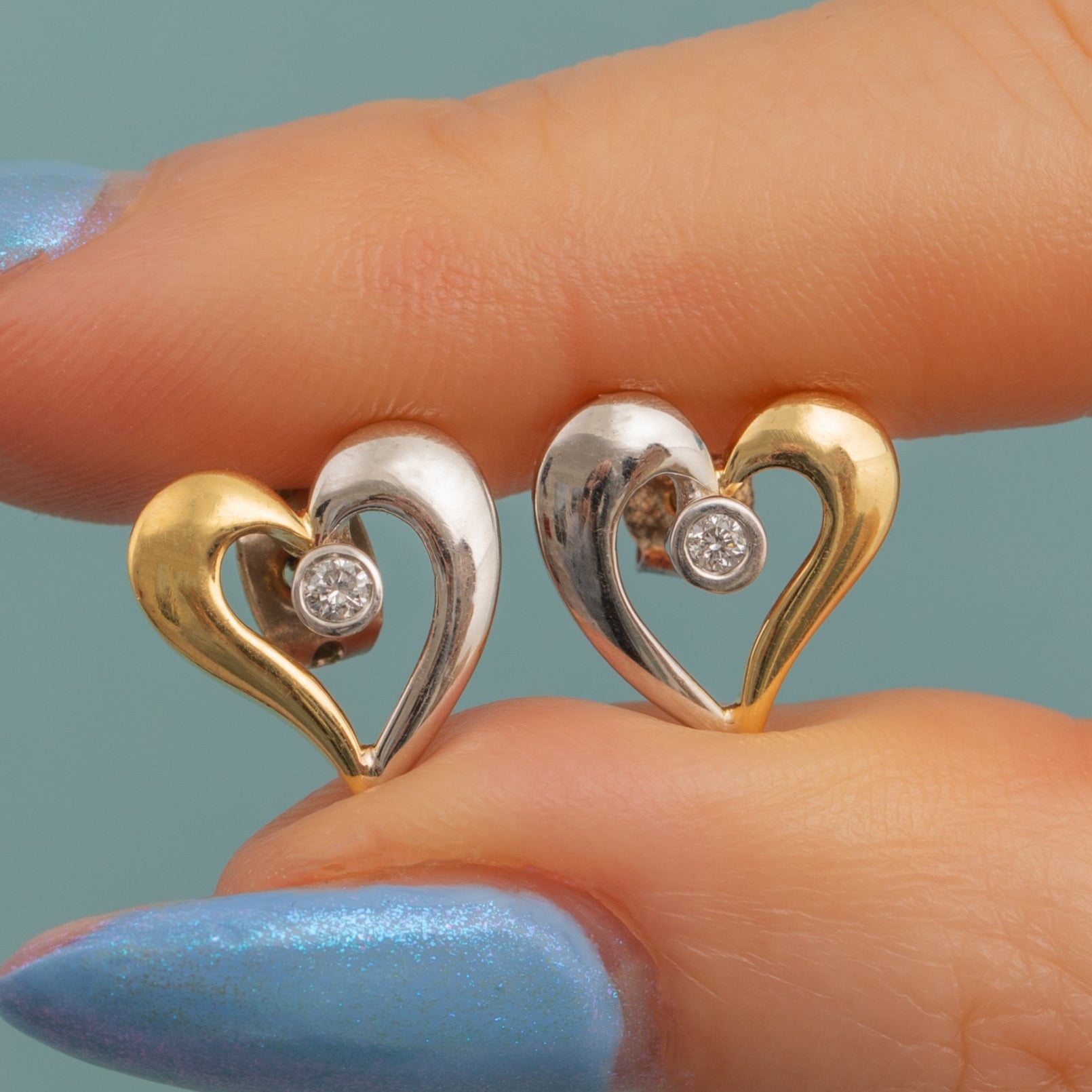 EXCELLENT: These 18ct Gold witches heart Diamond studs are in excellent condition. Her Gold is lustrous and free from any evident signs of wear. Each Diamond sits securely within her bezel setting and with secure butterfly backs, you can wear these earrings with confidence.