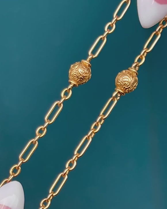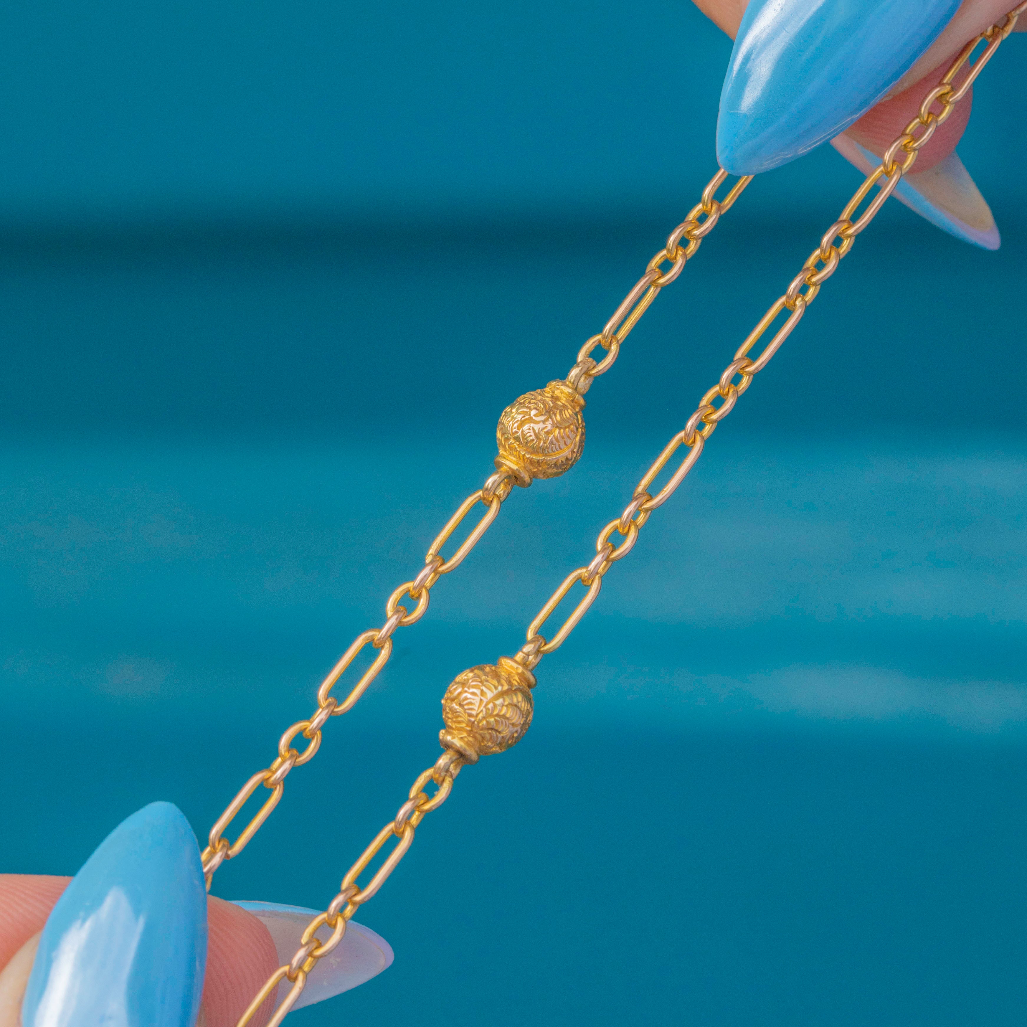 Crafted from glossy 9ct Gold, this Victorian chain features dainty trombone links stationed by ornately engraved orbs, adding a lovely texture.