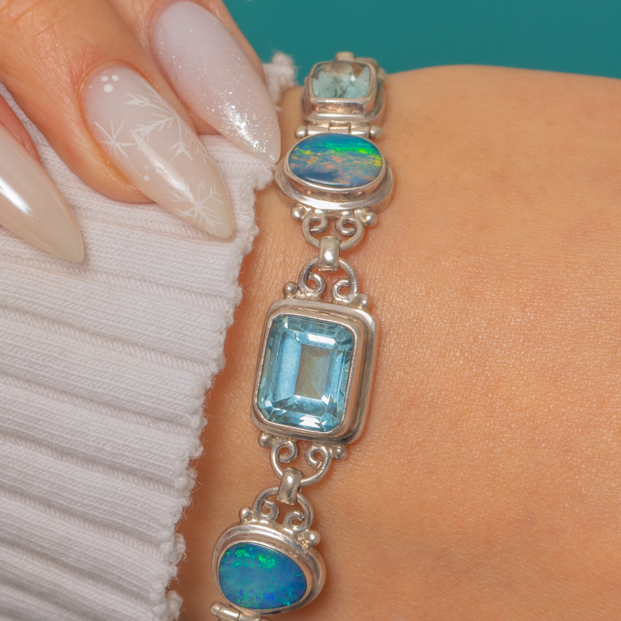 Cool, crystalline Topaz and iridescent Boulder Opal meet in this striking Vintage Sterling Silver bracelet. Sleek bezel-set links flow in an alternating sequence, with sculpted S-scroll connectors and delicate bead accents lending a refined, artisan feel. The Topaz sparkle in icy blue—two cushion cuts flanking a larger rectangular stone—while the oval Opal cabochons glow with blue-green play-of-colour for a captivating contrast.
