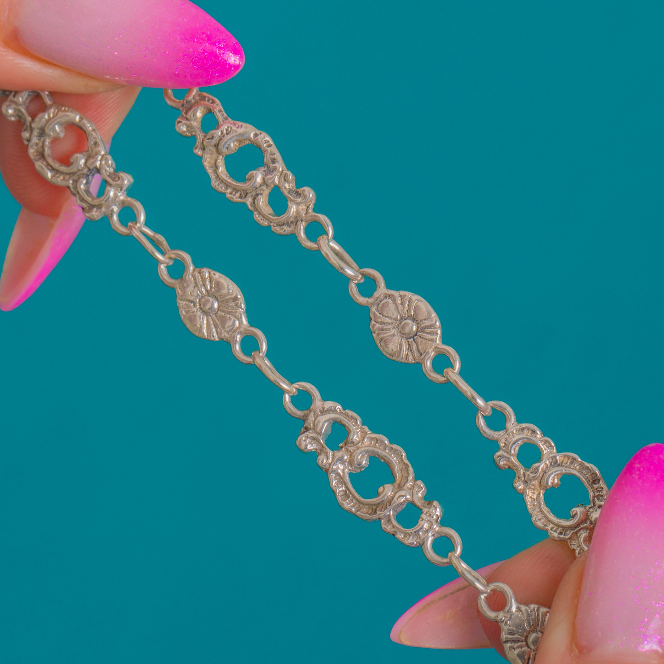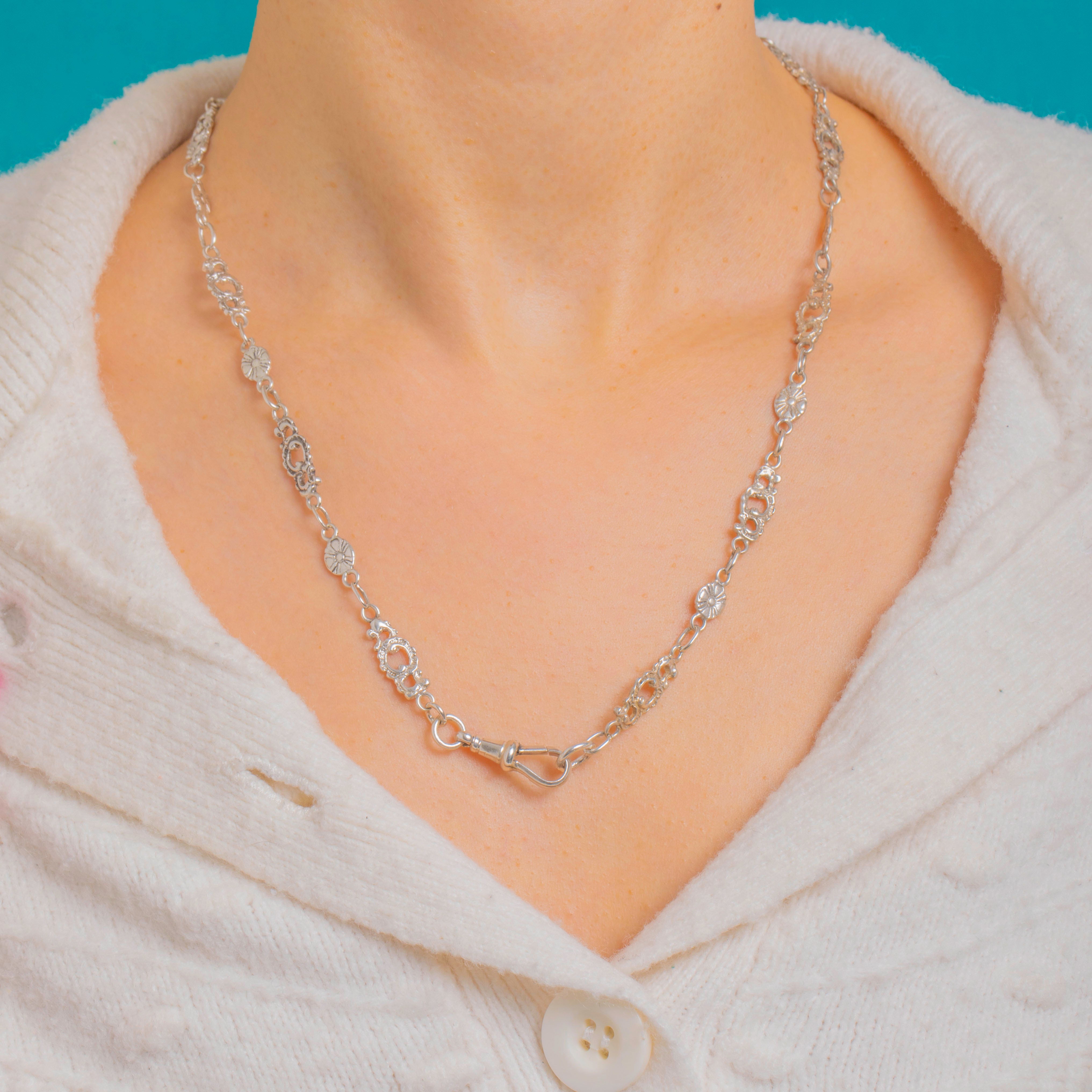Sumptuous and romantic, this Victorian Silver floral chain pairs openwork foliate links with pretty rosette discs for a lace-like, light-catching silhouette. Each articulated section brings delicate movement and texture, creating an ornate, feminine look that feels timeless.