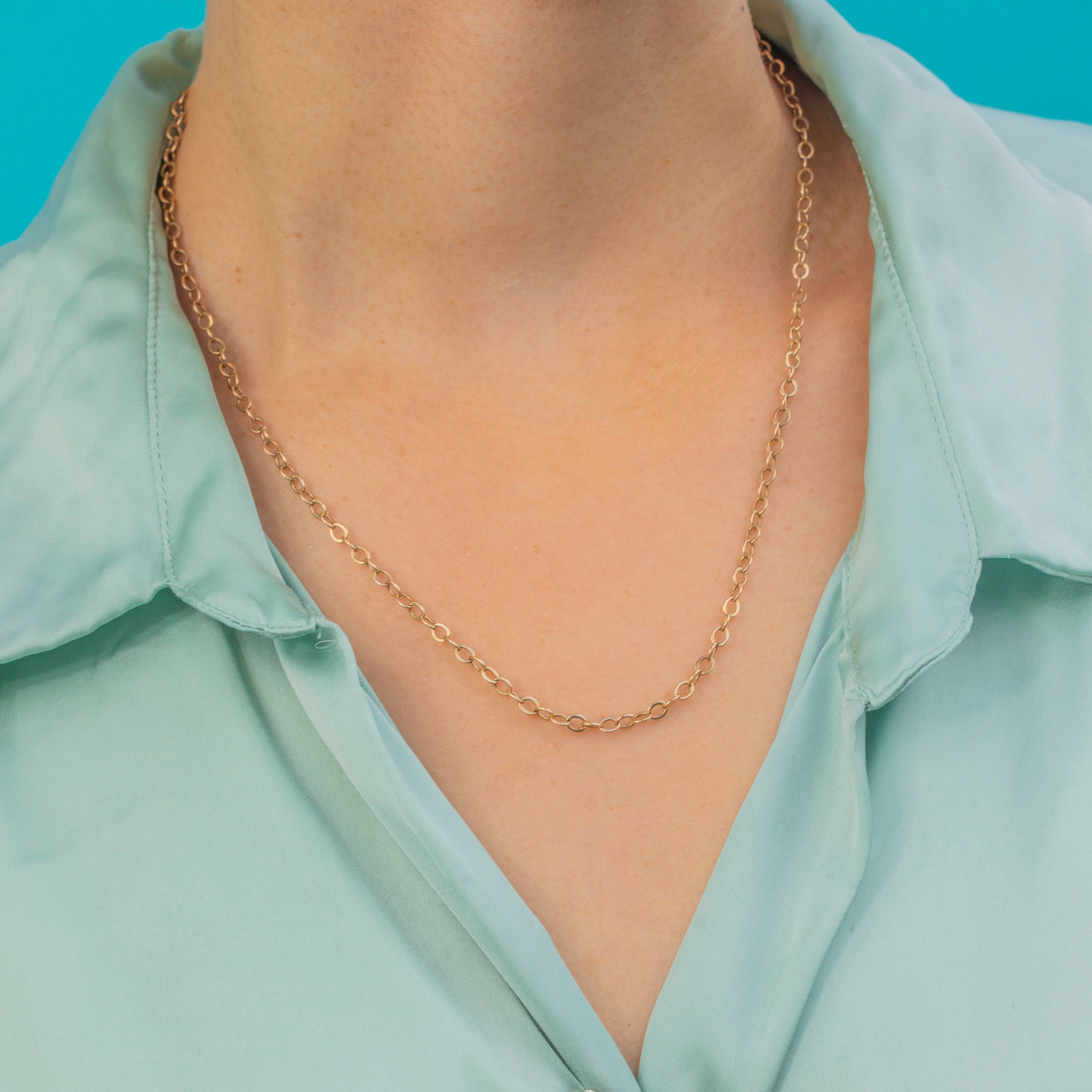A fine Victorian chain crafted in solid 9ct Gold, measuring 24" long. The chain is composed of 3mm round links, offering a classic and versatile design perfect for pairing with pendants, charms, or worn alone for understated elegance.