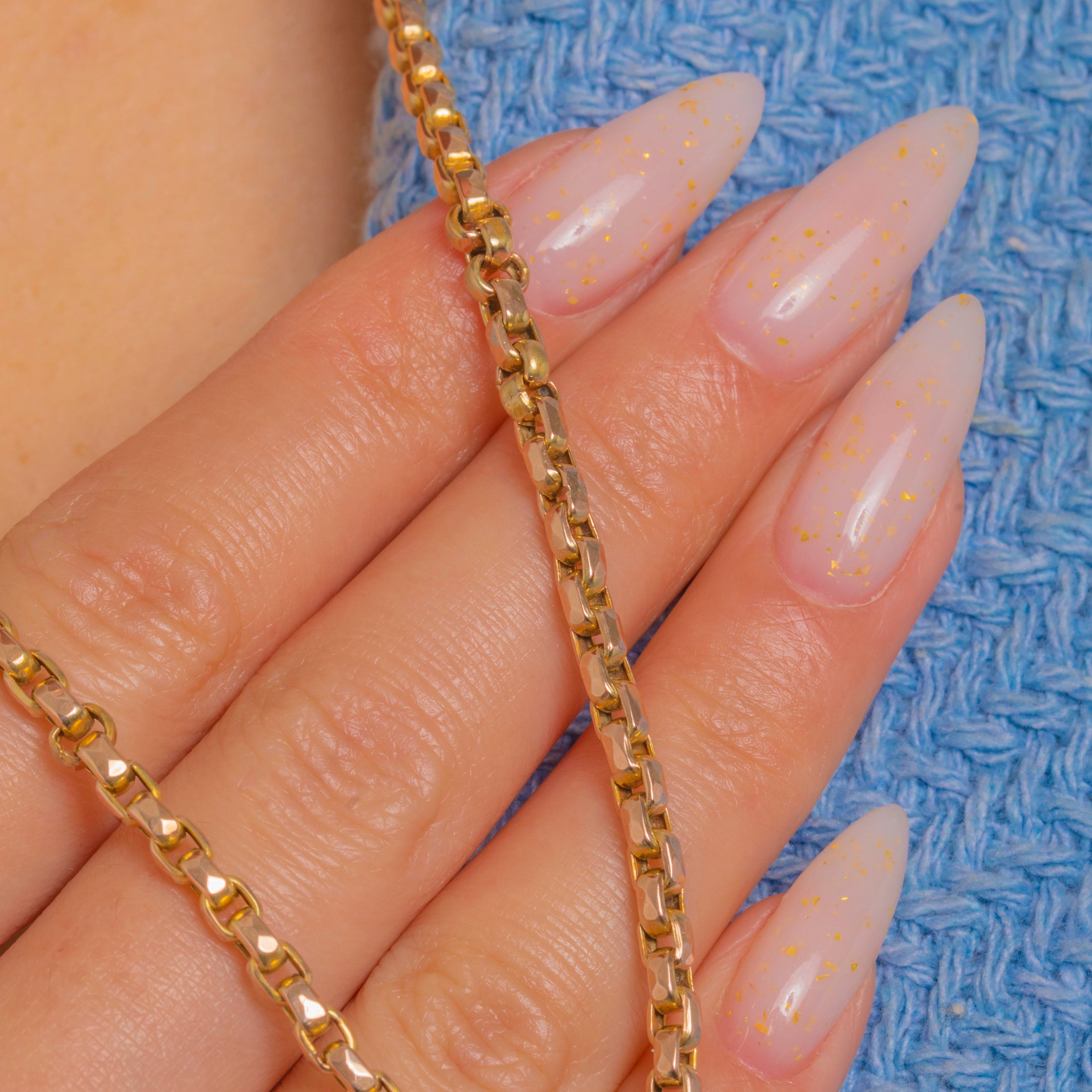 A quintessential Victorian 9ct Gold chain, this versatile necklace is crafted with uniform, faceted geometric links that gleam with a warm yellow hue and subtle rosy undertones. It’s finished with a classic dog-clip clasp with a turned collar, stamped “9CT”, channelling the clean, utilitarian elegance of an Albert chain.