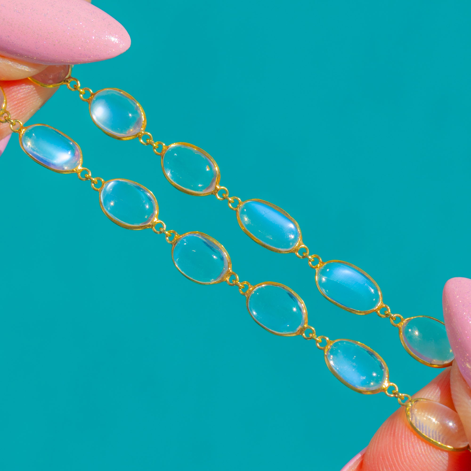 A luminous Edwardian Moonstone rivière necklace in 18ct Gold, composed of graduated oval cabochon Moonstones in elegant bezels. The cabochons glow with a soft, opalescent play of light, offering pearly and aqua flashes that dance across each stone. Refined and fluid, the articulated stations create a graceful, uninterrupted line of colour along the neckline.