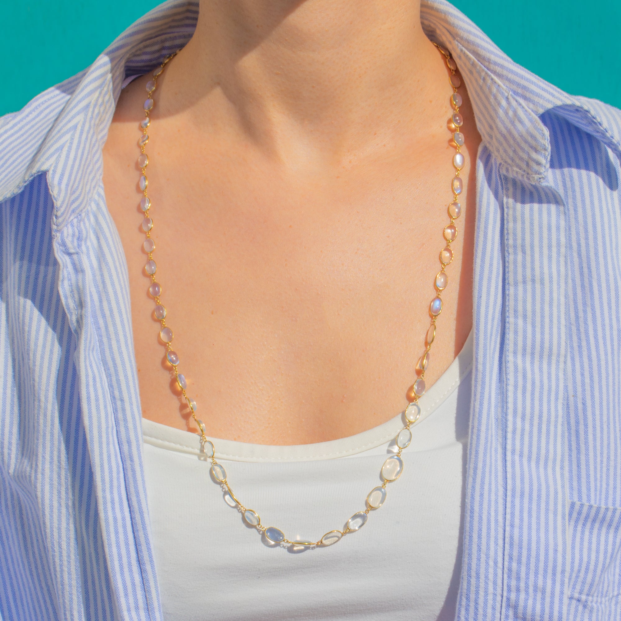 Crafted in rich 18ct Gold with a classic rivière silhouette, this piece showcases approximately 30 carats of Moonstone graduating from 6mm to 12mm. At 26 inches, it layers beautifully or makes a serene statement worn alone—timeless, feminine and exquisitely poised.