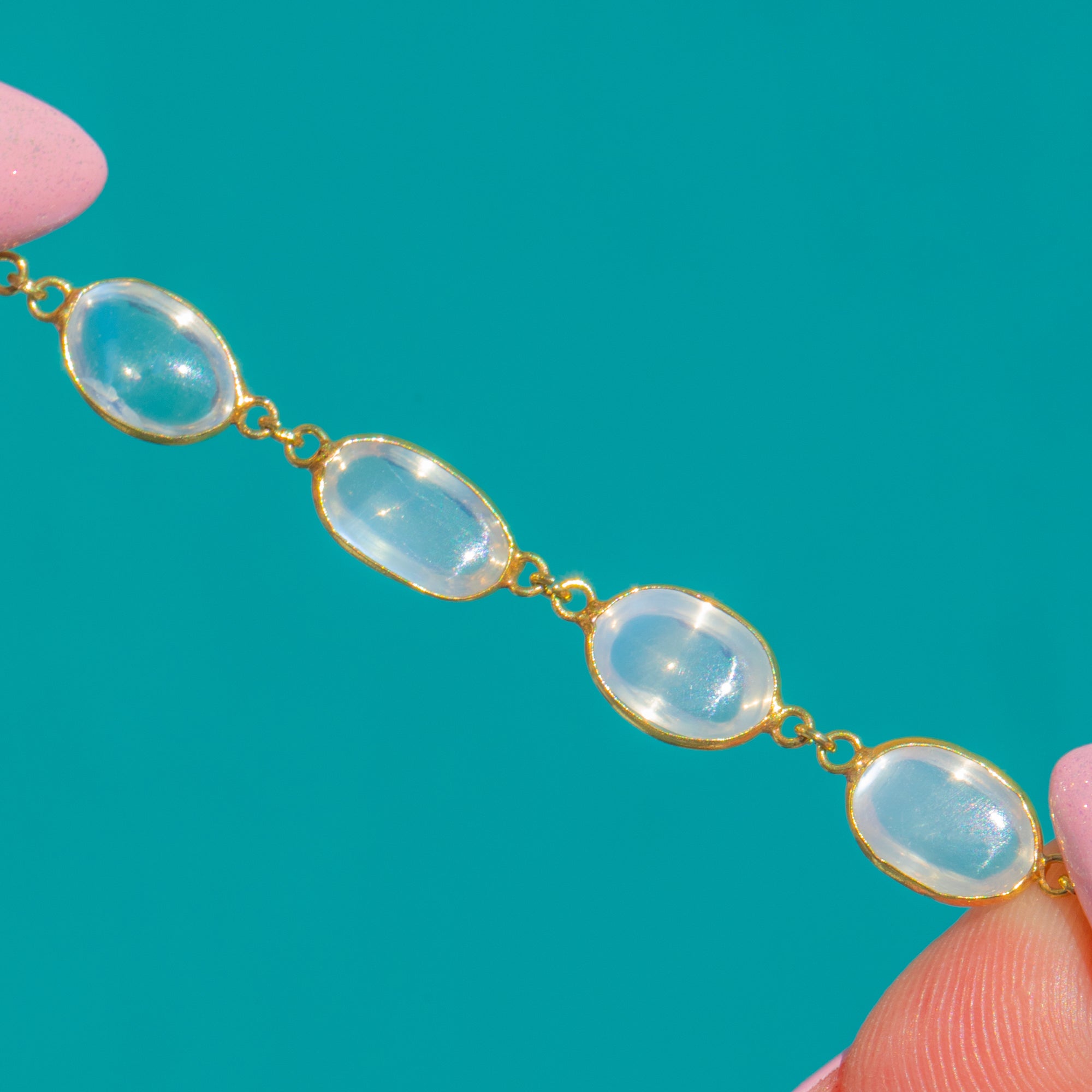 EXCELLENT: The Moonstones are bright and smooth with no chips or scratches noted under close inspection. The 18ct Gold closed bezel settings and articulated links are secure and well-preserved with minimal surface wear consistent with careful use. No visible repairs or alterations.