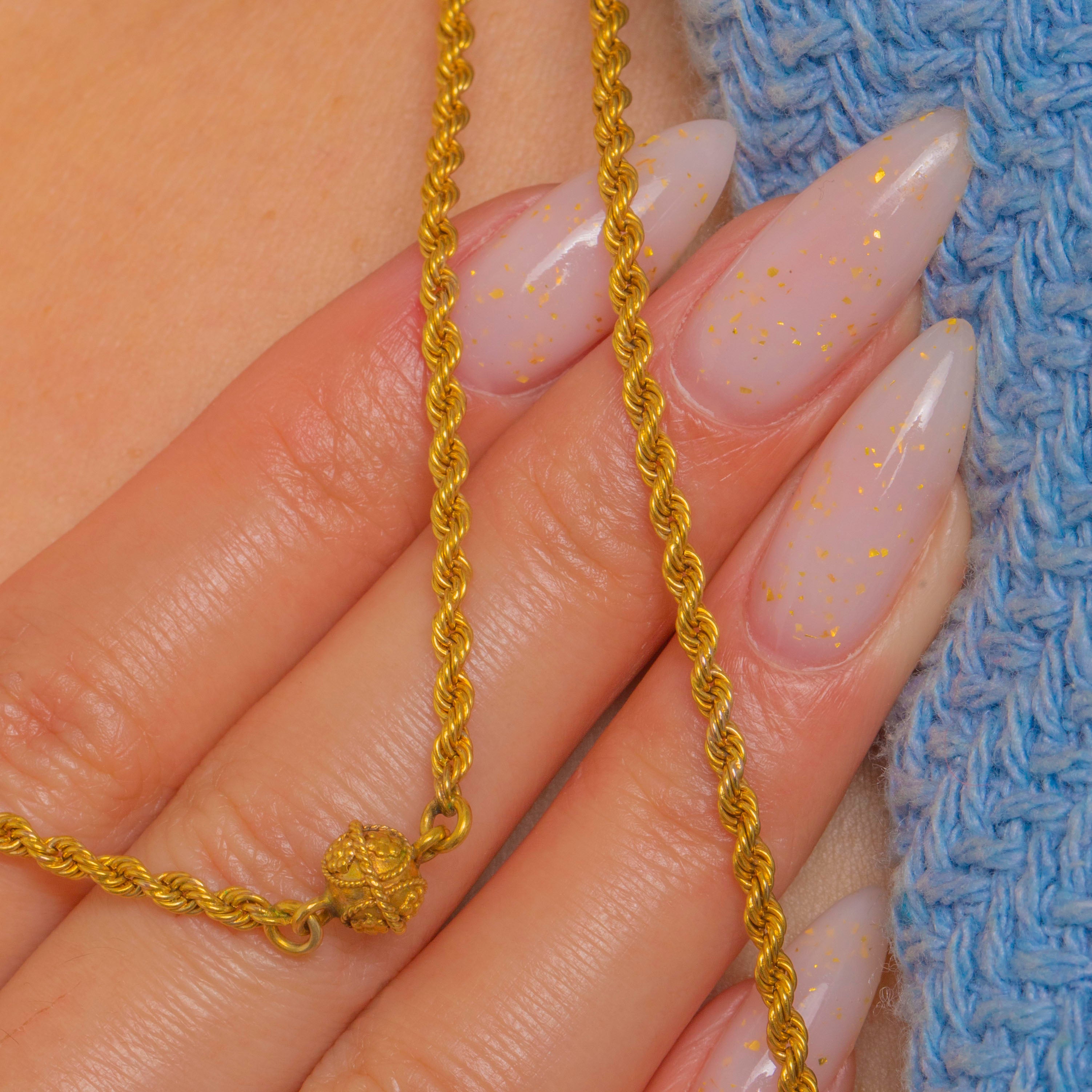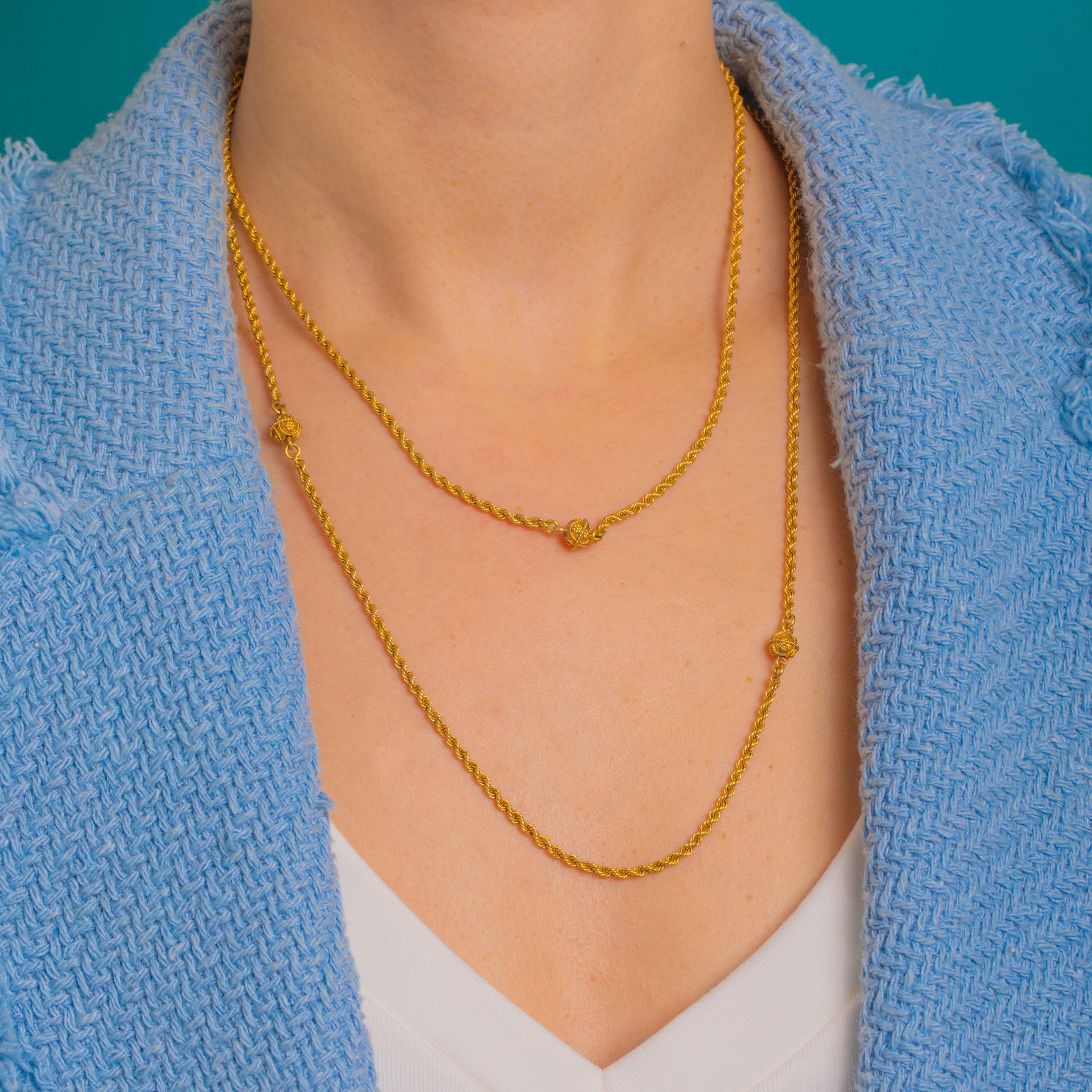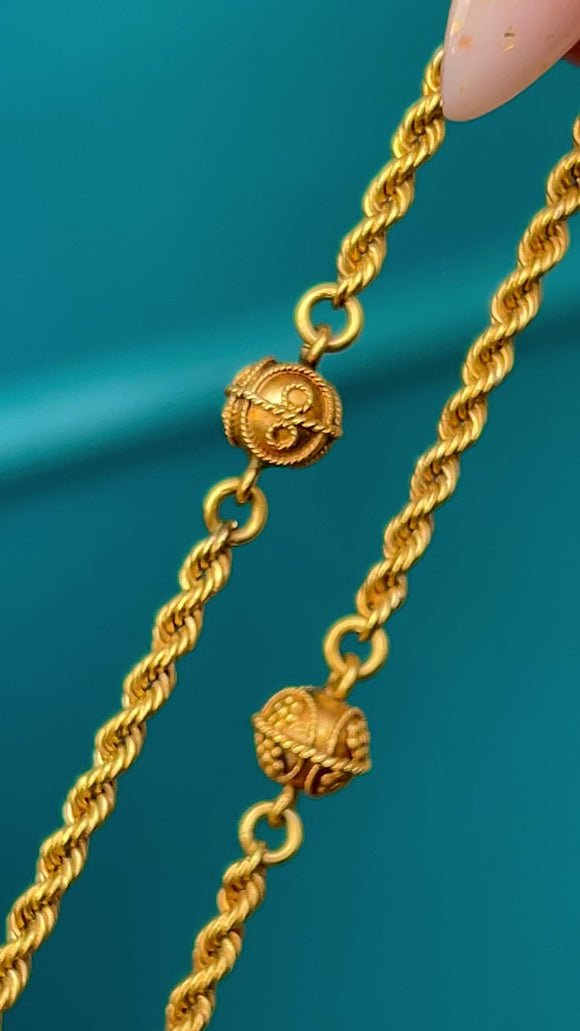48" Bright 15ct Yellow Gold Rope Longuard Chain, Cannetille Orb Terminals