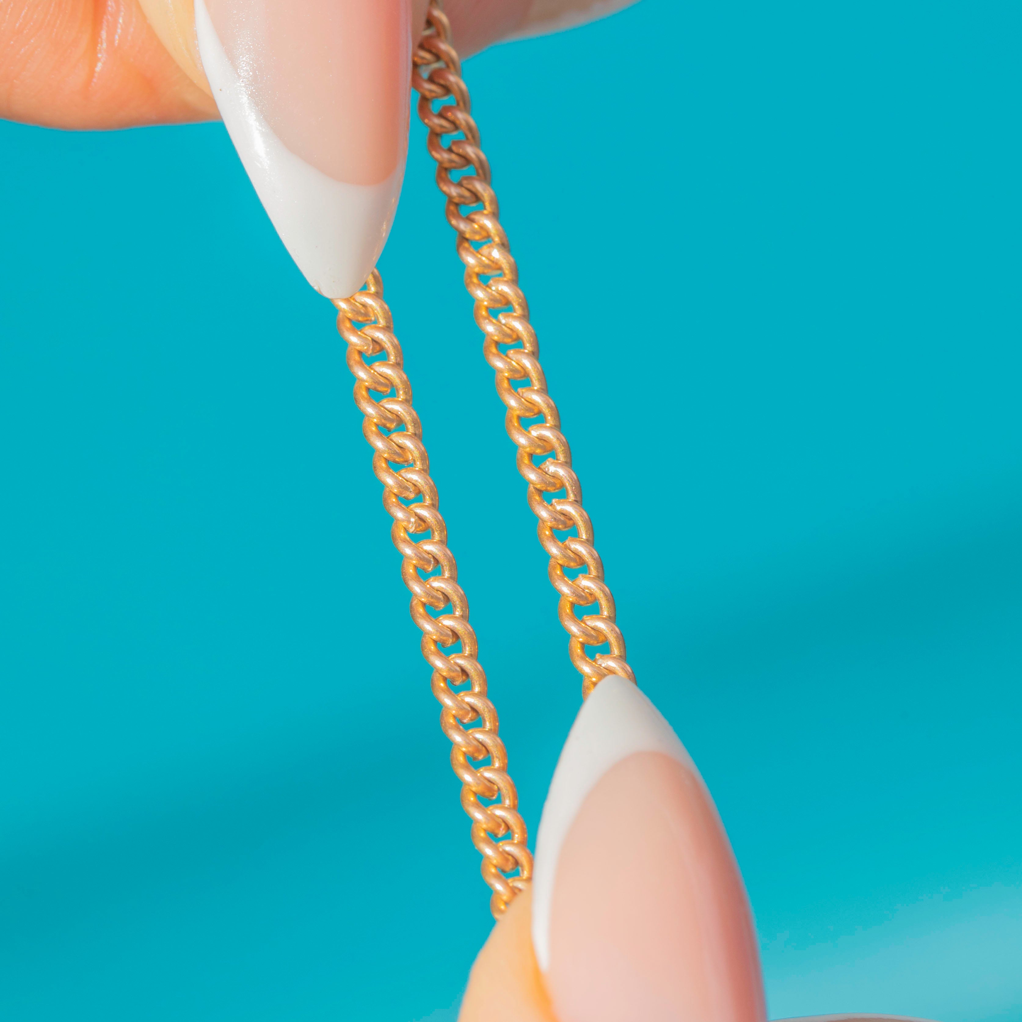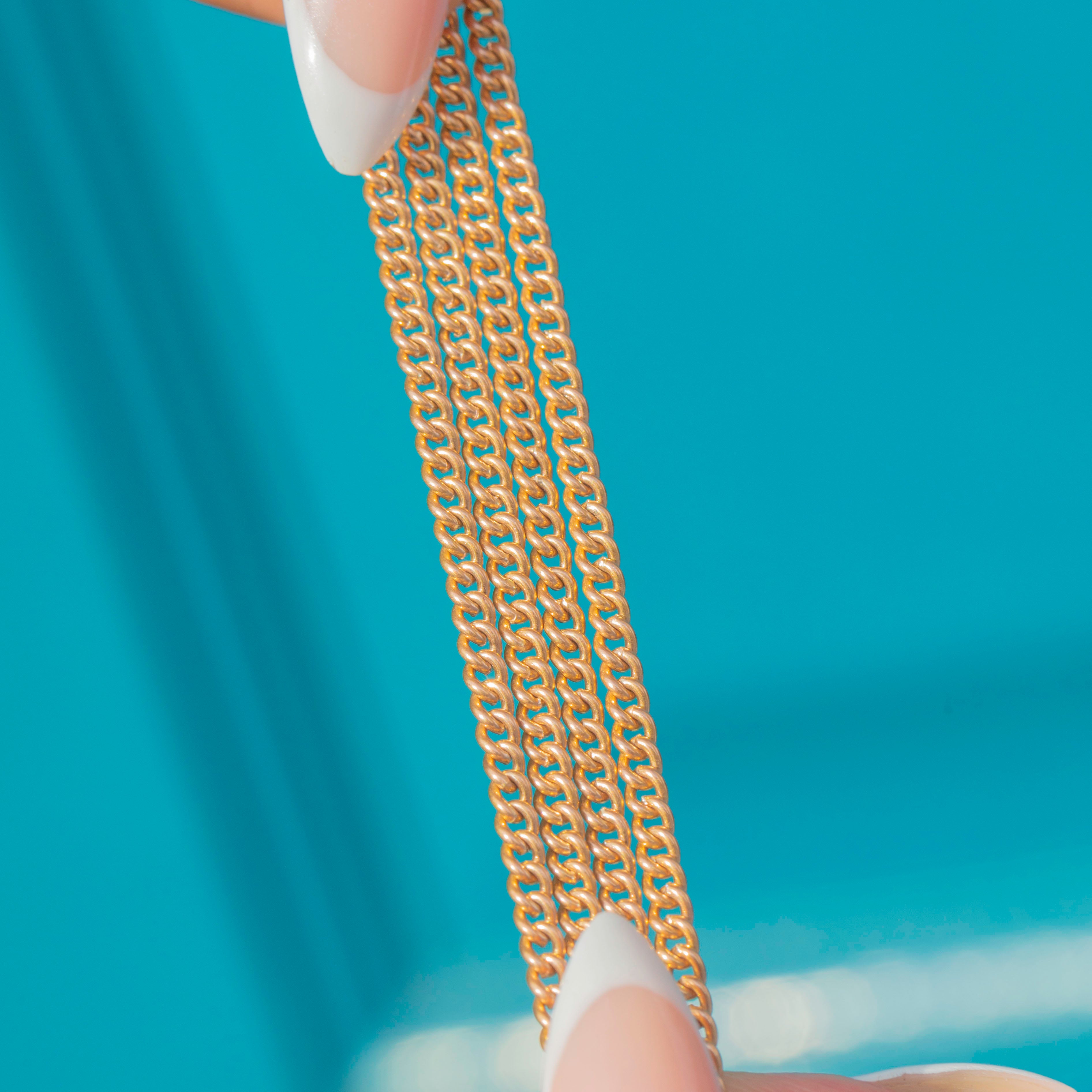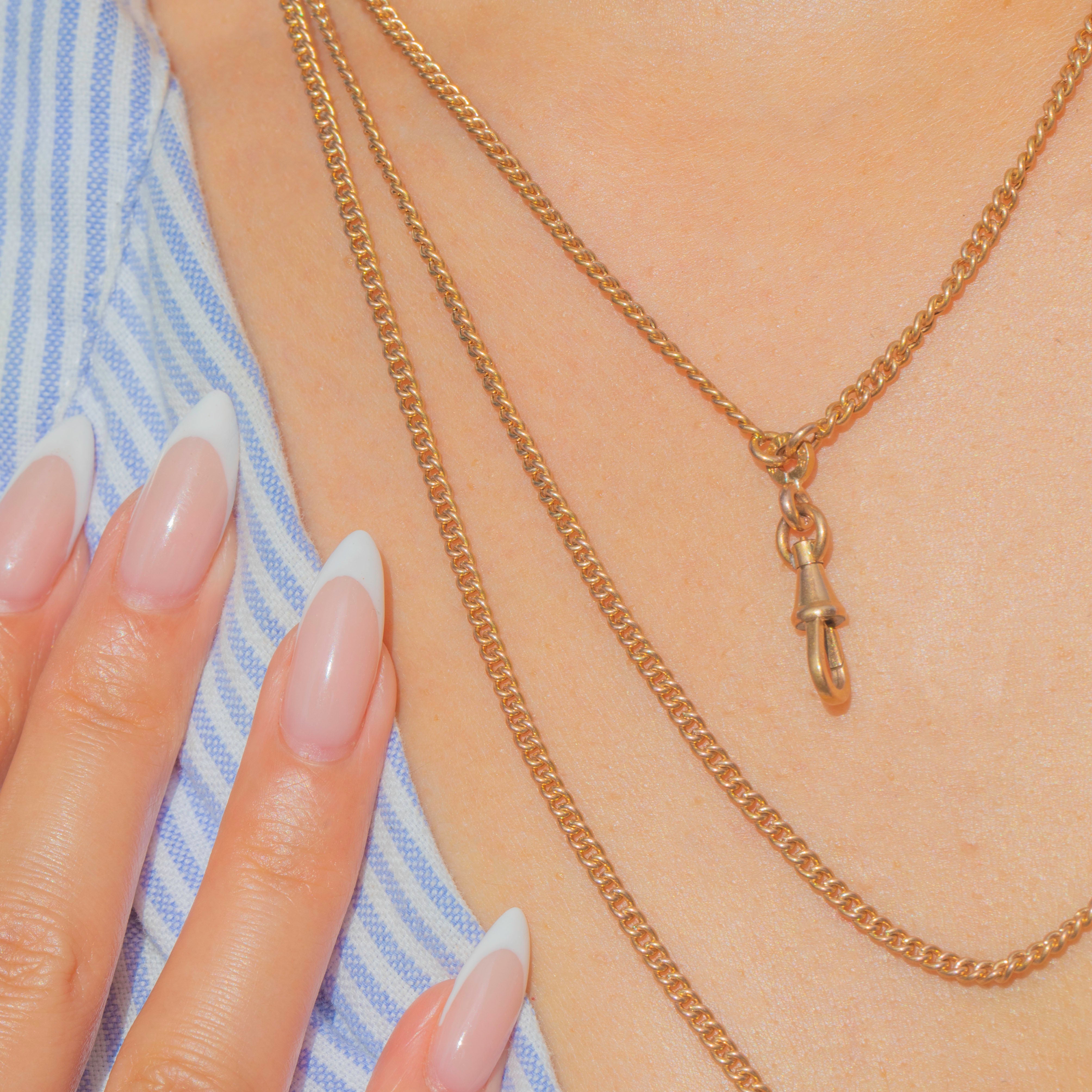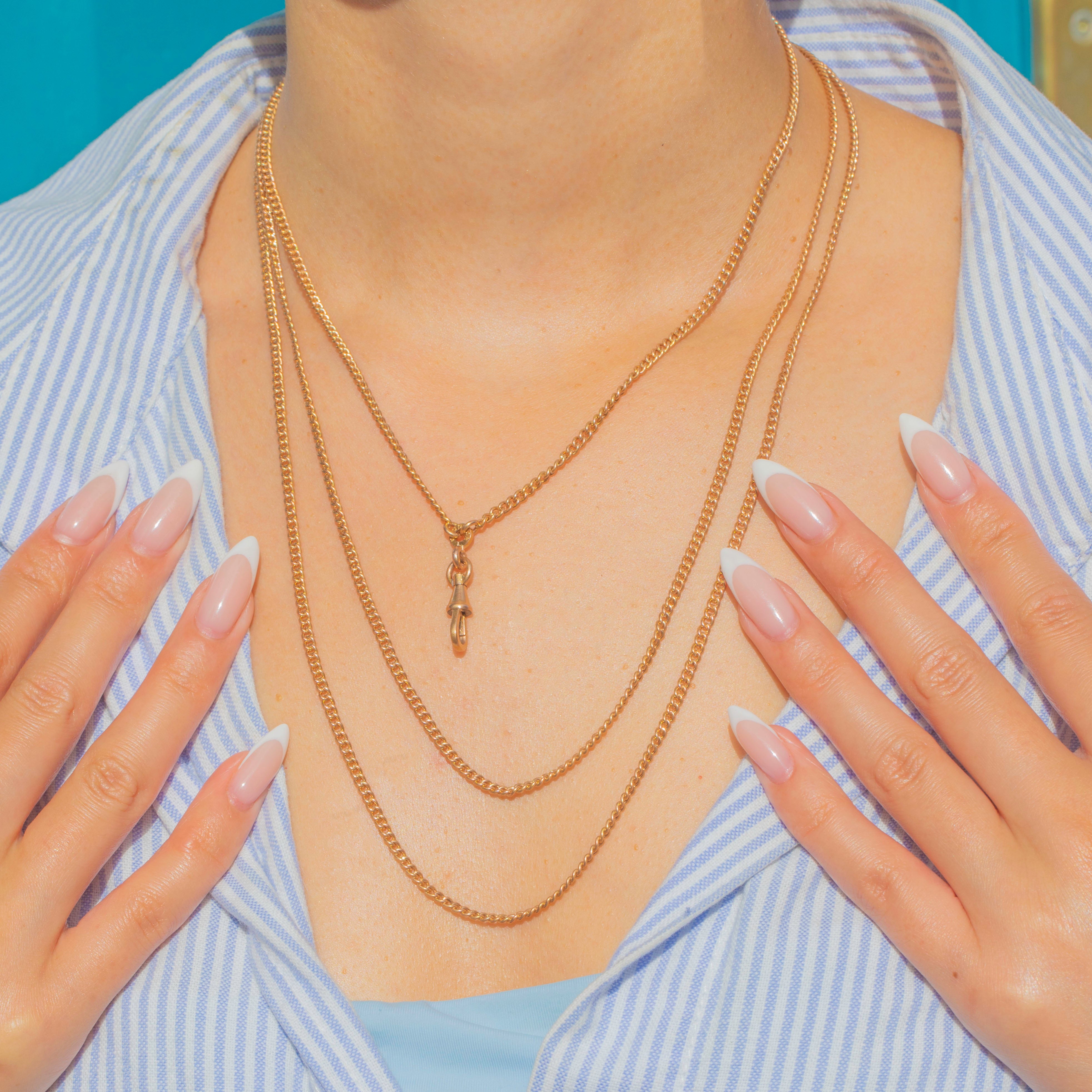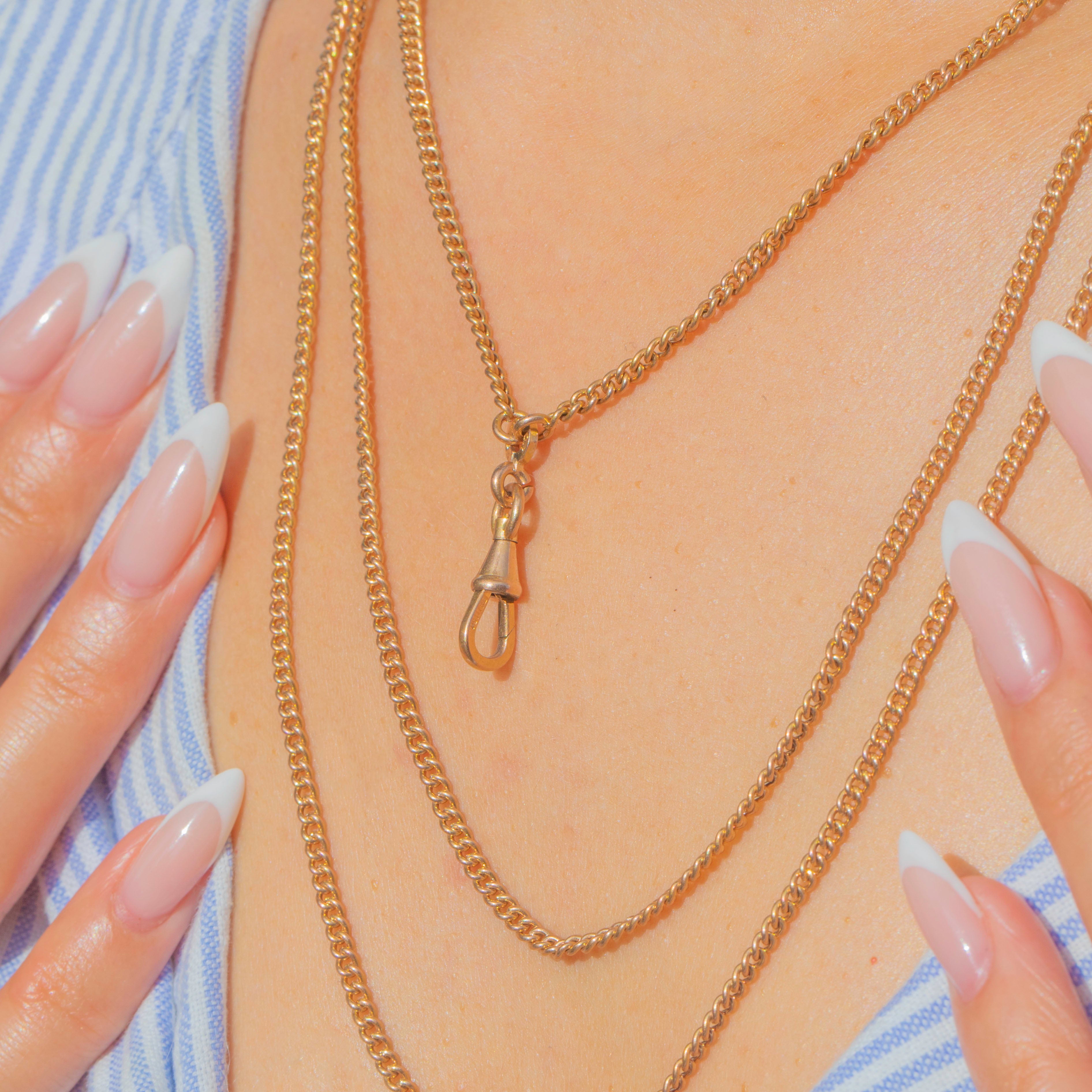 An elegant French longuard chain with its original dog-clip, richly finished in 18ct Gold plating. The links have a lovely rosy hue and fluid drape, making it perfect to wear long, doubled, or styled with charms and lockets on the generous bolt end.