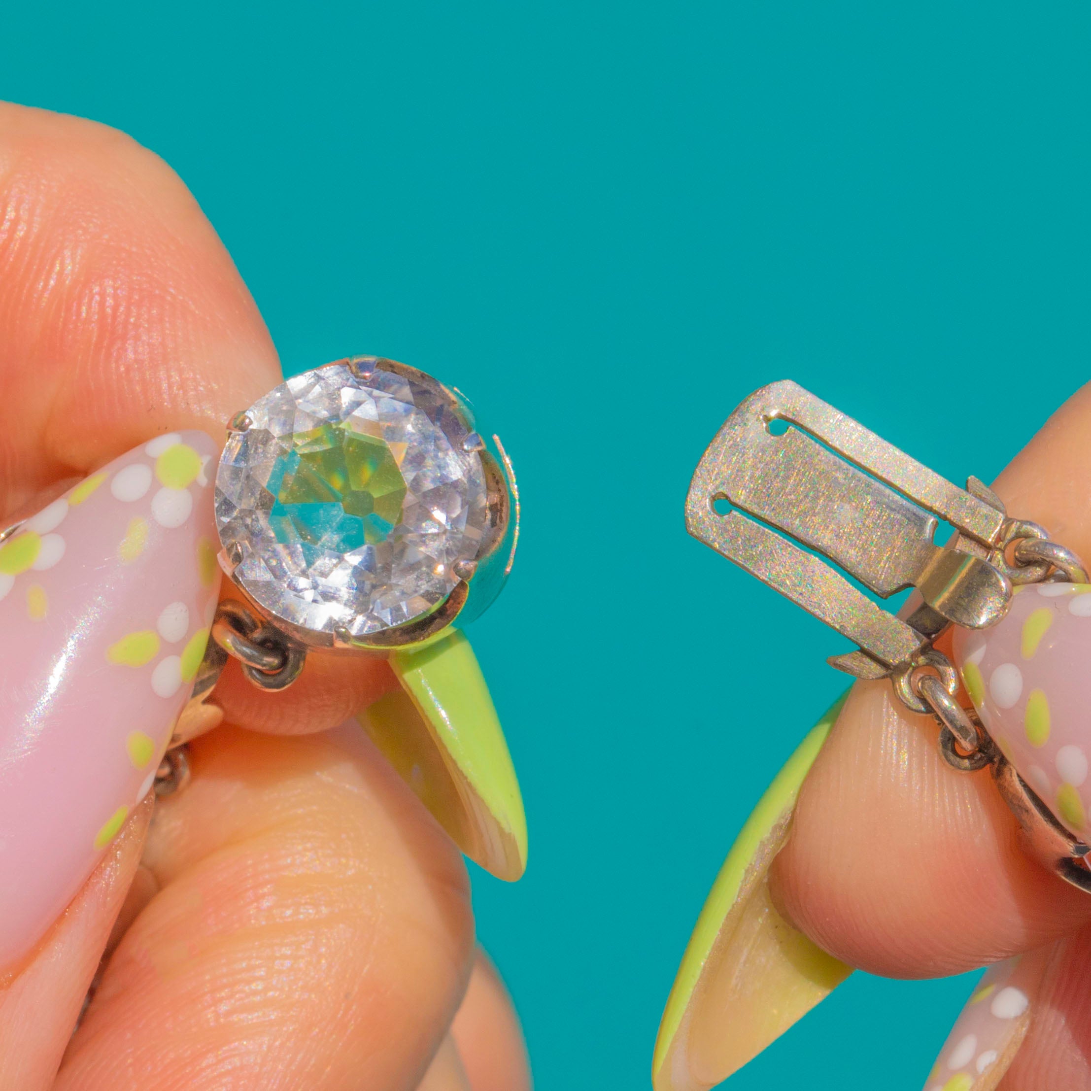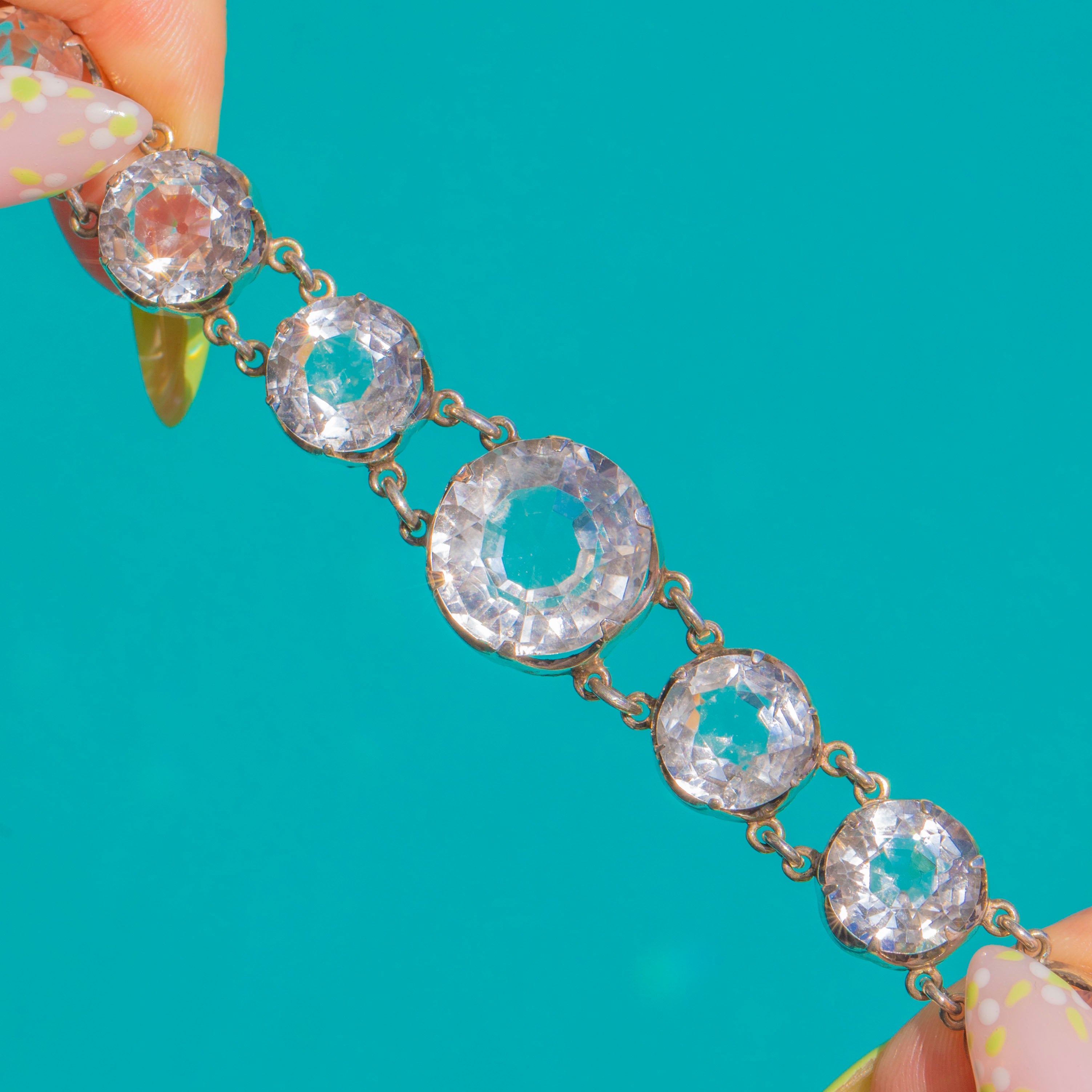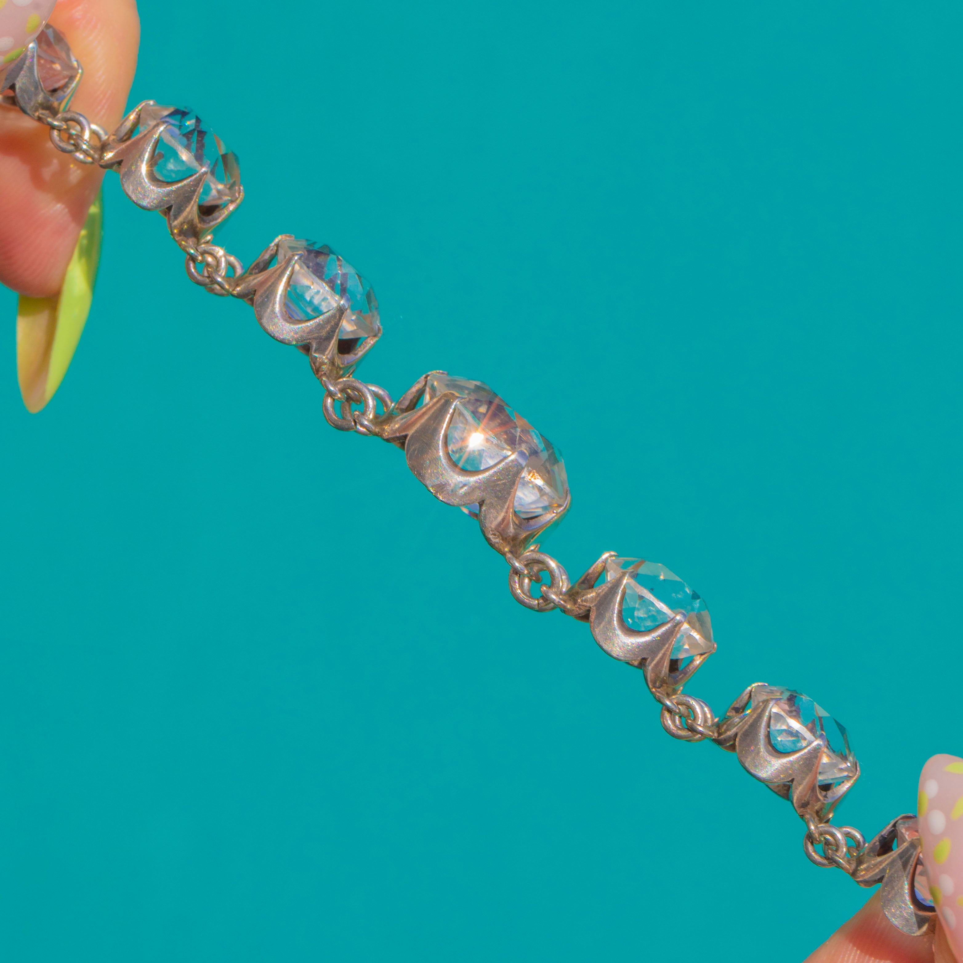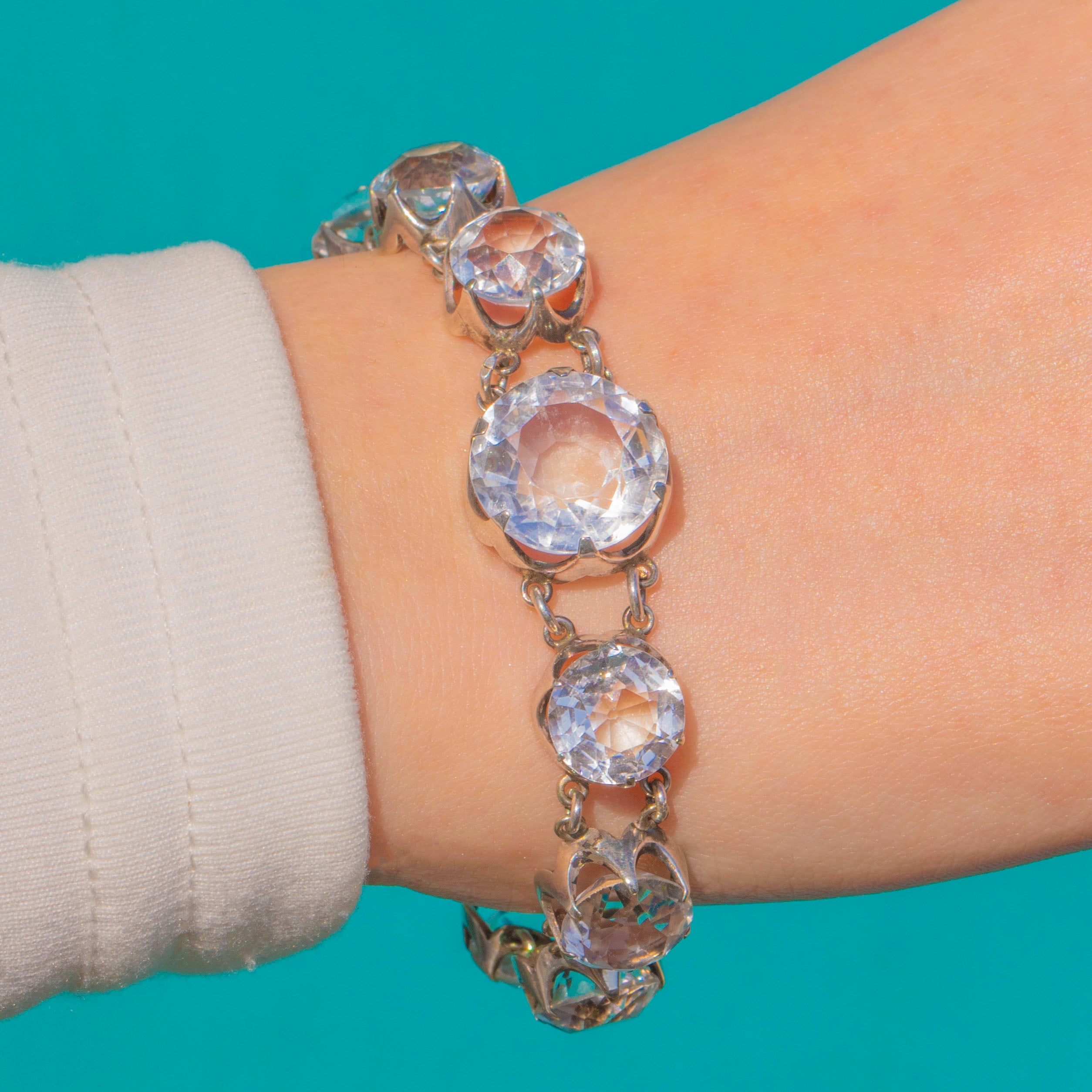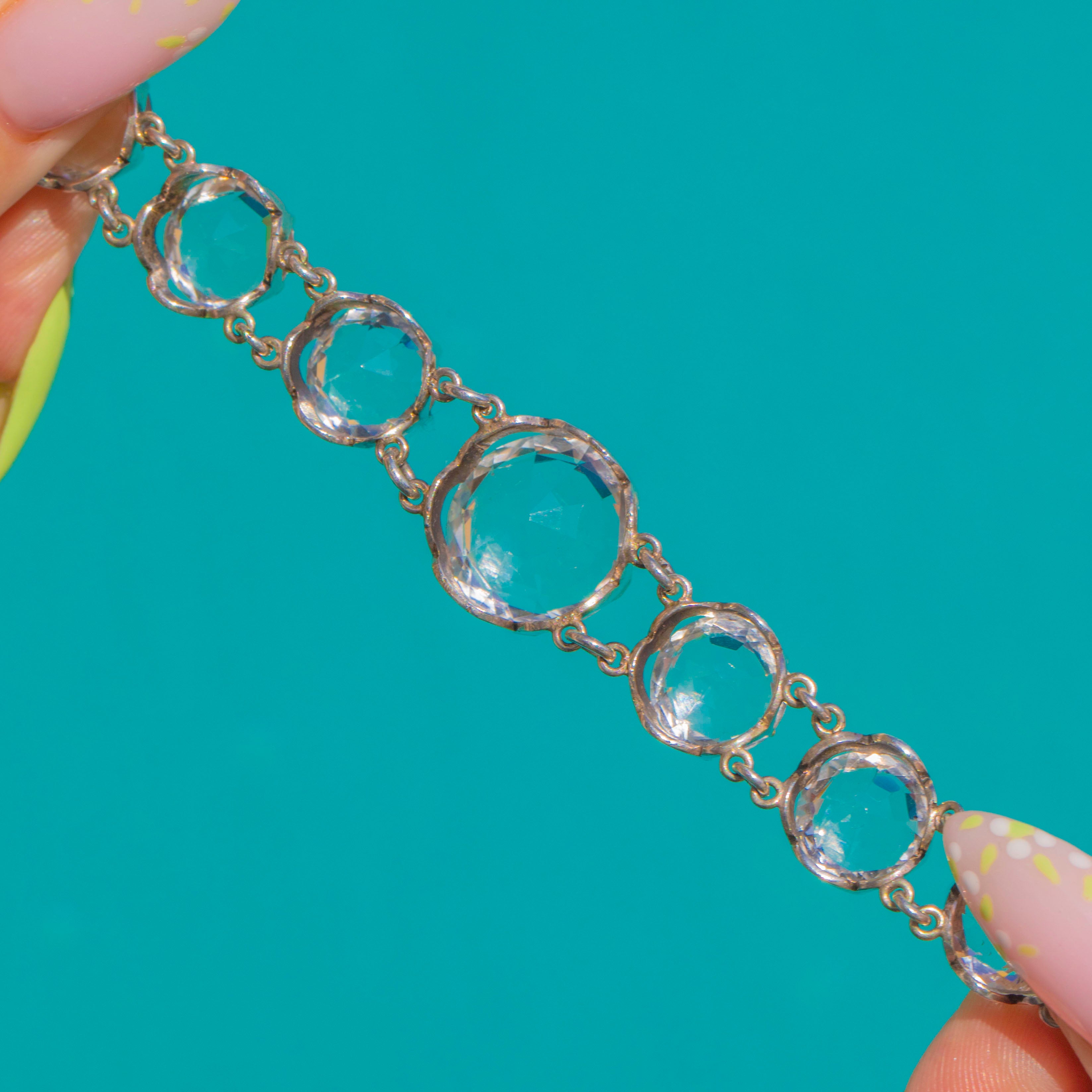 EXCELLENT: Rock Crystals are bright and secure with no noticeable chips or abrasions. Sterling Silver settings and links are well-preserved with minimal surface wear and a gentle patina commensurate with age. No signs of repair; the articulation is sound and ready to wear.