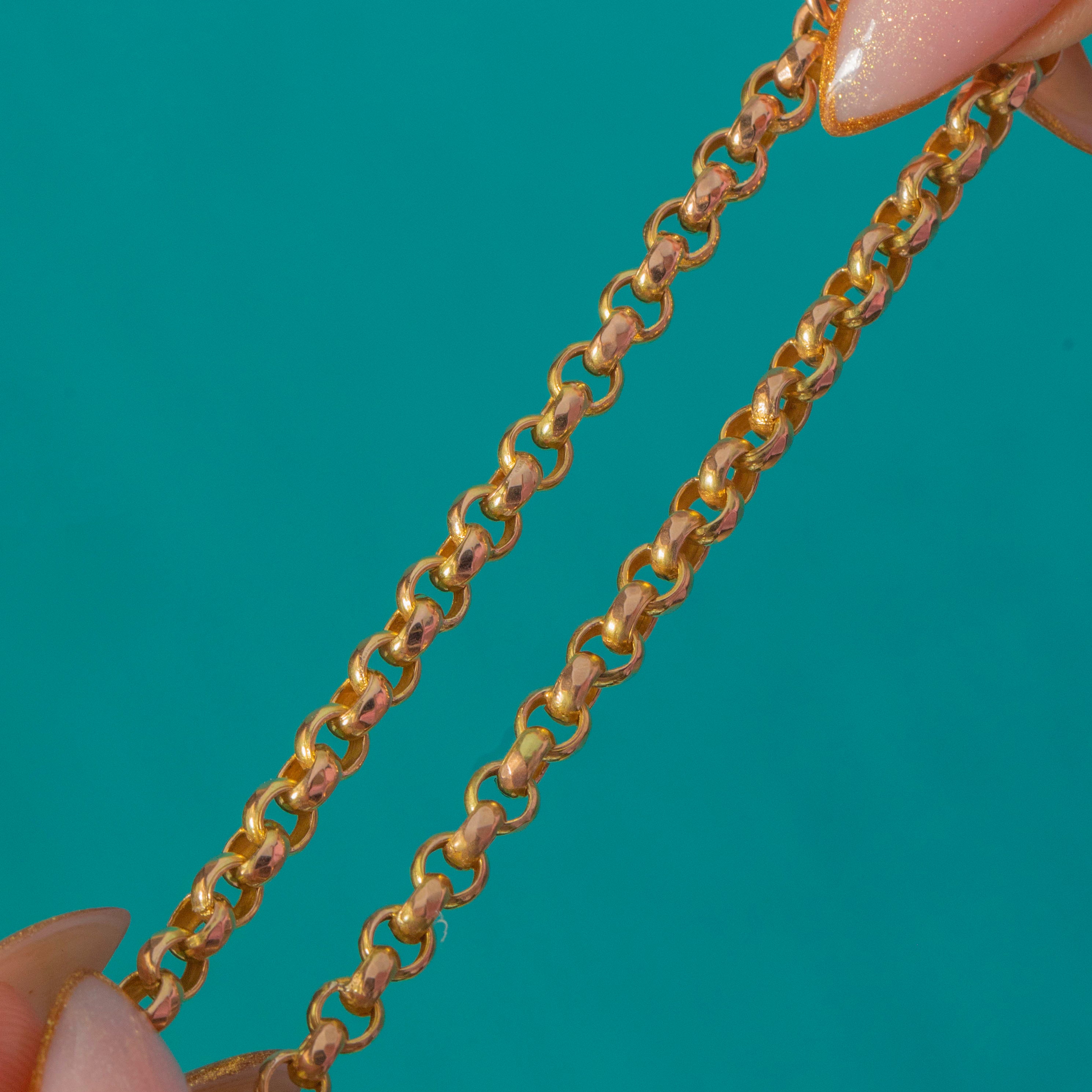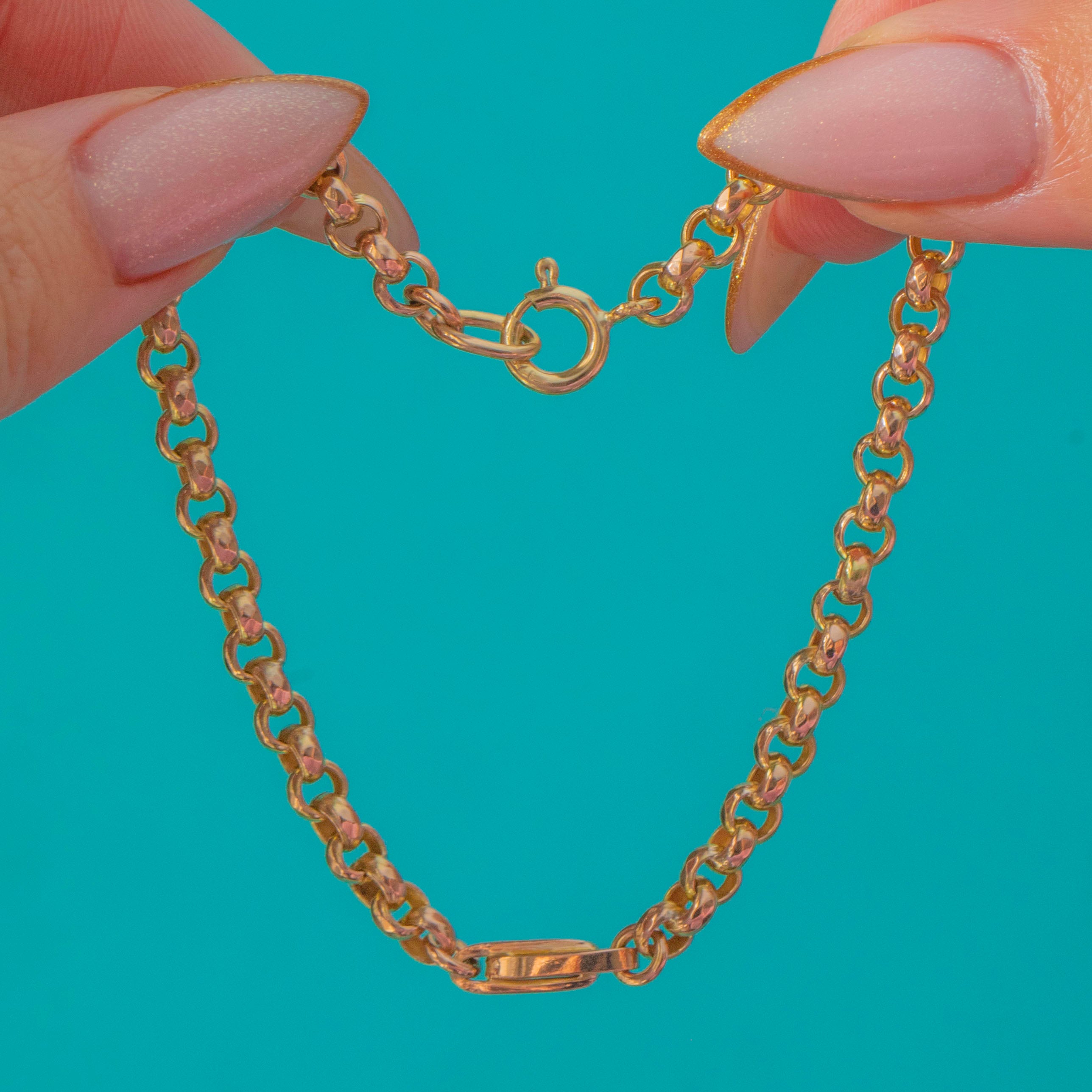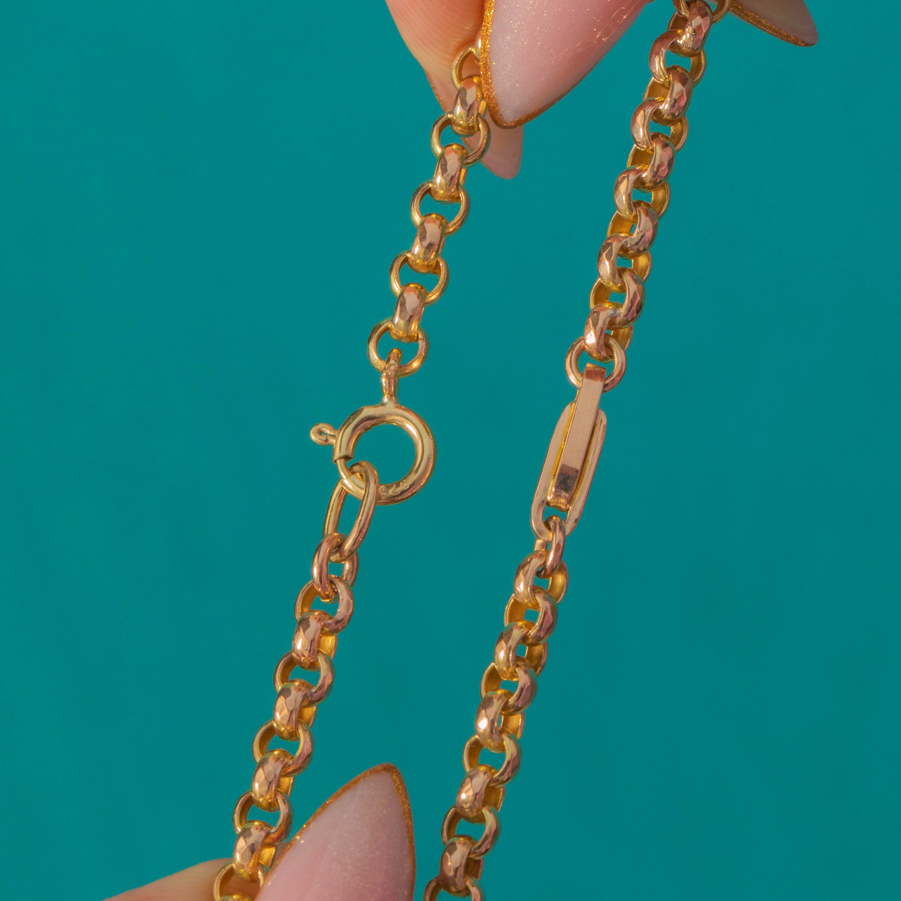 Its unique link design gives a lovely sense of rhythm and movement, catching the light beautifully on the wrist. Completed with a later 9ct Gold bolt-ring clasp stamped “375”, this bracelet is a timeless and versatile antique piece that layers effortlessly with other Gold treasures.