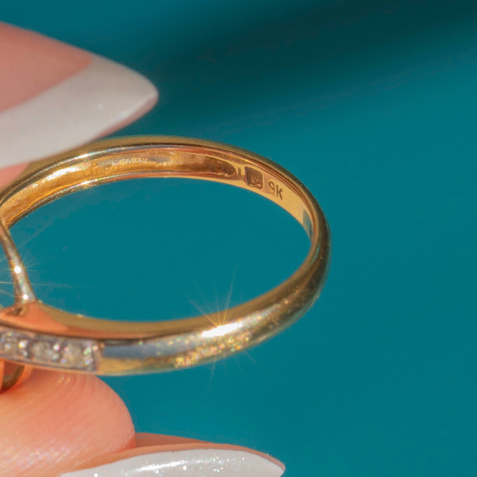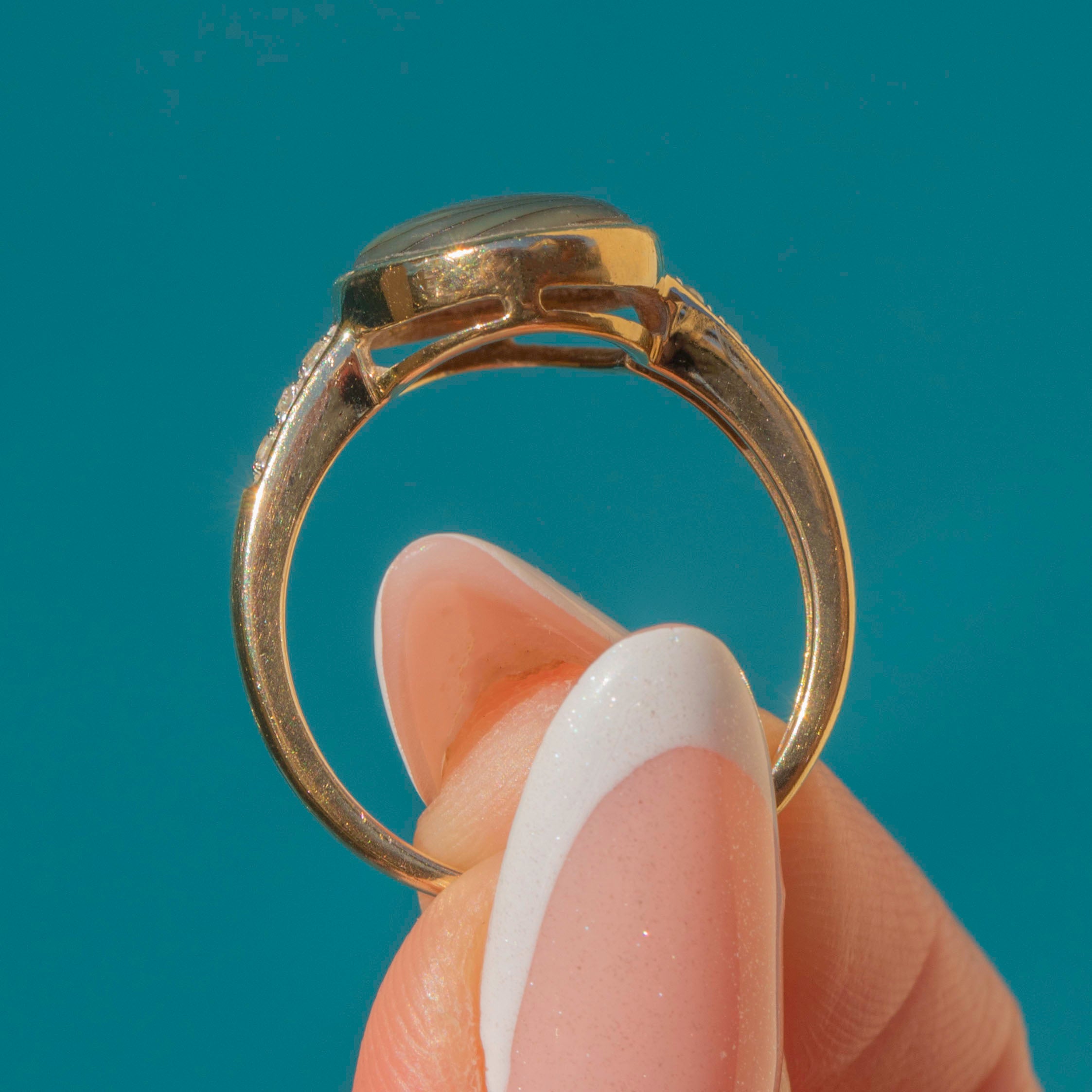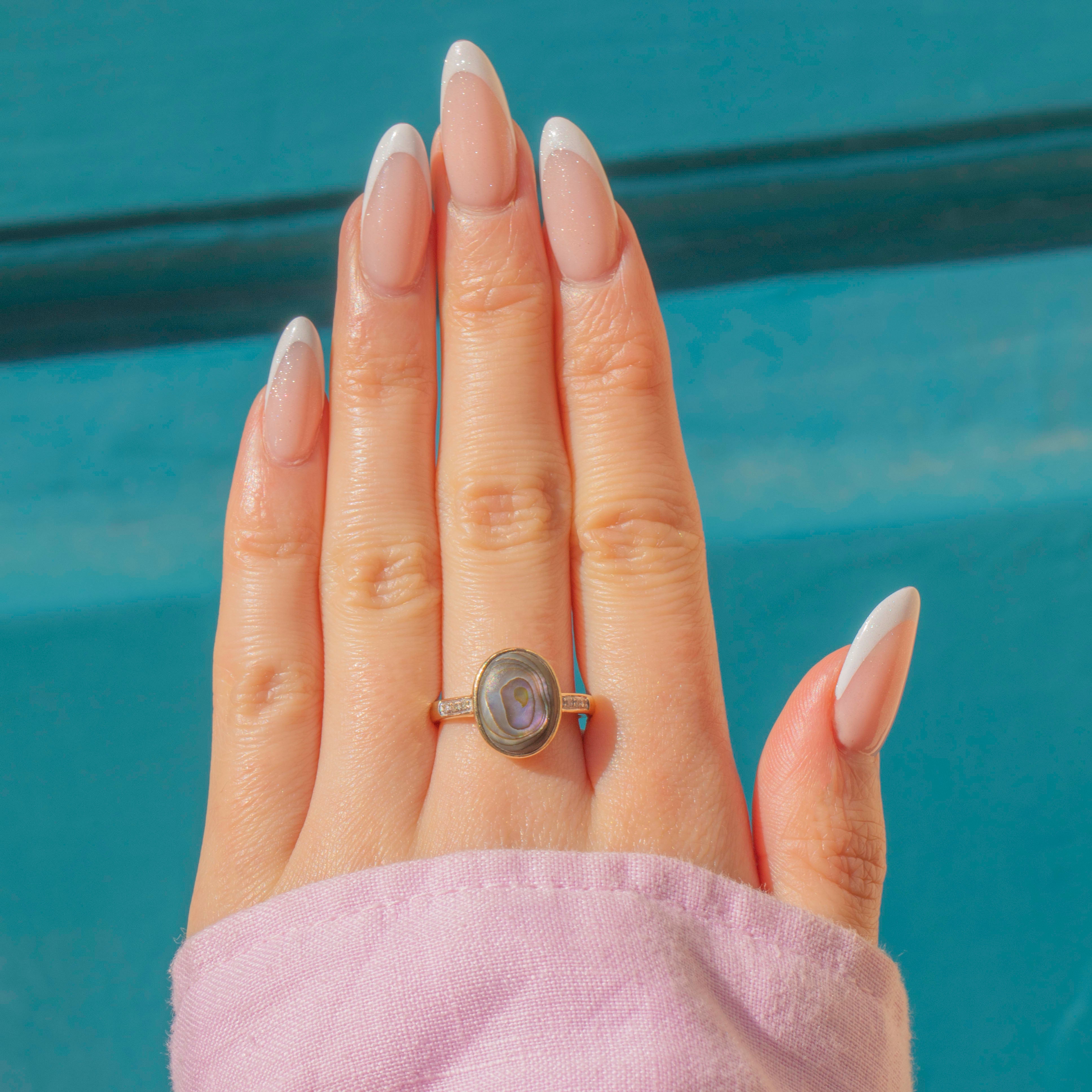 EXCELLENT: With very little to report, this 9ct Gold Abalone Shell Diamond ring is in excellent condition. Her Abalone is in near-perfect condition, with no scratches or dings to note, and the Diamonds are all present and securely set. With smooth, bright 9ct Gold, simply pop her on your finger and you'll never want to take her off!