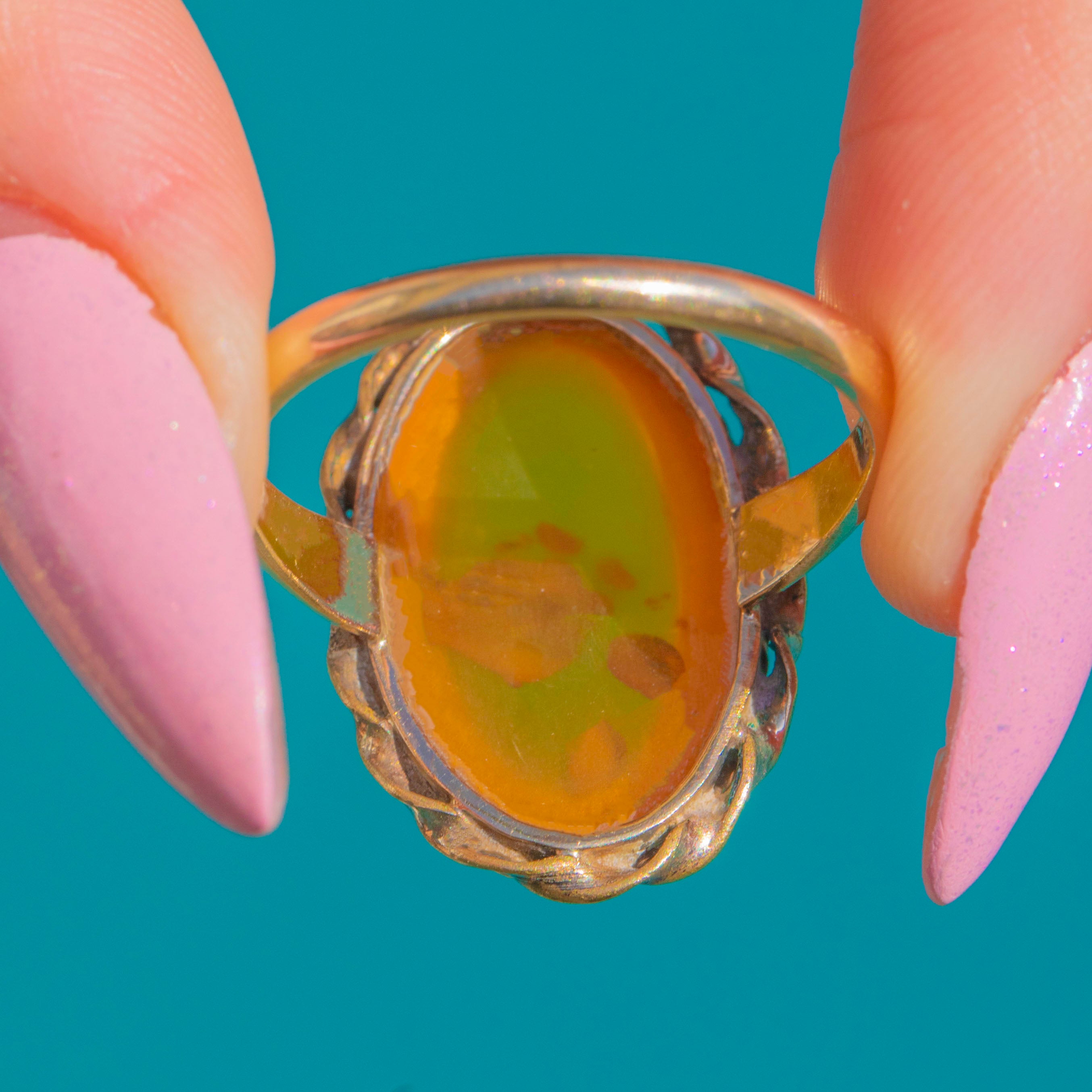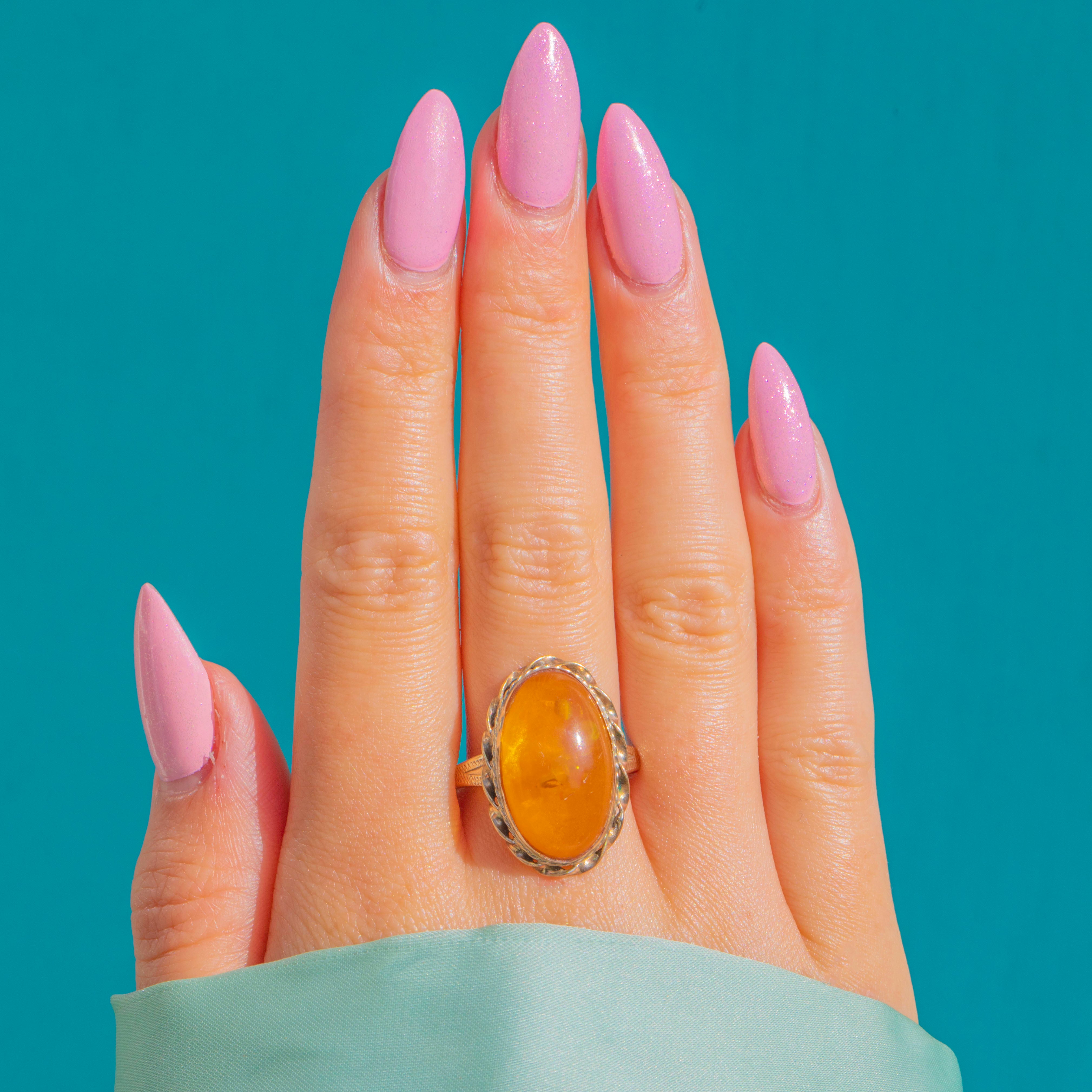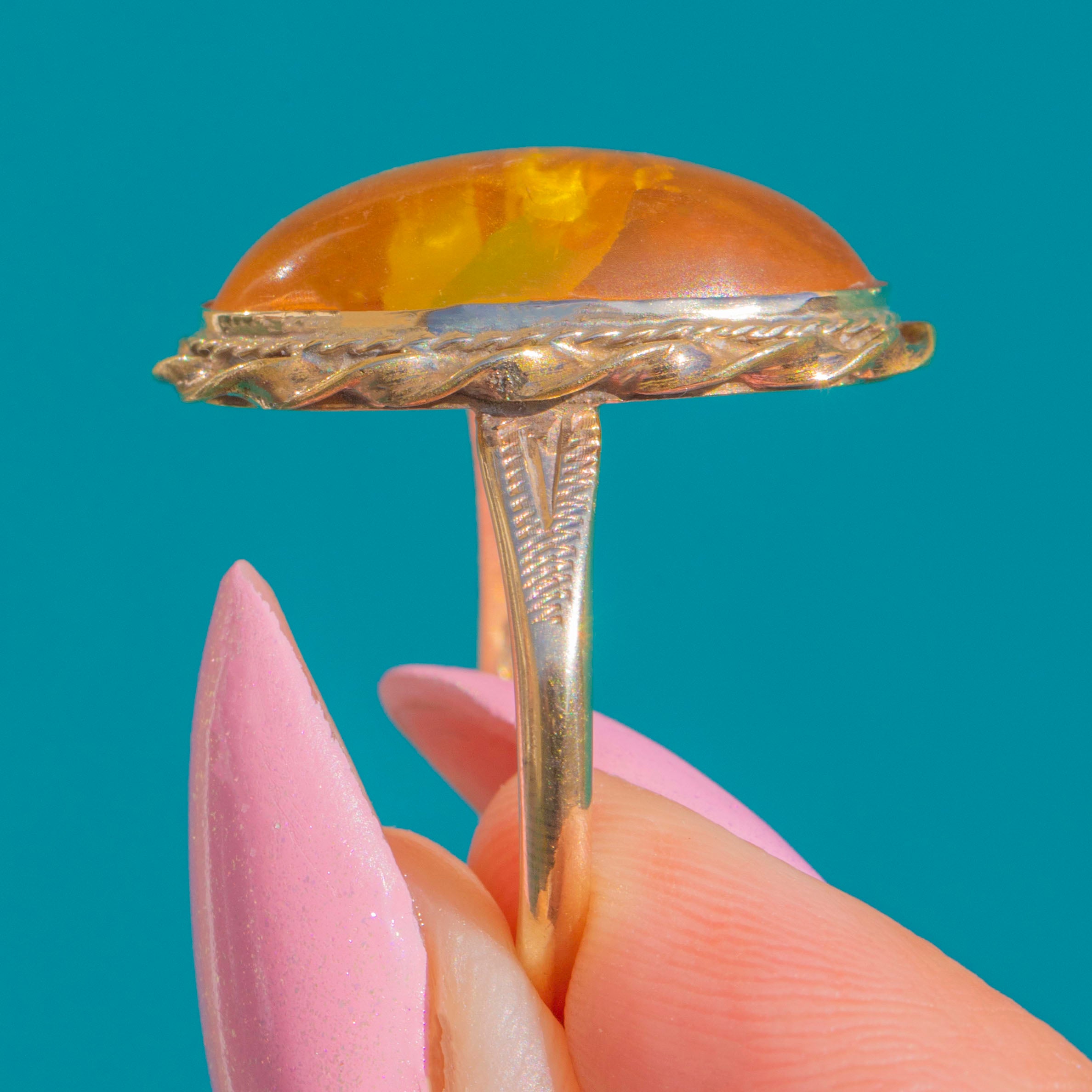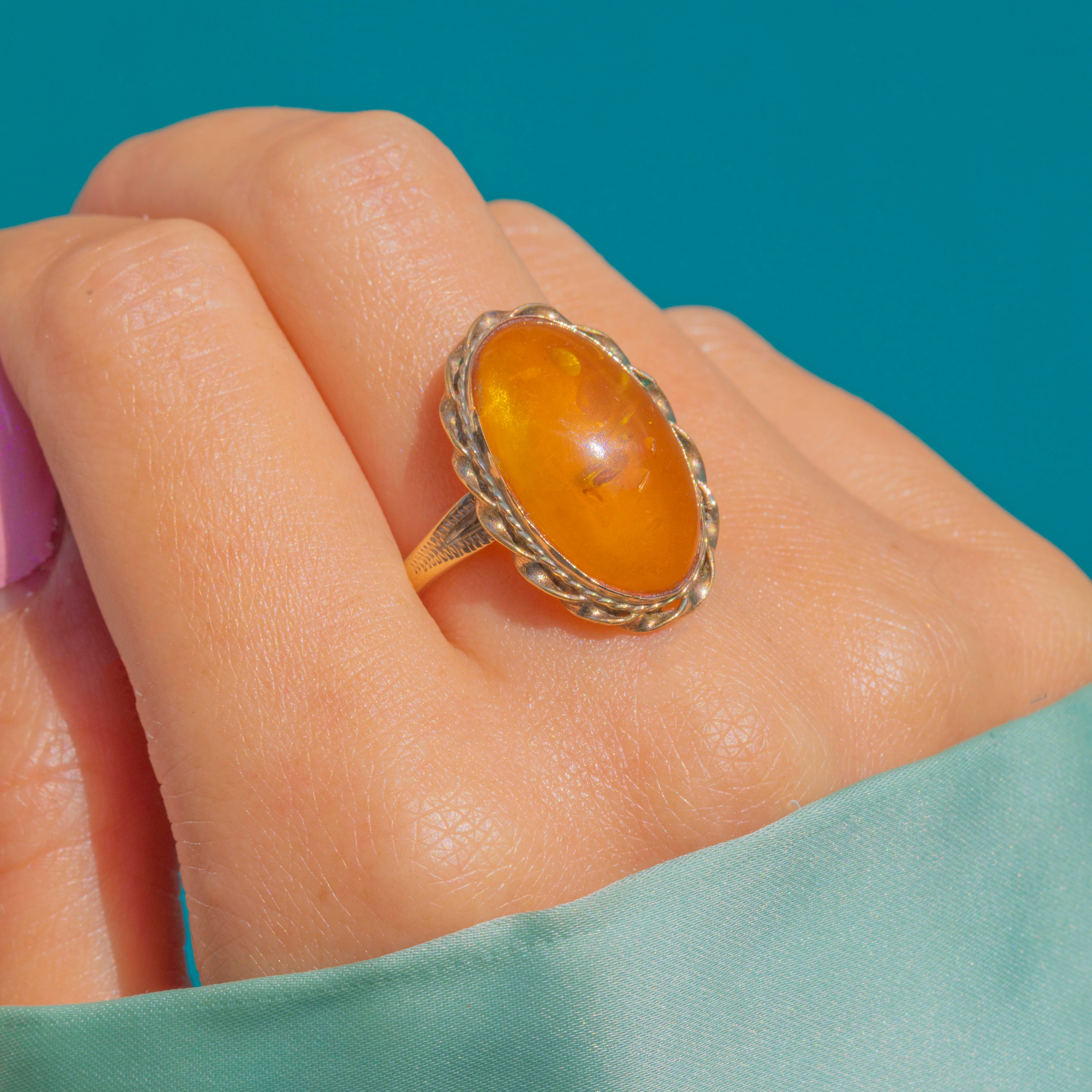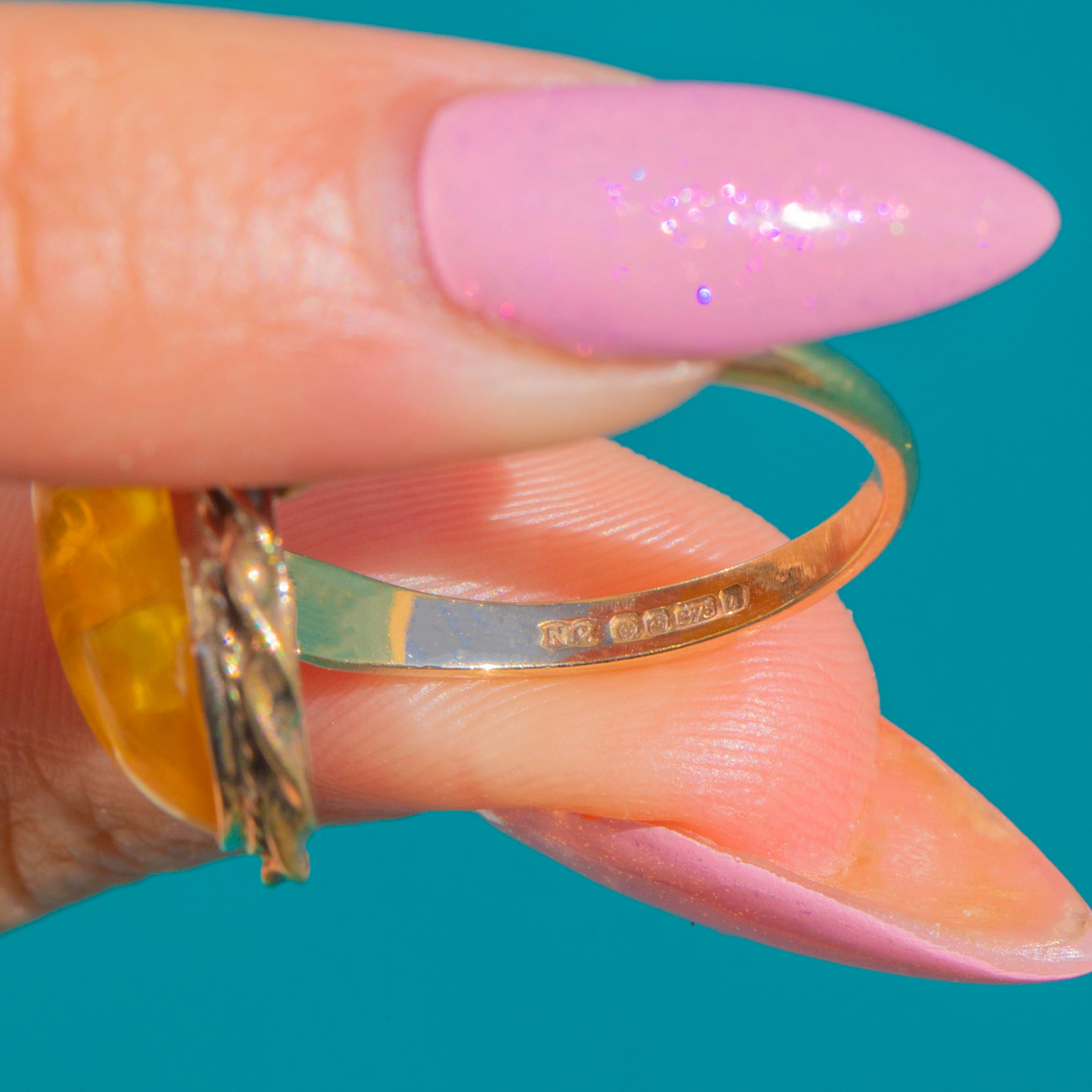 A bold Vintage statement, this 9ct Gold cocktail ring centres a high-domed oval Amber cabochon glowing with warm honey-to-cognac hues. The gem’s translucent body and characteristic internal inclusions give it beautiful depth and movement as it catches the light.
